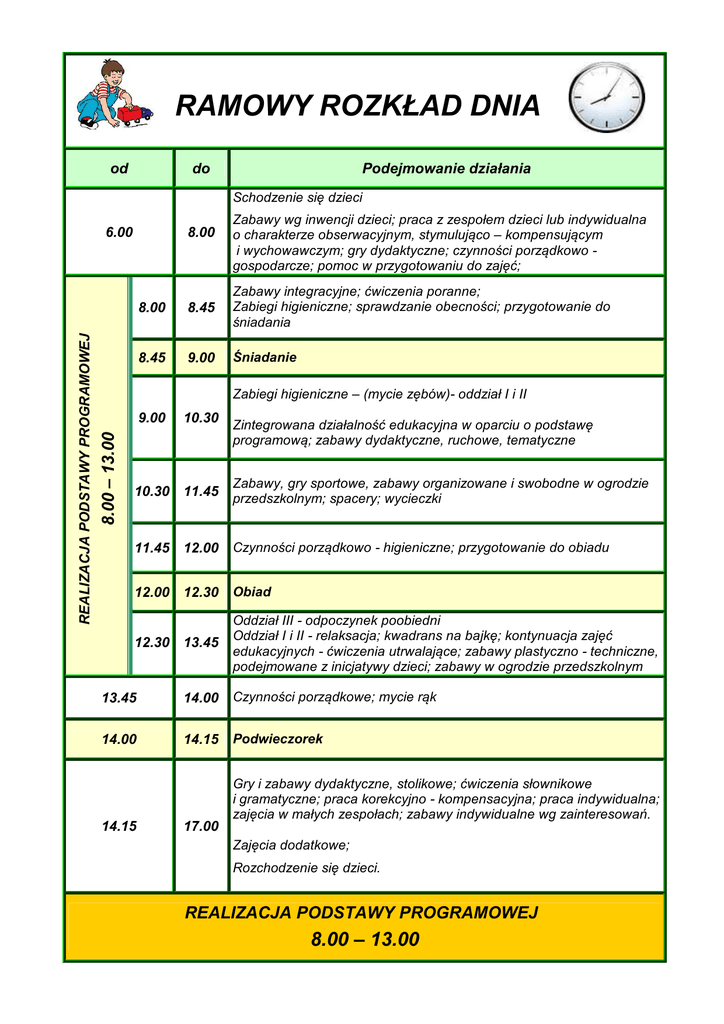 RAMOWY ROZKŁAD DNIA od do Podejmowanie działania Schodzenie się dzieci 8.00 Zabawy wg inwencji dzieci; praca z zespołem dzieci lub indywidualna o charakterze obserwacyjnym, stymulująco – kompensującym i wychowawczym; gry dydaktyczne; czynności porządkowo gospodarcze; pomoc w przygotowaniu do zajęć; 8.00 8.45 Zabawy integracyjne; ćwiczenia poranne; Zabiegi higieniczne; sprawdzanie obecności; przygotowanie do śniadania 8.45 9.00 Śniadanie Zabiegi higieniczne – (mycie zębów)- oddział I i II 9.00 8.00 – 13.00 REALIZACJA PODSTAWY PROGRAMOWEJ 6.00 10.30 Zintegrowana działalność edukacyjna w oparciu o podstawę programową; zabawy dydaktyczne, ruchowe, tematyczne 10.30 11.45 Zabawy, gry sportowe, zabawy organizowane i swobodne w ogrodzie przedszkolnym; spacery; wycieczki 11.45 12.00 Czynności porządkowo - higieniczne; przygotowanie do obiadu 12.00 12.30 Obiad 12.30 13.45 Oddział III - odpoczynek poobiedni Oddział I i II - relaksacja; kwadrans na bajkę; kontynuacja zajęć edukacyjnych - ćwiczenia utrwalające; zabawy plastyczno - techniczne, podejmowane z inicjatywy dzieci; zabawy w ogrodzie przedszkolnym 13.45 14.00 Czynności porządkowe; mycie rąk 14.00 14.15 Podwieczorek 14.15 17.00 Gry i zabawy dydaktyczne, stolikowe; ćwiczenia słownikowe i gramatyczne; praca korekcyjno - kompensacyjna; praca indywidualna; zajęcia w małych zespołach; zabawy indywidualne wg zainteresowań. Zajęcia dodatkowe; Rozchodzenie się dzieci. REALIZACJA PODSTAWY PROGRAMOWEJ 8.00 – 13.00