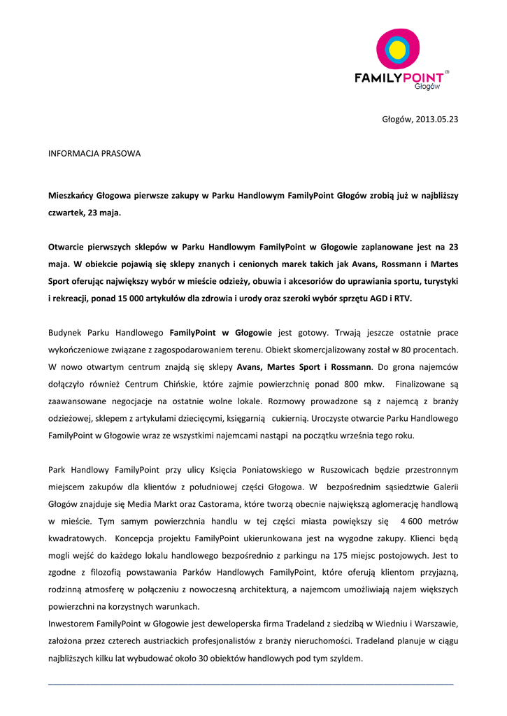 Głogów, 2013.05.23 INFORMACJA PRASOWA Mieszkańcy Głogowa pierwsze zakupy w Parku Handlowym FamilyPoint Głogów zrobią już w najbliższy czwartek, 23 maja. Otwarcie pierwszych sklepów w Parku Handlowym FamilyPoint w Głogowie zaplanowane jest na 23 maja. W obiekcie pojawią się sklepy znanych i cenionych marek takich jak Avans, Rossmann i Martes Sport oferując największy wybór w mieście odzieży, obuwia i akcesoriów do uprawiania sportu, turystyki i rekreacji, ponad 15 000 artykułów dla zdrowia i urody oraz szeroki wybór sprzętu AGD i RTV. Budynek Parku Handlowego FamilyPoint w Głogowie jest gotowy. Trwają jeszcze ostatnie prace wykończeniowe związane z zagospodarowaniem terenu. Obiekt skomercjalizowany został w 80 procentach. W nowo otwartym centrum znajdą się sklepy Avans, Martes Sport i Rossmann. Do grona najemców dołączyło również Centrum Chińskie, które zajmie powierzchnię ponad 800 mkw. Finalizowane są zaawansowane negocjacje na ostatnie wolne lokale. Rozmowy prowadzone są z najemcą z branży odzieżowej, sklepem z artykułami dziecięcymi, księgarnią cukiernią. Uroczyste otwarcie Parku Handlowego FamilyPoint w Głogowie wraz ze wszystkimi najemcami nastąpi na początku września tego roku. Park Handlowy FamilyPoint przy ulicy Księcia Poniatowskiego w Ruszowicach będzie przestronnym miejscem zakupów dla klientów z południowej części Głogowa. W bezpośrednim sąsiedztwie Galerii Głogów znajduje się Media Markt oraz Castorama, które tworzą obecnie największą aglomerację handlową w mieście. Tym samym powierzchnia handlu w tej części miasta powiększy się 4 600 metrów kwadratowych. Koncepcja projektu FamilyPoint ukierunkowana jest na wygodne zakupy. Klienci będą mogli wejść do każdego lokalu handlowego bezpośrednio z parkingu na 175 miejsc postojowych. Jest to zgodne z filozofią powstawania Parków Handlowych FamilyPoint, które oferują klientom przyjazną, rodzinną atmosferę w połączeniu z nowoczesną architekturą, a najemcom umożliwiają najem większych powierzchni na korzystnych warunkach. Inwestorem FamilyPoint w Głogowie jest deweloperska firma Tradeland z siedzibą w Wiedniu i Warszawie, założona przez czterech austriackich profesjonalistów z branży nieruchomości. Tradeland planuje w ciągu najbliższych kilku lat wybudować około 30 obiektów handlowych pod tym szyldem. _______________________________________________________________________________________ Informacje dodatkowe Inwestor Tradeland Development to wiedeńsko - warszawska firma deweloperska, założona przez czterech austriackich profesjonalistów długoletnim doświadczeniem na rynku deweloperskim w Austrii oraz CEE. Firma koncentruje się na realizowaniu inwestycji na rynku centrów handlowych. Projektowane i budowane wysokiej jakości obiekty handlowe pod marką Family Point w Polsce wspierają rozwój i ekspansję sieci handlowych na rynku polskim. Zatrudniając doświadczonych ekspertów firma wspiera rozwój inwestycji na każdym jej etapie spełniając wymagania rynku. Pracowania architektoniczna Studio Architektoniczne Ozone zajmuje się projektowaniem obiektów kubaturowych w zakresie architektury oraz pozostałych branż, nadzorem autorskim oraz project management. Generalny wykonawca Generalnym wykonawcą inwestycji Family Point w Głogowie była firma Skanska. Skanska jest liderem polskiej branży budowlanej. Wykonuje obiekty kubaturowe, drogowe, mostowe, kolejowe i hydroinżynieryjne. Działa jako deweloper i realizuje projekty z zakresu Partnerstwa Publiczno-Prywatnego. Skanska posiada bogate doświadczenie w realizacji obiektów handlowo – usługowych na terenie całej Polski. Była generalnym wykonawcą takich inwestycji jak np. Złote Tarasy czy centrum handlowe Promenada w Warszawie, Park Handlowy Bielany koło Wrocławia. Wybudowała także m.in. Centrum Zaopatrzenia Hurtowego Makro w Rzeszowie, galerie handlowe w Poznaniu, Kaliszu, Koninie. Wykonała wiele obiektów dla takich klientów jak Auchan, Tesco, Lidl czy Leroy Merlin. Miasto Głogów Miasto Głogów usytuowane jest w zachodniej Polsce, w północnej części województwa dolnośląskiego. Prawie w całości miasto położone jest na lewym brzegu rzeki Odry. Licząc 70 000 mieszkańców jest szóstym co do wielkości miastem w województwie. Miasto położone jest na obszarze Legnicko-Głogowskiego Okręgu Miedziowego. Więcej informacji Biuro Prasowe: Małek Media, Jolanta Gałązka tel. 725 250 197, mail: [email protected] www.familypoint.pl _______________________________________________________________________________________