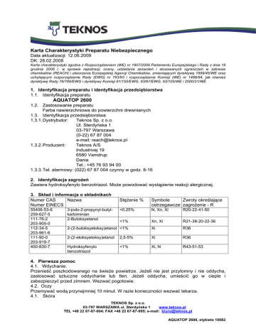 Karta Charakterystyki Preparatu Niebezpiecznego Data aktualizacji: 12.06.2009 DK: 28.02.2008 Karta charakterystyki zgodna z Rozporządzeniem (WE) nr 1907/2006 Parlamentu Europejskiego i Rady z dnia 18 grudnia 2006 r. w sprawie rejestracji, oceny, udzielania zezwoleń i stosowanych ograniczeń w zakresie chemikaliów (REACH) i utworzenia Europejskiej Agencji Chemikaliów, zmieniającym dyrektywę 1999/45/WE oraz uchylającym rozporządzenie Rady (EWG) nr 793/93 i rozporządzenie Komisji (WE) nr 1488/94, jak również dyrektywę Rady 76/769/EWG i dyrektywy Komisji 91/155/EWG, 93/67/EWG, 93/105/WE i 2000/21/WE 1. Identyfikacja preparatu i identyfikacja przedsiębiorstwa 1.1. Identyfikacja preparatu AQUATOP 2600 1.2. Zastosowanie preparatu Farba nawierzchniowa do powierzchni drewnianych 1.3. Identyfikacja przedsiębiorstwa 1.3.1. Dystrybutor: Teknos Sp. z o.o. Ul. Sterdyńska 1 03-797 Warszawa (0-22) 67 87 004 e-mail: [email protected] 1.3.2. Producent: Teknos A/S Industrivej 19 6580 Vamdrup Dania Tel.: +45 76 93 94 00 1.3.3. Tel. alarmowy: (022) 67 87 004 czynny w godz. 8-16 2. Identyfikacja zagrożeń Zawiera hydroksyfenylo benzotriazol. Może powodować wystąpienie reakcji alergicznej. 3. Skład i informacja o składnikach Numer CAS Nazwa Numer EINECS 55406-53-6 259-627-5 111-76-2 203-905-0 112-34-5 203-961-6 111-90-0 203-919-7 400-830-7 Stężenie % Symbole Zwroty określające ostrzegawcze zagrożenie - R <0,25% N, Xn, Xi R20-22-41-50 <1% Xn, Xi R21-38-20-22-36 2-(2-butoksyetoksy)etanol <1% Xi R36 2-(2-etoksyetoksy)etanol 2,5-5% Xi R36 Hydroksyfenylo benzotriazol <1% Xi, N R43-51-53 3-jodo-2-propynyl-butylkarbiminian 2-Butoksyetanol 4. Pierwsza pomoc 4.1. Wdychanie: Przenieść poszkodowanego na świeże powietrze. Jeżeli nie jest przytomny i nie oddycha, zastosować sztuczne oddychanie lub tlen. Jeżeli oddycha, umieścić go w cieple i zabezpieczyć przed zimnem. Wezwać pogotowie. 4.2. Oczy Przemywać wodą przynajmniej 10 minut. W razie konieczności wezwać lekarza. 4.1. Skóra TEKNOS Sp. z o.o. 03-797 WARSZAWA ul. Sterdyńska 1 www.teknos.pl TEL +48 22 67-87-004; FAX +48 22 67-87-995; e-mail: [email protected] AQUATOP 2600, etykieta 10082 Usunąć natychmiast zanieczyszczoną odzież, a skórę przemyć wodą z mydłem i nałożyć krem. Mogą być stosowane środki do mycia skóry. Nie używać rozpuszczalnika, ponieważ odtłuszcza skórę. 4.4. Połknięcie Pić wodę lub mleko. Nie prowokować wymiotów. Jeżeli występują wymioty, spuścić głowę by nie spowodować zakrztuszenia. 5. Postępowanie w przypadku pożaru Produkt nie jest palny. 6. Postępowanie w przypadku niezamierzonego uwolnienia do środowiska. 6.1. Indywidualne środki ochrony Usunąć występujące źródła zapłonu, zapewnić dobrą wentylację. Unikać wdychania oparów. Patrz poz. 7 i 8 w zakresie obchodzenia się i zabezpieczenia osobistego. Zebrać rozlanie stosując niepalny materiał absorbujący np. granulat, piasek, ziemię i umieścić w pojemnikach na odpady do całkowitego usunięcia według przepisów państwowych (patrz poz.13). 6.2. Środki ochrony środowiska Nie dopuszczać do przedostania się produktu do rzek, wód gruntowych, ziemi, kanalizacji. 6.3. Metody czyszczenia/absorpcji Zebrać rozlany materiał piaskiem lub innym środkiem absorbującym. Zmyć resztki wodą z alkalicznym detergentem zanim farba wyschnie. 7. Postępowanie z preparatem i jego magazynowanie 7.1. Obchodzenie się Unikać kontaktu z oczami i skórą. Nie wdychać oparów. Nie jeść, nie pić, nie palić w pobliżu. 7.2. Magazynowanie Magazynować zgodnie z lokalnymi i państwowymi przepisami. Trzymać w zamkniętych pojemnikach, w suchym, dobrze wentylowanym pomieszczeniu w temp. 5-25°C z dala od bezpośredniego nasłonecznienia. Utrzymywać z dala od źródeł zapłonu, substancji utleniających, silnych kwasów lub silnych zasad. Pojemniki mają być starannie zamknięte i trzymane w pozycji pionowej by unikać wyciekania. 8. Kontrola narażenia i środki ochrony indywidualnej 8.1. zalecenia ogólne Robotnicy powinni być dokładnie poinstruowani. W czasie nanoszenia farby metodą natryskową zapewnić dostateczną wentylację miejscową i ogólną. 8.2. parametry kontroli Najwyższe dopuszczalne stężenia mgły w mg/m3 w Numer CAS zależności od czasu narażenia w ciągu zmiany roboczej NDSCh (mg/m3) NDSP (mg/m3) NDS (mg/m3) 111-76-2 112-34-5 2-Butoksyetanol 2-(2butoksyetoksy)etanol 98 200 - 67 100 - 8.3. osobiste wyposażenie ochronne; 8.3.1. higiena przemysłowa Należy zawsze nosić odzież ochronną zabezpieczającą podczas natrysku. 8.3.2. drogi oddechowe Jeżeli wentylacja miejscowa i ogólna nie zapewni utrzymania stężenia rozpuszczalników i innych lotnych substancji poniżej wartości progowych, należy stosować osobiste zabezpieczenia oddechowe (filtr AP). Mgły będą zawierać wszystkie składniki produktu i ich wdychanie jest niedopuszczalne. 8.3.3. oczy w czasie pracy urządzeń natryskowych oczy muszą być chronione okularami ochronnymi lub osłoną twarzy. 8.3.4. ręce stosować rękawice robocze i kremy ochronne TEKNOS Sp. z o.o. 03-797 WARSZAWA ul. Sterdyńska 1 www.teknos.pl TEL +48 22 67-87-004; FAX +48 22 67-87-995; e-mail: [email protected] AQUATOP 2600, etykieta 10082 9. Właściwości fizyczne i chemiczne Stan fizyczny: Wartość pH: Temperatura zapłonu(0C): Granice wybuchowości (% obj.): Ciężar właściwy (kg/l): Zawartość rozpuszczalników org. (%): Zawartość wody (%): VOC: barwna ciecz o słabym zapachu ok. >55 1,0-1,1 ok. 6 ok. 58 ok. 51 g/l 10. Stabilność i reaktywność 10.1. Przy działaniu podwyższonych temperatur mogą tworzyć się szkodliwe produkty rozpadowe, np.: tlenek węgla, dwutlenek węgla i dym. 10.2. Utrzymywać produkt z dala od środków utleniających i substancji silnie alkalicznych lub kwasowych, by wyeliminować możliwość zachodzenia reakcji egzotermicznych. 11. Informacje toksykologiczne 11.1. Wdychanie: Kontakty/oddziaływanie par roz