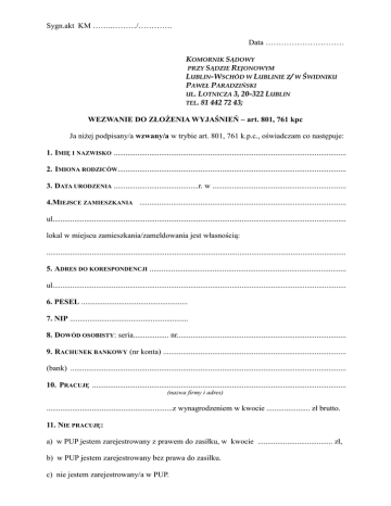 Sygn.akt KM ……..………/…………. Data ………………………… KOMORNIK SĄDOWY PRZY SĄDZIE REJONOWYM LUBLIN-WSCHÓD W LUBLINIE Z/ W ŚWIDNIKU PAWEŁ PARADZIŃSKI UL. LOTNICZA 3, 20-322 LUBLIN TEL. 81 442 72 43; WEZWANIE DO ZŁOŻENIA WYJAŚNIEŃ – art. 801, 761 kpc Ja niżej podpisany/a wzwany/a w trybie art. 801, 761 k.p.c., oświadczam co następuje: 1. IMIĘ I NAZWISKO ...................................................................................................................... 2. IMIONA RODZICÓW.................................................................................................................... 3. DATA URODZENIA ...........................................r. w .................................................................... 4.MIEJSCE ZAMIESZKANIA ......................................................................................................... ul..................................................................................................................................................... lokal w miejscu zamieszkania/zameldowania jest własnością: ........................................................................................................................................................ 5. ADRES DO KORESPONDENCJI .................................................................................................... ul..................................................................................................................................................... 6. PESEL ...................................................... 7. NIP ............................................................ 8. DOWÓD OSOBISTY: seria.................. nr...................................................................................... 9. RACHUNEK BANKOWY (nr konta) ............................................................................................. (bank) ............................................................................................................................................ 10. PRACUJĘ ................................................................................................................................. (nazwa firmy i adres) ................................................................z wynagrodzeniem w kwocie ...................... zł brutto. 11. NIE PRACUJĘ: a) w PUP jestem zarejestrowany z prawem do zasiłku, w kwocie ...................................... zł, b) w PUP jestem zarejestrowany bez prawa do zasiłku. c) nie jestem zarejestrowany/a w PUP. 13. PROWADZĘ DZIAŁALNOŚĆ GOSPODARCZĄ POD NAZWĄ ....................................................... ...................................................................................................................................................... z siedzibą w: ................................................................................................................................ 14. UTRZYMUJE SIĘ Z INNYCH ŹRÓDEŁ (np. umowy zlecenia, o dzieło, agencyjna, praca na umowę nieformalną, praca dorywcza, itp.): ...................................................................................................................................................... ...................................................................................................................................................... 15. MAJĄTEK: - nieruchomości .......................................................................................................................... ...................................................................................................................................................... nr KW .......................................................................................................................................... - ruchomości ................................................................................................................................ ...................................................................................................................................................... - pojazdy mechaniczne (podać markę, rocznik, model, rodzaj nadwozia, numer rejestracyjny, rodzaj paliwa, kolor nadwozia, czy pojazd ma hak, czy jest wyposażony w instalację LPG): ...................................................................................................................................................... ...................................................................................................................................................... - wierzytelności/inne prawa dzierżawy, itp.): majątkowe (akcje, obligacje, dochody z tytułu najmu, ...................................................................................................................................................... ...................................................................................................................................................... DEKLARUJĘ SPŁATĘ ZADŁUŻENIA ............................................................................................... ....................................................................................................................................................... TEL. KONTAKTOWY ............................................................................ ……………………………………… Czytelny podpis