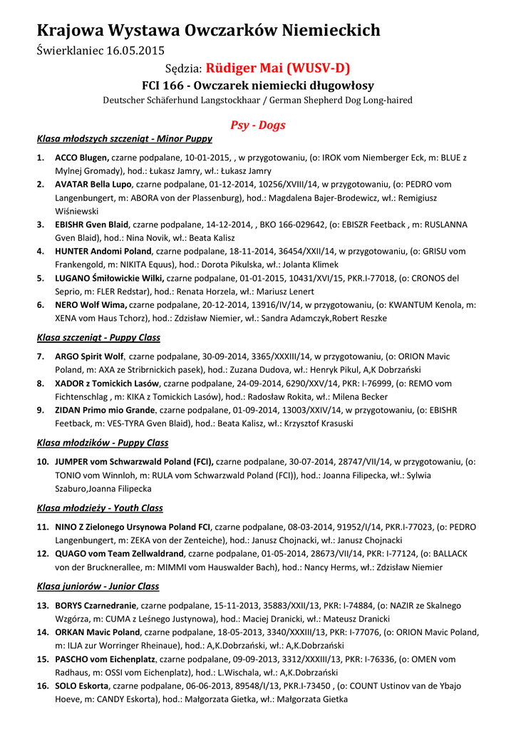 Krajowa Wystawa Owczarków Niemieckich Świerklaniec 16.05.2015 Sędzia: Rüdiger Mai (WUSV-D) FCI 166 - Owczarek niemiecki długowłosy Deutscher Schäferhund Langstockhaar / German Shepherd Dog Long-haired Psy - Dogs Klasa młodszych szczeniąt - Minor Puppy 1. 2. 3. 4. 5. 6. ACCO Blugen, czarne podpalane, 10-01-2015, , w przygotowaniu, (o: IROK vom Niemberger Eck, m: BLUE z Mylnej Gromady), hod.: Łukasz Jamry, wł.: Łukasz Jamry AVATAR Bella Lupo, czarne podpalane, 01-12-2014, 10256/XVIII/14, w przygotowaniu, (o: PEDRO vom Langenbungert, m: ABORA von der Plassenburg), hod.: Magdalena Bajer-Brodewicz, wł.: Remigiusz Wiśniewski EBISHR Gven Blaid, czarne podpalane, 14-12-2014, , BKO 166-029642, (o: EBISZR Feetback , m: RUSLANNA Gven Blaid), hod.: Nina Novik, wł.: Beata Kalisz HUNTER Andomi Poland, czarne podpalane, 18-11-2014, 36454/XXII/14, w przygotowaniu, (o: GRISU vom Frankengold, m: NIKITA Equus), hod.: Dorota Pikulska, wł.: Jolanta Klimek LUGANO Śmiłowickie Wilki, czarne podpalane, 01-01-2015, 10431/XVI/15, PKR.I-77018, (o: CRONOS del Seprio, m: FLER Redstar), hod.: Renata Horzela, wł.: Mariusz Lenert NERO Wolf Wima, czarne podpalane, 20-12-2014, 13916/IV/14, w przygotowaniu, (o: KWANTUM Kenola, m: XENA vom Haus Tchorz), hod.: Zdzisław Niemier, wł.: Sandra Adamczyk,Robert Reszke Klasa szczeniąt - Puppy Class 7. 8. 9. ARGO Spirit Wolf, czarne podpalane, 30-09-2014, 3365/XXXIII/14, w przygotowaniu, (o: ORION Mavic Poland, m: AXA ze Stribrnickich pasek), hod.: Zuzana Dudova, wł.: Henryk Pikul, A,K Dobrzański XADOR z Tomickich Lasów, czarne podpalane, 24-09-2014, 6290/XXV/14, PKR: I-76999, (o: REMO vom Fichtenschlag , m: KIKA z Tomickich Lasów), hod.: Radosław Rokita, wł.: Milena Becker ZIDAN Primo mio Grande, czarne podpalane, 01-09-2014, 13003/XXIV/14, w przygotowaniu, (o: EBISHR Feetback, m: VES-TYRA Gven Blaid), hod.: Beata Kalisz, wł.: Krzysztof Krasuski Klasa młodzików - Puppy Class 10. JUMPER vom Schwarzwald Poland (FCI), czarne podpalane, 30-07-2014, 28747/VII/14, w przygotowaniu, (o: TONIO vom Winnloh, m: RULA vom Schwarzwald Poland (FCI)), hod.: Joanna Filipecka, wł.: Sylwia Szaburo,Joanna Filipecka Klasa młodzieży - Youth Class 11. NINO Z Zielonego Ursynowa Poland FCI, czarne podpalane, 08-03-2014, 91952/I/14, PKR.I-77023, (o: PEDRO Langenbungert, m: ZEKA von der Zenteiche), hod.: Janusz Chojnacki, wł.: Janusz Chojnacki 12. QUAGO vom Team Zellwaldrand, czarne podpalane, 01-05-2014, 28673/VII/14, PKR: I-77124, (o: BALLACK von der Brucknerallee, m: MIMMI vom Hauswalder Bach), hod.: Nancy Herms, wł.: Zdzisław Niemier Klasa juniorów - Junior Class 13. BORYS Czarnedranie, czarne podpalane, 15-11-2013, 35883/XXII/13, PKR: I-74884, (o: NAZIR ze Skalnego Wzgórza, m: CUMA z Leśnego Justynowa), hod.: Maciej Dranicki, wł.: Mateusz Dranicki 14. ORKAN Mavic Poland, czarne podpalane, 18-05-2013, 3340/XXXIII/13, PKR: I-77076, (o: ORION Mavic Poland, m: ILJA zur Worringer Rheinaue), hod.: A,K.Dobrzański, wł.: A,K.Dobrzański 15. PASCHO vom Eichenplatz, czarne podpalane, 09-09-2013, 3312/XXXIII/13, PKR: I-76336, (o: OMEN vom Radhaus, m: OSSI vom Eichenplatz), hod.: L.Wischala, wł.: A,K.Dobrzański 16. SOLO Eskorta, czarne podpalane, 06-06-2013, 89548/I/13, PKR.I-73450 , (o: COUNT Ustinov van de Ybajo Hoeve, m: CANDY Eskorta), hod.: Małgorzata Gietka, wł.: Małgorzata Gietka 17. ULTRA vom Hauswalder Bach, czarne podpalane, 01-11-2013, , VDH.SZ.2299816, (o: FULZ di Zenevredo, m: MIMMI vom Hauswalder Bach), hod.: Wolfgang Feldbinder, wł.: Wolfgang Feldbinder, Mateusz Pawlak Klasa użytkowa - Working Class 18. BASCO z Piorenu, wilczaste, 02.12.2012, 35161/XXII/12, PKR.I-72259, (o: UMBERTO Tensor , m: CODI z Hetmańskiej Sfory), hod.: Piotr Niedzielski, wł.: Anna Lewandowska 19. EDI z Kojca Elbikame, czarne podpalane, 10-02-2013, 25509/III/13, PKR: I-74721, (o: GECK z Kojca Elbikame, m: ZORA z Kojca Elbikame), hod.: Marek Bachórz, wł.: Waldemar Skotarski 20. ELOI vom Trompetersprung, czarne podpalane, 15-03-2013, 28089/VII/13, PKR.I-74257, (o: CONBHAIREAN Uno, m: ODUSCHA vom Trompetersprung), hod.: Ludger Goeke, wł.: Dorota Pikulska 21. GUIDO Team Gleisenauer Schloß, czarne podpalane, 30-05-2010, 1242/XLVI/10, PKR.I-67972, (o: QUATTRO von der Partnachklamm, m: FANNY TeamGleisenauer Schloß), hod.: Stefan, GabiHeller, wł.: Robert Wikar 22. HEKTOR z Zielonego Ursynowa Poland FCI, czarne podpalane, 01-02-2013, 88950/I/13, PKR.I- 72767, (o: XAMBO Kalupus, m: ZISKA von der Zenteiche), hod.: Janusz Chojnacki, wł.: Janusz Chojnacki 23. YONATHAN Temperton (FCI), czarne podpalane, 09-01-2011, 2596/XLVIII/11, PKR.I-68642 , (o: BIX von Artett, m: MILLA vom Fichtenschlag-Zwinger), hod.: Agnieszka Tiahnybok, wł.: Agata Makarska Sędzia: Jürgen Hoffmann (D-SV) FCI 166 - Owczarek niemiecki długowłosy Deutscher Schäferhund Langstockhaar / German Shepherd Dog Long-haired Suki - Bitches Klasa młodszych szczeniąt - Minor Puppy 24. CHANEL vom Thombachtal, czarne podpalane, 18-11-2014, 13926/V/14, w przygotowaniu, (o: FRED vom Rumbachtal, m: NORA von Ljulin), hod.: Tomasz Bujoczek, wł.: Katarzyna Gierczak 25. DONA Gold-Abat, czarne podpalane, 25-12-2014, 4967/VIII/14, w przygotowaniu, (o: GRISU vom Frankengold, m: EMI von Pierrot), hod.: Tomasz, Adrian Lipnicki, wł.: Łukasz Włoszczyński 26. HANA Andomi Poland, czarne podpalane, 18-11-2014, 28707/VII/14, w przygotowaniu, (o: GRISU vom Frankengold, m: NIKITA Equus), hod.: Dorota Pikulska, wł.: Dorota Pikulska 27. LATIKA Śmiłowickie Wilki, czarne podpalane, 01-01-2015, 13930/IV/15, w przygotowaniu, (o: CRONOS del Seprio, m: FLER Redstar), hod.: Renata Horzela, wł.: Renata i Piotr Horzela Klasa młodzików - Puppy Class 28. MOSKA Box-Dogs FCI, czarne podpalane, 30-06-2014, 3329/ XXX/14, w przygotowaniu, (o: MAFFEY vom Quartier Latin, m: GINA Ontopus), hod.: Adam Skwarczek, wł.: Piotr Augustyn 29. SATIN Szenberg, czarne podpalane, 12-06-2014, 4250/XL/14, PKR.I-76073, (o: DERRIK vom Trompetersprung , m: CYTRA Sze