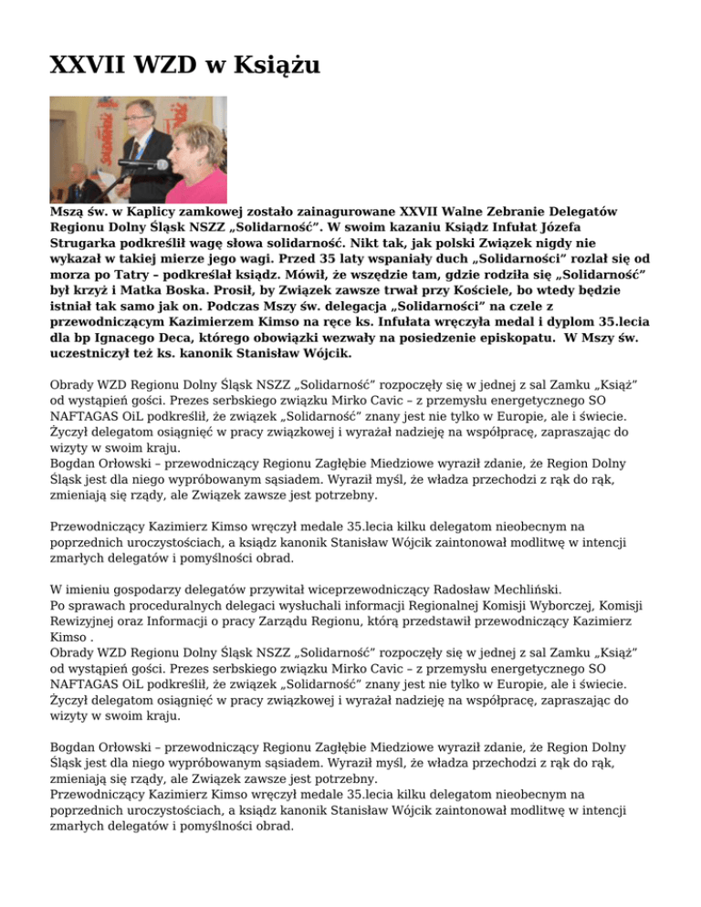 XXVII WZD w Książu Mszą św. w Kaplicy zamkowej zostało zainagurowane XXVII Walne Zebranie Delegatów Regionu Dolny Śląsk NSZZ „Solidarność”. W swoim kazaniu Ksiądz Infułat Józefa Strugarka podkreślił wagę słowa solidarność. Nikt tak, jak polski Związek nigdy nie wykazał w takiej mierze jego wagi. Przed 35 laty wspaniały duch „Solidarności” rozlał się od morza po Tatry – podkreślał ksiądz. Mówił, że wszędzie tam, gdzie rodziła się „Solidarność” był krzyż i Matka Boska. Prosił, by Związek zawsze trwał przy Kościele, bo wtedy będzie istniał tak samo jak on. Podczas Mszy św. delegacja „Solidarności” na czele z przewodniczącym Kazimierzem Kimso na ręce ks. Infułata wręczyła medal i dyplom 35.lecia dla bp Ignacego Deca, którego obowiązki wezwały na posiedzenie episkopatu. W Mszy św. uczestniczył też ks. kanonik Stanisław Wójcik. Obrady WZD Regionu Dolny Śląsk NSZZ „Solidarność” rozpoczęły się w jednej z sal Zamku „Książ” od wystąpień gości. Prezes serbskiego związku Mirko Cavic – z przemysłu energetycznego SO NAFTAGAS OiL podkreślił, że związek „Solidarność” znany jest nie tylko w Europie, ale i świecie. Życzył delegatom osiągnięć w pracy związkowej i wyrażał nadzieję na współpracę, zapraszając do wizyty w swoim kraju. Bogdan Orłowski – przewodniczący Regionu Zagłębie Miedziowe wyraził zdanie, że Region Dolny Śląsk jest dla niego wypróbowanym sąsiadem. Wyraził myśl, że władza przechodzi z rąk do rąk, zmieniają się rządy, ale Związek zawsze jest potrzebny. Przewodniczący Kazimierz Kimso wręczył medale 35.lecia kilku delegatom nieobecnym na poprzednich uroczystościach, a ksiądz kanonik Stanisław Wójcik zaintonował modlitwę w intencji zmarłych delegatów i pomyślności obrad. W imieniu gospodarzy delegatów przywitał wiceprzewodniczący Radosław Mechliński. Po sprawach proceduralnych delegaci wysłuchali informacji Regionalnej Komisji Wyborczej, Komisji Rewizyjnej oraz Informacji o pracy Zarządu Regionu, którą przedstawił przewodniczący Kazimierz Kimso . Obrady WZD Regionu Dolny Śląsk NSZZ „Solidarność” rozpoczęły się w jednej z sal Zamku „Książ” od wystąpień gości. Prezes serbskiego związku Mirko Cavic – z przemysłu energetycznego SO NAFTAGAS OiL podkreślił, że związek „Solidarność” znany jest nie tylko w Europie, ale i świecie. Życzył delegatom osiągnięć w pracy związkowej i wyrażał nadzieję na współpracę, zapraszając do wizyty w swoim kraju. Bogdan Orłowski – przewodniczący Regionu Zagłębie Miedziowe wyraził zdanie, że Region Dolny Śląsk jest dla niego wypróbowanym sąsiadem. Wyraził myśl, że władza przechodzi z rąk do rąk, zmieniają się rządy, ale Związek zawsze jest potrzebny. Przewodniczący Kazimierz Kimso wręczył medale 35.lecia kilku delegatom nieobecnym na poprzednich uroczystościach, a ksiądz kanonik Stanisław Wójcik zaintonował modlitwę w intencji zmarłych delegatów i pomyślności obrad. W imieniu gospodarzy delegatów przywitał wiceprzewodniczący Radosław Mechliński. Po sprawach proceduralnych delegaci wysłuchali informacji Regionalnej Komisji Wyborczej, Komisji Rewizyjnej oraz Informacji o pracy Zarządu Regionu, którą przedstawił przewodniczący Kazimierz Kimso . WZD jako pierwsze przyjęło Stanowisko ws. najważniejszych problemów ludzi pracy czyli kwestii: obniżenia wieku emerytalnego, zlikwidowania patologii w zatrudnianiu i rozwój polskiego przemysłu. Stanowisko przedstawiała Małgorzata Calińska-Mayer i Jerzy Langer. Janusz Wolniak