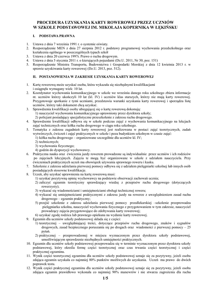PROCEDURA UZYSKANIA KARTY ROWEROWEJ PRZEZ UCZNIÓW W SZKOLE PODSTAWOWEJ IM. MIKOŁAJA KOPERNIKA W ŁĘKIŃSKU I. 1. 2. 3. 4. 5. PODSTAWA PRAWNA Ustawa z dnia 7 września 1991 r. o systemie oświaty. Rozporządzenie MEN z dnia 27 sierpnia 2012 r. podstawy programowej wychowania przedszkolnego oraz kształcenia ogólnego w poszczególnych typach szkół Ustawa z dnia 20 czerwca 1997r. Prawo o ruchu drogowym. Ustawa z dnia 5 stycznia 2011 r. o kierujących pojazdami (Dz.U. 2011, Nr 30, poz. 151) Rozporządzenie Ministra Transportu, Budownictwa i Gospodarki Morskiej z dnia 12 kwietnia 2013 r. w sprawie uzyskiwania karty rowerowej (Dz.U. 2013, poz. 512). II. POSTANOWIENIA W ZAKRESIE UZYSKANIA KARTY ROWEROWEJ Kartę rowerową może uzyskać osoba, która wykazała się niezbędnymi kwalifikacjami i osiągnęła wymagany wiek: 10 lat. 2. Koordynator wychowania komunikacyjnego w szkole we wrześniu danego roku szkolnego zbiera informacje nt. uczniów którzy ukończyli 10 lat (kl. IV) i uczniów klas starszych, którzy nie mają karty rowerowej. Przygotowuje spotkanie z tymi uczniami, przedstawia warunki uzyskania karty rowerowej i sporządza listę uczniów, którzy taki dokument chcą uzyskać. 3. Sprawdzenia kwalifikacji osoby ubiegającej się o kartę rowerową dokonują: 1) nauczyciel wychowania komunikacyjnego uprawniony przez dyrektora szkoły; 2) policjant posiadający specjalistyczne przeszkolenie z zakresu ruchu drogowego. 4. Sprawdzenie kwalifikacji odbywa się w szkole podczas zajęć z wychowania komunikacyjnego na lekcjach zajęć technicznych oraz kółka ruchu drogowego w ciągu roku szkolnego. 5. Tematyka z zakresu zagadnień karty rowerowej jest realizowana w postaci zajęć teoretycznych, zadań wytwórczych, ćwiczeń i zajęć praktycznych w szkole i poza budynkiem szkolnym w czasie zajęć: 1) kółka ruchu drogowego – organizowane szczególnie dla uczniów kl. IV; 2) technicznych; 3) wychowania fizycznego; 4) godzin do dyspozycji wychowawcy. 6. Praktyczna nauka oraz ćwiczenia jazdy rowerem prowadzone są indywidualnie przez uczniów i ich rodziców po zajęciach lekcyjnych. Zajęcia te mogą być organizowane w szkole z udziałem nauczyciela. Przy ćwiczeniach praktycznych uczeń ma obowiązek używania sprawnego roweru i kasku. 7. Szkolenie z zakresu udzielania pierwszej pomocy odbywa się z udziałem pielęgniarki szkolnej lub innych osób posiadających stosowne kwalifikacje. 8. Uczeń, aby uzyskać uprawnienia na kartę rowerową musi: 1) uzyskać pozytywną opinię wychowawcy na podstawie obserwacji zachowań ucznia; 2) zaliczyć egzamin teoretyczny sprawdzający wiedzę z przepisów ruchu drogowego (dotyczących rowerzysty); 3) wykazać się wiadomościami i umiejętnościami obsługi technicznej roweru; 4) wykazać się umiejętnościami praktycznymi z zakresu jazdy na rowerze z uwzględnieniem zasad ruchu drogowego – egzamin praktyczny; 5) przejść szkolenie z zakresu udzielania pierwszej pomocy przedlekarskiej –szkolenie przeprowadza pielęgniarka szkolna, nauczyciel wychowania fizycznego z przygotowaniem w tym zakresie, nauczyciel prowadzący zajęcia przygotowujące do zdobywania karty rowerowej; 6) uzyskać zgodę rodzica lub prawnego opiekuna na wydanie karty rowerowej. 9. Egzamin dla uczniów szkoły podstawowej składa się z części: 1) teoretycznej – uwzględniającej treści, dotyczące przepisów ruchu drogowego, znaków i sygnałów drogowych, zasad bezpiecznego poruszania się po drogach oraz wiadomości z pierwszej pomocy – 25 pytań. 2) praktycznej – przeprowadzonej w miejscu wyznaczonym przez dyrektora szkoły podstawowej, umożliwiającym sprawdzenie niezbędnych umiejętności praktycznych. 10. Egzamin dla uczniów szkoły podstawowej przeprowadza się w terminie wyznaczonym przez dyrektora szkoły podstawowej, który określa formę części teoretycznej oraz czas trwania części teoretycznej i części praktycznej egzaminu. 11. Wynik części teoretycznej egzaminu dla uczniów szkoły podstawowej uznaje się za pozytywny, jeżeli osoba zdająca egzamin uzyskała co najmniej 80% punktów możliwych do uzyskania. Uczeń ma prawo do dwóch poprawek testu. 12. Wynik części praktycznej egzaminu dla uczniów szkoły podstawowej uznaje się za pozytywny, jeżeli osoba zdająca egzamin prawidłowo wykonała co najmniej 90% manewrów i nie stwarza zagrożenia dla ruchu 1. 1/5 drogowego. 13. Egzamin praktyczny polega na wykonaniu następujących zadań egzaminacyjnych: 1) przygotowanie do jazdy i ruszanie z miejsca na płaskim terenie, 2) jazda do przodu po prostej i łukach, na skrzyżowaniach, 3) jazda po łukach w kształcie cyfry 8, tzw. „ósemka”, 4) hamowanie i zatrzymanie pojazdu w określonych miejscach, 5) właściwe reagowanie na znaki i sygnały drogowe, 6) sygnalizowanie wykonywanych manewrów. 14. Sprawdzian umiejętności praktycznych odbywać się będzie w wyznaczonym terminie (koniec maja – początek czerwca) na odpowiednio przygotowanym szkolnym placu manewrowym lub sali gimnastycznej z wykorzystaniem elementów miasteczka ruchu drogowego i w obecności zaproszonych policjantów z wydziału ruchu drogowego. 15. Uczeń zobowiązany jest stawić się na egzamin z rowerem wzorcowo przygotowanym do użytku tj. sprawnym technicznie i przepisowo wyposażonym. 16. Udokumentowania spełnienia wymagań uzyskania karty rowerowej dokonuje się w arkuszu zaliczeń (załącznik nr1 ). 17. W celu uzyskania karty rowerowej uczeń po spełnieniu wymagań z pkt. 8 składa w sekretariacie szkoły: 1) wypełniony arkusz zaliczeń 2) aktualne zdjęcie legitymacyjne o wymiarach 35x45mm opisane swoimi danymi: a) imię i nazwisko; b) data urodzenia; c) adres zamieszkania. 18. Dyrektor szkoły na podstawie wypełnionego arkusza zaliczeń wydaje nieodpłatnie uczniom kartę rowerową na drukach wg wzoru zamieszczonego w załączniku nr 2 do Rozporządzenia Rozporządzenie Ministra Transportu, Budownictwa i Gospodarki Morskiej z dnia 12 k
