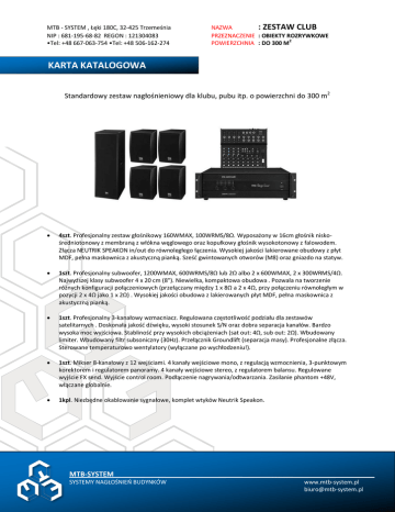 MTB - SYSTEM , Łęki 180C, 32-425 Trzemeśnia NIP : 681-195-68-82 REGON : 121304083 •Tel: +48 667-063-754 •Tel: +48 506-162-274 NAZWA : ZESTAW CLUB PRZEZNACZENIE : OBIEKTY ROZRYWKOWE 2 POWIERZCHNIA : DO 300 M KARTA KATALOGOWA Standardowy zestaw nagłośnieniowy dla klubu, pubu itp. o powierzchni do 300 m2 4szt. Profesjonalny zestaw głośnikowy 160WMAX, 100WRMS/8Ω. Wyposażony w 16cm głośnik niskośredniotonowy z membraną z włókna węglowego oraz kopułkowy głośnik wysokotonowy z falowodem. Złącza NEUTRIK SPEAKON in/out do równoległego łączenia. Wysokiej jakości lakierowane obudowy z płyt MDF, pełna maskownica z akustyczną pianką. Sześć gwintowanych otworów (M8) oraz gniazdo na statyw. 1szt. Profesjonalny subwoofer, 1200WMAX, 600WRMS/8Ω lub 2Ω albo 2 x 600WMAX, 2 x 300WRMS/4Ω. Najwyższej klasy subwoofer 4 x 20 cm (8"). Niewielka, kompaktowa obudowa . Pozwala na tworzenie różnych konfiguracji połączeniowych (przełączany między 1 x 8Ω a 2 x 4Ω, przy połączeniu równoległym w pozycji 2 x 4Ω jako 1 x 2Ω) . Wysokiej jakości obudowa z lakierowanych płyt MDF, pełna maskownica z akustyczną pianką. 1szt. Profesjonalny 3-kanałowy wzmacniacz. Regulowana częstotliwość podziału dla zestawów satelitarnych . Doskonała jakość dźwięku, wysoki stosunek S/N oraz dobra separacja kanałów. Bardzo wysoka moc wyjściowa. Stabliność przy wysokich obciążeniach (sat out: 4Ω, sub out: 2Ω). Wbudowany limiter. Wbudowany filtr subsoniczny (30Hz). Przełącznik Groundlift (separacja masy). Profesjonalne złącza. Sterowane temperaturowo wentylatory (wyłączane po wychłodzeniu!). 1szt. Mikser 8-kanałowy z 12 wejściami. 4 kanały wejściowe mono, z regulacją wzmocnienia, 3-punktowym korektorem i regulatorem panoramy. 4 kanały wejściowe stereo, z regulatorem balansu. Regulowane wyjście FX send. Wyjście control room. Podłączenie nagrywania/odtwarzania. Zasilanie phantom +48V, włączane globalnie. 1kpl. Niezbędne okablowanie sygnałowe, komplet wtyków Neutrik Speakon. MTB-SYSTEM SYSTEMY NAGŁOŚNIEŃ BUDYNKÓW www.mtb-system.pl [email protected]