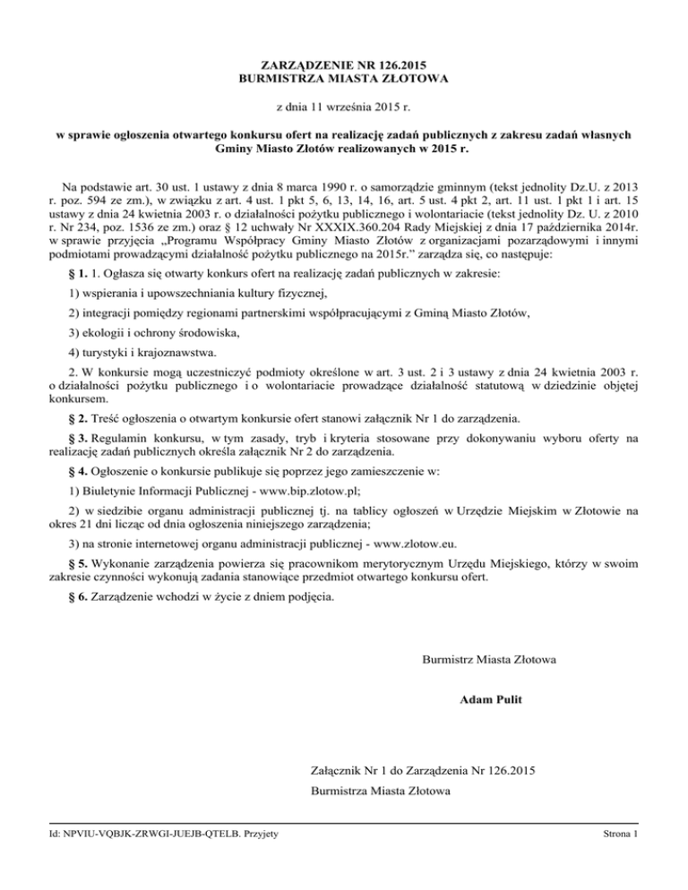 ZARZĄDZENIE NR 126.2015 BURMISTRZA MIASTA ZŁOTOWA z dnia 11 września 2015 r. w sprawie ogłoszenia otwartego konkursu ofert na realizację zadań publicznych z zakresu zadań własnych Gminy Miasto Złotów realizowanych w 2015 r. Na podstawie art. 30 ust. 1 ustawy z dnia 8 marca 1990 r. o samorządzie gminnym (tekst jednolity Dz.U. z 2013 r. poz. 594 ze zm.), w związku z art. 4 ust. 1 pkt 5, 6, 13, 14, 16, art. 5 ust. 4 pkt 2, art. 11 ust. 1 pkt 1 i art. 15 ustawy z dnia 24 kwietnia 2003 r. o działalności pożytku publicznego i wolontariacie (tekst jednolity Dz. U. z 2010 r. Nr 234, poz. 1536 ze zm.) oraz § 12 uchwały Nr XXXIX.360.204 Rady Miejskiej z dnia 17 października 2014r. w sprawie przyjęcia „Programu Współpracy Gminy Miasto Złotów z organizacjami pozarządowymi i innymi podmiotami prowadzącymi działalność pożytku publicznego na 2015r.” zarządza się, co następuje: § 1. 1. Ogłasza się otwarty konkurs ofert na realizację zadań publicznych w zakresie: 1) wspierania i upowszechniania kultury fizycznej, 2) integracji pomiędzy regionami partnerskimi współpracującymi z Gminą Miasto Złotów, 3) ekologii i ochrony środowiska, 4) turystyki i krajoznawstwa. 2. W konkursie mogą uczestniczyć podmioty określone w art. 3 ust. 2 i 3 ustawy z dnia 24 kwietnia 2003 r. o działalności pożytku publicznego i o wolontariacie prowadzące działalność statutową w dziedzinie objętej konkursem. § 2. Treść ogłoszenia o otwartym konkursie ofert stanowi załącznik Nr 1 do zarządzenia. § 3. Regulamin konkursu, w tym zasady, tryb i kryteria stosowane przy dokonywaniu wyboru oferty na realizację zadań publicznych określa załącznik Nr 2 do zarządzenia. § 4. Ogłoszenie o konkursie publikuje się poprzez jego zamieszczenie w: 1) Biuletynie Informacji Publicznej - www.bip.zlotow.pl; 2) w siedzibie organu administracji publicznej tj. na tablicy ogłoszeń w Urzędzie Miejskim w Złotowie na okres 21 dni licząc od dnia ogłoszenia niniejszego zarządzenia; 3) na stronie internetowej organu administracji publicznej - www.zlotow.eu. § 5. Wykonanie zarządzenia powierza się pracownikom merytorycznym Urzędu Miejskiego, którzy w swoim zakresie czynności wykonują zadania stanowiące przedmiot otwartego konkursu ofert. § 6. Zarządzenie wchodzi w życie z dniem podjęcia. Burmistrz Miasta Złotowa Adam Pulit Załącznik Nr 1 do Zarządzenia Nr 126.2015 Burmistrza Miasta Złotowa Id: NPVIU-VQBJK-ZRWGI-JUEJB-QTELB. Przyjety Strona 1 z dnia 11 września 2015 r. Zalacznik1.doc Treść ogłoszenia o konkursie Załącznik Nr 2 do Zarządzenia Nr 126.2015 Burmistrza Miasta Złotowa z dnia 11 września 2015 r. Zalacznik2.doc Treść regulaminu otwartego konkursu ofert Załącznik Nr 3 do Zarządzenia Nr 126.2015 Burmistrza Miasta Złotowa z dnia 11 września 2015 r. Zalacznik3.doc Wzór korekty oferty Id: NPVIU-VQBJK-ZRWGI-JUEJB-QTELB. Przyjety Strona 2