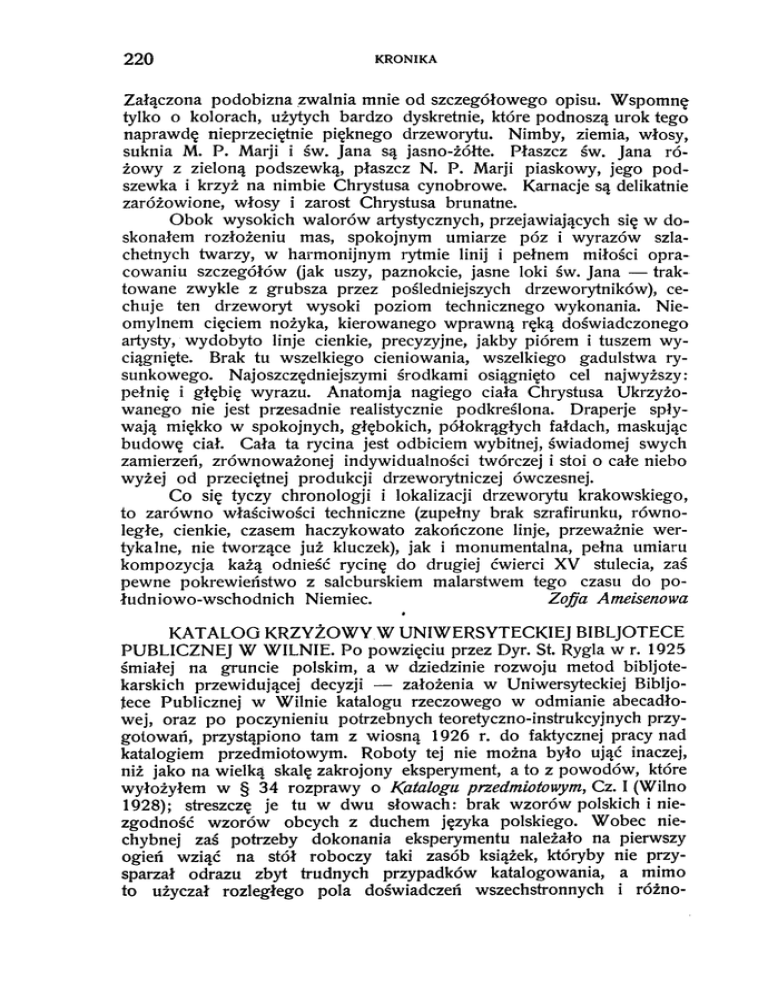 220 KRONIKA Załączona podobizna zwalnia mnie od szczegółow ego opisu. W spom nę tylko o kolorach, użytych bardzo dyskretnie, które podnoszą urok tego naprawdę nieprzeciętnie pięknego drzeworytu. Nimby, ziemia, włosy, suknia M. P . Marji i św. Jana są jasno-żółte. Płaszcz św. Jana ró żowy z zieloną podszewką, płaszcz N. P . Marji piaskowy, jego pod szewka i krzyż na nimbie Chrystusa cynobrow e. Karnacje są delikatnie zaróżow ione, w łosy i zarost Chrystusa brunatne. Obok wysokich w alorów artystycznych, przejawiających się w doskonałem rozłożeniu mas, spokojnym umiarze póz i wyrazów szla chetnych twarzy, w harmonijnym rjdmie linij i pełnem miłości opra cowaniu szczegółów (jak uszy, paznokcie, jasne loki św. Jana — trak towane zwykle z grubsza przez pośledniejszych drzeworytników), ce chuje ten drzeworyt wysoki poziom technicznego wykonania. Nieomylnem cięciem nożyka, kierowanego wpraw ną ręką dośw iadczonego artysty, w ydobyto linje cienkie, precyzyjne, jakby piórem i tuszem w y ciągnięte. Bralf tu wszelkiego cieniowania, wszelkiego gadulstwa ry sunkowego. Najoszczędniejszymi środkami osiągnięto cel najwyższy: pełnię i głębię wyrazu. Anatom ja nagiego ciała Chrystusa Ukrzyżo w anego nie jest przesadnie realistycznie podkreślona. Draperje spły wają miękko w spokojnych, głębokich, półokrągłych fałdach, maskując budowę ciał. C ała ta rycina jest odbiciem wybitnej, świadomej swych zamierzeń, zrów now ażonej indywidualności twórczej i stoi o całe niebo wyżej od przeciętnej produkcji drzeworytniczej ówczesnej. C o się tyczy chronologji i lokalizacji drzeworytu krakowskiego, to zarów no w łaściw ości techniczne (zupełny brak szrafirunku, rów no ległe, cienkie, czasem haczykowato zakończone linje, przeważnie w er tykalne, nie tw orzące już kluczek), jak i monumentalna, pełna umiaru kom pozycja każą odnieść rycinę do drugiej ćwierci X V stulecia, zaś pewne pokrewieństwo z salcburskiem malarstwem tego czasu do p o łudniow o-w schodnich Niemiec. Z ofja A m eisenow a $ K A T A L O G K R Z Y Ż O W Y W U N IW E R S Y T E C K IE J B IB L JO T E C E P U B L IC Z N E J W W IL N IE . P o powzięciu przez Dyr. St. Rygla w r. 1 9 2 5 śmiałej na gruncie polskim, a w dziedzinie rozwoju metod bibljotekarskich przewidującej decyzji — założenia w Uniwersyteckiej Bibljotece Publicznej w W ilnie katalogu rzeczow ego w odmianie abecadłowej, oraz po poczynieniu potrzebnych teoretyczno-instrukcyjnych przy gotow ań, przystąpiono tam z wiosną 1 9 2 6 r. do faktycznej pracy nad katalogiem przedm iotowym . Roboty tej nie m ożna było ująć inaczej, niż jako na wielką skalę zakrojony eksperyment, a to z pow odów , które w yłożyłem w § 3 4 rozpraw y o K atalog u przedm iotow ym , Cz. I (W ilno 1 9 2 8 ); streszczę je tu w dwu słow ach: brak w zorów polskich i nie zgodność w zorów obcych z duchem języka polskiego. W ob ec nie chybnej zaś potrzeby dokonania eksperymentu należało na pierwszy ogień w ziąć na stół roboczy taki zasób książek, któryby nie przy sparzał odrazu zbyt trudnych przypadków katalogowania, a mimo to użyczał rozległego pola doświadczeń wszechstronnych i różno- ..s >.-x ► ; ,1 «Chry5 tus na Krzyżu*. Drzeworyt z drugiej ćwierci XV w. ofiarowany Bibijotece Jagiellońskiej w r. 1929 (W dwukrotnein pomniejszeniu) )■ 'i PldfS / .00 z ŻYCIA BIBLJOTEK 221 rodnych pod względem treści, przedmiotu i formy książek. W ybór p ad ł przeto na księgozbiór podręczny Czytelni Publicznej (studenckiej) i Profesorskiej. Jest on przecie pomniejszonym obrazem całej bibljoteki, minjaturą, ekscerptem całej literatury. Zawiera po części podręcz niki ogólne, a przeto łatwiejsze do skatalogowania, w drugiej zaś, mniejszej części wprowadza w najszczegółowsze tematy rozpraw, tw o rzących przynależne tam wydawnictwa towarzystw naukowych. W ed łu g powziętego projektu przystąpiły bibljotekarki wileńskie, p. M. Obrubańska i p. M. Popowska, oraz częściowo p. F. Jurewiczów na, — przy ścisłej współpracy podpisanego — do przedmioto w ego katalogowania. Przy innych zajęciach i z przerwami trwała cała robota do jesieni 1 9 2 8 r. W końcowym jej etapie — gotowe już karty przedmiotowe (o nagłówkach pisanych czerwono), wzbogacone odsyłaczami międzytematowemi, uszeregowano w jedno abecadło wraz z kartami alfabetycznemi tychże książek. Powstał w ten sposób kata log krzyżowy księgozbioru obydwu wymienionych czytelń. W krótkiej notatce niema miejsca na omówienie oddzielnych stadjów eksperymentalnej pracy. Przedstawię tylko wyniki dokonanego (również dla eksperymentu) obliczenia ilości kart w tym katalogu, al bowiem wyniki te są nieoczekiwane i popierają wygłoszone dawniej teoretyczne zapatrywanie. A mianowicie: cały ten katalog krzyżowy zawierał w dniu oddania go do użytku czytelników (początek listo pada 19 2 8 ) 1 1 .7 2 0 kart katalogowych (dokładniej: tekstów opisu, bo niejeden zajął kilka kartek). Ilość ta dzieliła się na cztery kategorje: I. Alfabetyczne karty główne 4 .6 8 0 , t. zn. ilość dzieł w księgo zbiorze. II. Alfabetyczne odsyłacze 1. 110 (stanowią 2 5 °/q poz. I-ej; czy to norma?). III. Przedmiotowe karty główne 5 .000. IV. Przedmiotowe odsyłacze 9 3 0 . Stosunek poz. I:III wynosi 1 0 : 1 1 , co się czyta: tylko co dzie siąte dzieło otrzymywało dwie karty przedmiotowe pod dwoma różnemi tematami; albo inaczej: na jedno dzieło przypada nagłówka przedmiotowego. Katalogowanie przedmiotowe postępowało zatem bar dzo oszczędnie (ale nie było intencji skąpstwa ze szkodą dla czytel nika!), używało natomiast obficie odsyłaczy (poz. IV). Po części możnaby ów stosunek tłumaczyć formalnym charakterem zbioru: dzieła bardzo ogólne i bardzo szczegółowe najłatwiej zadawalają się jednym tematem; więcej potrzeba ich książkom pośrednim pod względem zakres
