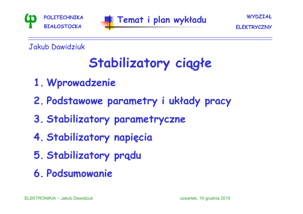 POLITECHNIKA Temat i plan wykładu BIAŁOSTOCKA Jakub Dawidziuk Stabilizatory ciągłe 1. Wprowadzenie 2. Podstawowe parametry i układy pracy 3. Stabilizatory parametryczne 4. Stabilizatory napięcia 5. Stabilizatory prądu 6. Podsumowanie ELEKTRONIKIA – Jakub Dawidziuk czwartek, 10 grudnia 2015 WYDZIAŁ ELEKTRYCZNY Zasada stabilizacji napięcia i prądu Przebiegi napięć na wyjściach elementów prostownika Elementy prostownika Parametry stabilizatorów napięcia i prądu Prosty stabilizator kompensacyjny szeregowy Stabilizator kompensacyjny Stabilizatory trójkońcówkowe napięcia dodatniego 78XX Stabilizator trójkońcówkowy serii 78XX Regulacja napięcia wyjściowego (7-30) V Układ zabezpieczenia prądowego Pd=I0max(E-U) przy zwarciu Pd=I0max(E-U) Stabilizatory trójkońcówkowe napięcia ujemnego 79XX Podstawowe parametry serii 78/79 Przykłady obudów stabilizatorów Stabilizatory nastawne napięcia dodatniego serii317 Stabilizatory nastawne napięcia ujemnego serii 337 PODSTAWY ELEKTRONIKI – Jakub Dawidziuk czwartek, 10 grudnia 2015 Stabilizatory o nastawnym napięciu i prądzie maksymalnym np. L200 PODSTAWY ELEKTRONIKI – Jakub Dawidziuk czwartek, 10 grudnia 2015 Stabilizatory LDO (Low Drop Out) Stabilizatory dwunapięciowe Stabilizatory prądu Stabilizatory prądu ELEKTRONIKA – Jakub Dawidziuk czwartek, 10 grudnia 2015 Zalety i wady stabilizatorów ciągłych o ustalonym napięciu wyjściowym Zalety: proste układy aplikacyjne (3 wyprowadzenia), ustalony zakres napięć wyjściowych. Wady: niska sprawność, konieczność stosowania radiatorów, niezbyt wysoki współczynnik stabilizacji napięcia, ustalone napięcie wyjściowe, są podatne na wzbudzanie. Stabilizatory impulsowe Wobec pogłębiającego się deficytu energii powstaje konieczność oszczędnego gospodarowania nią, zwłaszcza najszlachetniejszym jej rodzajem – energią elektryczną. Urządzenia elektroniczne muszą być zasilane stabilizowanymi napięciami stałymi. Dobrym rozwiązaniem, szczególnie przy duŜych mocach wyjściowych, są stabilizatory impulsowe. Wysoka sprawność, stabilne napięcie wyjściowe, niezaleŜne od napięcia zasilającego i temperatury otoczenia sprawiają, Ŝe są niemal idealnym źródłem prądu stałego. MoŜe on być częścią większego urządzenia elektronicznego, ale zazwyczaj jest oddzielnym modułem, wykonanym jako układ scalony. Najczęstsze zastosowania to zasilacze sprzętu komputerowego, elektroniki uŜytkowej, sprzętu telekomunikacyjnego i medycznego, aparatury pokładowej samolotów oraz sprzętu kosmicznego. Stabilizator ciągły=liniowy i impulsowy Sprawność stabilizatora szeregowego η= Pwy Pwe = U wy I wy U we I we = U wy U we np. 7805 U róŜ = 2V U we = 7V 5V η= = 0,71 7V 5V η= = 0,41 12V Pdiss Pdiss Pwe 1 = Pwe − Pwy = Pwy − 1 = Pwy − 1 Pwy η 1 = Pwy − 1 = Pwy 0,5 Sprawność maleje wraz ze wzrostem Uwe Sprawność stabilizatora impulsowego η= Pwy Pwe = (U we − U CEsat )I wy U we I wy U we − U CEsat = U we U CEsat 1V η = 1− = 1− = 0,9 U we 10V Sprawność wzrasta wraz ze wzrostem Uwe Won = U we I wy t on 2 ( Woff = PS ≡ U we I wy f S t on + t off ) U we I wy t off 2 Stabilizatory impulsowe Napięcie Zasilacz stałe EA impulsowy R0 Napięcie stałe U0 zasilany z akumulatora (baterii) Sieć energetyczna Prostownik Zasilacz sieciowy impulsowy (np. 230V, 50 Hz zasilany z sieci energetycznej R0 Napięcie stałe U0 Podstawowe rodzaje przekształtników Przekształtniki (regulatory) prądu stałego DC/DC (DC/DC converters) • przekształtnik obniŜający napięcie (down converter, buck converter, buck regulator), • przekształtnik podwyŜszający napięcie (step-up converter, boost converter, boost regulator), • przekształtnik odwracający napięcie (inverting converter, inverting regulator). Przekształtniki o wyjściu nieoddzielonym galwanicznie od wejścia ( przetwornice dławikowe) IWE IL UWE L C US IL L UWE ID UWY obniŜający napięcie RL D C US UWY podwyŜszający napięcie RL IC IL T L odwracający napięcie UWE US C UWY RL Wartość średnia przebiegu impulsowego Kształtowanie napięcia wyjściowego poprzez modulację szerokości impulsu Przekształtnik obniŜający napięcie (ang. - Buck or Step-Down Converter) iL = U −U o L U −U o t1 = DT L Przekształtnik obniŜający napięcie - przebiegi napięć i prądów Uwy U wy = U we ⋅ D U wy U we io 1 Przekształtnik obniŜający napięcie Parametry techniczne: Krok 2. Oblicz napięcie na cewce • częstotliwość łączeniowa = 250kHz • V1 = Vi-Vo (tranzystor on) • zakres napięcia wejściowego = 12V±10% • V1 = 13.2 - 5 = 8.2V • max pulsacje prądu = 220mA • napięcie wyjściowe = 5.0V Krok 1. Oblicz współ. wypełnienia • Vo = napięcie wyjściowe • Vi = max napięcie wejściowe • D = Vo / Vi • D = 5/13.2 = 0.379 • V1 = -Vo (tranzystor off) • V1 = - Vo = - 5V Krok 3. Oblicz indukcyjność • L = Vl.dt/di • L = (8.2 x 0.379/250 x 103)/0.22 • L = 56µH Podstawowy przekształtnik podwyŜszający Przekształtnik obniŜający i podwyŜszający na MC34063