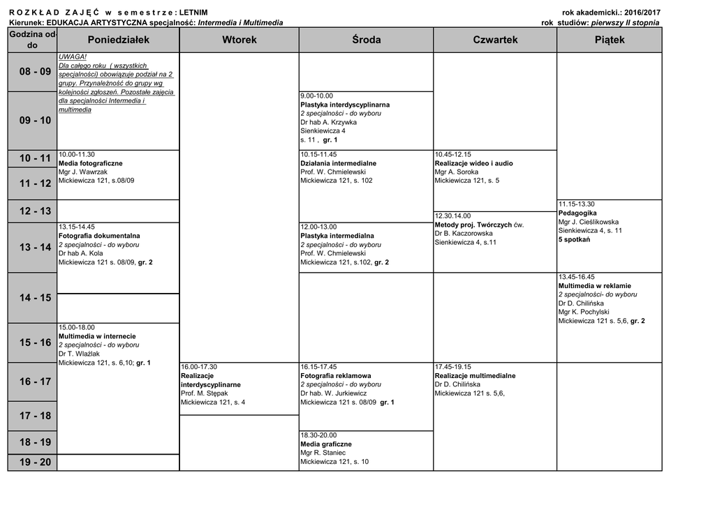R O Z K Ł A D Z A J Ę Ć w s e m e s t r z e : LETNIM Kierunek: EDUKACJA ARTYSTYCZNA specjalność: Intermedia i Multimedia Godzina oddo 08 - 09 Poniedziałek Wtorek UWAGA! Dla całęgo roku ( wszystkich specjalności) obowiązuje podział na 2 grupy. Przynależność do grupy wg kolejności zgłoszeń. Pozostałe zajęcia dla specjalności Intermedia i multimedia 11 - 12 Środa 10.00-11.30 Media fotograficzne Mgr J. Wawrzak Mickiewicza 121, s.08/09 10.15-11.45 Działania intermedialne Prof. W. Chmielewski Mickiewicza 121, s. 102 12 - 13 13 - 14 Czwartek 13.15-14.45 Fotografia dokumentalna 2 specjalności - do wyboru Dr hab A. Kola Mickiewicza 121 s. 08/09, gr. 2 12.00-13.00 Plastyka intermedialna 2 specjalności - do wyboru Prof. W. Chmielewski Mickiewicza 121, s.102, gr. 2 10.45-12.15 Realizacje wideo i audio Mgr A. Soroka Mickiewicza 121, s. 5 12.30.14.00 Metody proj. Twórczych ćw. Dr B. Kaczorowska Sienkiewicza 4, s.11 15 - 16 16 - 17 16.00-17.30 Realizacje interdyscyplinarne Prof. M. Stępak Mickiewicza 121, s. 4 16.15-17.45 Fotografia reklamowa 2 specjalności - do wyboru Dr hab. W. Jurkiewicz Mickiewicza 121 s. 08/09 gr. 1 17 - 18 18 - 19 19 - 20 11.15-13.30 Pedagogika Mgr J. Cieślikowska Sienkiewicza 4, s. 11 5 spotkań 13.45-16.45 Multimedia w reklamie 2 specjalności- do wyboru Dr D. Chilińska Mgr K. Pochylski Mickiewicza 121 s. 5,6, gr. 2 14 - 15 15.00-18.00 Multimedia w internecie 2 specjalności - do wyboru Dr T. Wlaźlak Mickiewicza 121, s. 6,10; gr. 1 Piątek 9.00-10.00 Plastyka interdyscyplinarna 2 specjalności - do wyboru Dr hab A. Krzywka Sienkiewicza 4 s. 11 , gr. 1 09 - 10 10 - 11 rok akademicki.: 2016/2017 rok studiów: pierwszy II stopnia 18.30-20.00 Media graficzne Mgr R. Staniec Mickiewicza 121, s. 10 17.45-19.15 Realizacje multimedialne Dr D. Chilińska Mickiewicza 121 s. 5,6, R O Z K Ł A D Z A J Ę Ć w s e m e s t r z e : LETNIM Kierunek: EDUKACJA ARTYSTYCZNA specjalność: Intermedia i Multimedia Godzina oddo 08 - 09 09 - 10 Poniedziałek Wtorek *Obowiązkowe, szkolenie BHP. Drugi etap (test) 24 marca '17 Wydział Chemii sala ćw. BHP 2p.godz 8:30-11.00 rok akademicki.: 2016/2017 rok studiów: drugi II stopnia Środa Czwartek Piątek 08.30-10.00 Mgr-ska pracownia dyplomowa Dr hab. A. Kola Mickiewicza 121, s.08/09 10 - 11 11.30 – 13.00 Seminarium teoretyczne Prof. W. Limont Sienkiewicza 4, s.11 11 - 12 12 - 13 12.30-14.00 Mgr-ska pracownia dyplomowa Prof. M. Stępak Mickiewicza 121, s. 106 13 - 14 13.15-14.45 Mgr-ska pracownia dyplomowa Prof. W. Chmielewski Mickiewicza 121, s. 104 12.45 – 14.15 Seminarium teoretyczne Dr hab M. Jaworski Sienkiewicza 4, s. 24 14 - 15 15 - 16 16 - 17 17 - 18 18 - 19 19 - 20 18.00-20.15 Aktualia sztuki Prof. W. Smużny Mickiewicza 121, s.6 12.00.-13.30 Mgr-ska pracownia dyplomowa Dr hab. K. Białowicz Mickiewicza 121, s.10 ROZKŁAD Z A J Ę Ć w s e m e s t r z e: LETNIM Kierunek: EDUKACJA ARTYSTYCZNA specjalność: media rysunkowe Godzina od-do Poniedziałek Wtorek 10-11 15-16 16-17 17-18 18-19 19-20 8.45 -11.00 Rysunek klasyczny Prof. M. Szary Szosa Bydgoska 50/56 s.33a 10.45.12.15 Metody proj. Twórczych ćw. Dr B. Kaczorowska Sienkiewicza 4, s.11 12.00 -15.00 Rysunek intermedialny Prof. B. Chmielewski Dr hab.. E. Jabłońska Mgr Natalia Wiśniewska Szosa Bydgoska 50/56 s 101 12-13 14-15 Piątek 9.00 -12.00 Rysunek Użytkowy Prof. J. Gołaś Dr K Łyszkowska Szosa Bydgoska 50/56 s. 21b 11-12 13-14 Czwartek 9.00 -10.00 Plastyka interdyscyplinarna 2 specjalności do wyboru Dr hab A. Krzywka Sienkiewicza 4 s. 11 , gr. 1 08-09 09-10 Środa rok akad.: 2016/2017 rok studiów: pierwszy II stopnia 13.15-14.45 Fotografia dokumentalna 2 specjalności do wyboru Dr hab A. Kola Mickiewicza 121 s. 08/09, gr. 2 15.00-18.00 Multimedia w internecie 2 specjalności do wyboru Dr T. Wlaźlak Mickiewicza 121, s. 6,10; gr. 1 12.00-13.00 Plastyka intermedialna 2 specjalności do wyboru Prof. W. Chmielewski Mickiewicza 121, s.102, gr. 2 16.45-18.15 Fotografia reklamowa 2 specjalności do wyboru Dr hab. W. Jurkiewicz Mickiewicza 121 s. 08/09 gr. 1 UWAGA! Grupa A i B oznacza podział na grupy warsztatowe dla specjalności. Dla całego roku obowiązuje podział na dwie grupy 1 i2 11.15-13.30 Pedagogika Mgr J. Cieślikowska Sienkiewicza 4, s. 11 5 spotkań 13.45-16.45 Multimedia w reklamie 2 specjalności do wyboru Dr D. Chilińska Mgr K. Pochylski Mickiewicza 121 s. 5,6, gr. 2 ROZKŁAD Z A J Ę Ć w s e m e s t r z e: LETNIM Kierunek: Edukacja Artystyczna specjalność: media rysunkowe Godzina od-do Poniedziałek Wtorek Środa rok akad.: 2016/2017 rok studiów: drugi II stopnia Czwartek 08-09 09-10 10-11 12.45 – 14.15 Seminarium teoretyczne Dr hab M. Jaworski Sienkiewicza 4, s. 24 11-12 11.30 – 13.00 Seminarium teoretyczne Prof. W. Limont Sienkiewicza 4, s.1 12-13 13-14 14.30 -17.30 Mgr prac dyplomowa Prof. B. Chmielewski Dr hab. K. Garstka-Saran Dr hab. E. Jabłońska 14-15 15-16 16-17 17-18 18-19 19-20 18.00-20.15 Aktualia sztuki Prof. W. Smużny Mickiewicza 121, s.6 14.30 -17.30 Mgr prac dyplomowa Prof. J. Gołaś Prof. M. Szary Dr hab. W. Pochylski Piątek
