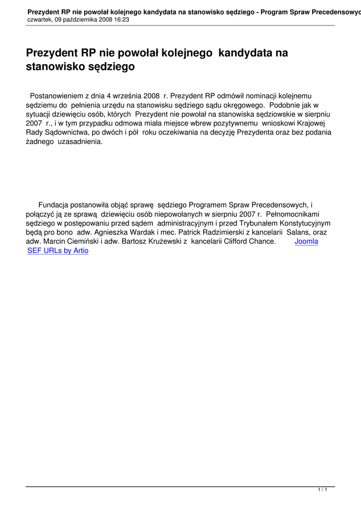 Prezydent RP nie powołał kolejnego kandydata na stanowisko sędziego - Program Spraw Precedensowyc czwartek, 09 października 2008 16:23 Prezydent RP nie powołał kolejnego kandydata na stanowisko sędziego Postanowieniem z dnia 4 września 2008 r. Prezydent RP odmówił nominacji kolejnemu sędziemu do pełnienia urzędu na stanowisku sędziego sądu okręgowego. Podobnie jak w sytuacji dziewięciu osób, których Prezydent nie powołał na stanowiska sędziowskie w sierpniu 2007 r., i w tym przypadku odmowa miała miejsce wbrew pozytywnemu wnioskowi Krajowej Rady Sądownictwa, po dwóch i pół roku oczekiwania na decyzję Prezydenta oraz bez podania żadnego uzasadnienia. Fundacja postanowiła objąć sprawę sędziego Programem Spraw Precedensowych, i połączyć ją ze sprawą dziewięciu osób niepowołanych w sierpniu 2007 r. Pełnomocnikami sędziego w postępowaniu przed sądem administracyjnym i przed Trybunałem Konstytucyjnym będą pro bono adw. Agnieszka Wardak i mec. Patrick Radzimierski z kancelarii Salans, oraz adw. Marcin Ciemiński i adw. Bartosz Krużewski z kancelarii Clifford Chance. Joomla SEF URLs by Artio 1/1