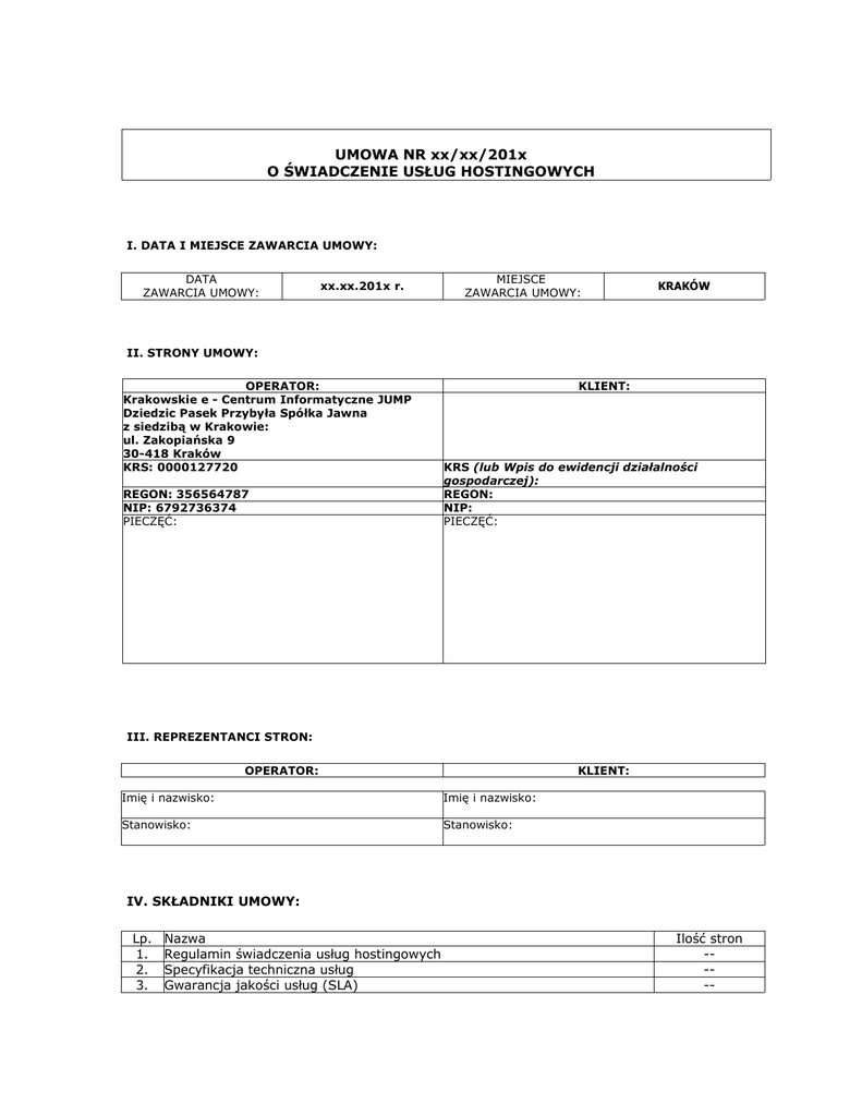 UMOWA NR xx/xx/201x O ŚWIADCZENIE USŁUG HOSTINGOWYCH I. DATA I MIEJSCE ZAWARCIA UMOWY: DATA ZAWARCIA UMOWY: xx.xx.201x r. MIEJSCE ZAWARCIA UMOWY: KRAKÓW II. STRONY UMOWY: OPERATOR: Krakowskie e - Centrum Informatyczne JUMP Dziedzic Pasek Przybyła Spółka Jawna z siedzibą w Krakowie: ul. Zakopiańska 9 30-418 Kraków KRS: 0000127720 REGON: 356564787 NIP: 6792736374 PIECZĘĆ: KLIENT: KRS (lub Wpis do ewidencji działalności gospodarczej): REGON: NIP: PIECZĘĆ: III. REPREZENTANCI STRON: OPERATOR: KLIENT: Imię i nazwisko: Imię i nazwisko: Stanowisko: Stanowisko: IV. SKŁADNIKI UMOWY: Lp. 1. 2. 3. Nazwa Regulamin świadczenia usług hostingowych Specyfikacja techniczna usług Gwarancja jakości usług (SLA) Ilość stron ---- § 1. Definicje Definicje obowiązujące na gruncie niniejszej Umowy o świadczenie usług hostingowych (zwanej dalej Umową) zostały określone w Regulaminie świadczenia usług hostingowych (zwanym dalej Regulaminem) oraz w Dokumencie gwarancji jakości usług (zwanym dalej Dokumentem SLA). § 2. Przedmiot umowy 1. Mocą zawartej Umowy Operator zobowiązuje się do zapewnienia możliwości korzystania z Usług hostingowych zakupionych przez Klienta, a Klient zobowiązuje się do terminowego wnoszenia Opłat abonamentowych. Ponadto strony umowy zobowiązują się do wykonywania wszystkich pozostałych zobowiązań, które zostały określone w Umowie, Regulaminie oraz w Dokumencie SLA. 2. Przez zawarcie Umowy Klient oświadcza, że przed zawarciem umowy otrzymał egzemplarz Regulaminu, Dokumentu SLA oraz Cennika usług. 3. Klient oświadcza, że się zapoznał oraz, że się zgadza na postanowienia zawarte w Regulaminie, Dokumencie SLA i Cenniku usług oraz, że zobowiązuje się stosować do postanowień zawartych w wyżej wymienionych dokumentach. 4. W przypadku odpłatnego lub nieodpłatnego udostępniania przez Klienta Usług hostingowych podmiotom trzecim, które nie są stroną Umowy, Klient zobowiązuje się do udostępniania Usług hostingowych (niezależnie od formy prawnej takiego udostępnienia) wyłącznie przy zapewnieniu przestrzegania przez te osoby zasad określonych w Regulaminie oraz Dokumencie SLA. § 3. Upoważnienie do wykorzystywania treści Regulaminu oraz treści Dokumentu SLA 1. Operator oświadcza, że treść Regulaminu oraz treść Dokumentu SLA stanowią utwory w rozumieniu ustawy z dnia 4 lutego 1994 r. o prawie autorskim i prawach pokrewnych (Dz. U. z 2006r, nr 90 poz.631, z późn. zm.) i podlegają prawnej ochronie. 2. Operator udziela Klientowi licencji na wykorzystywanie treści utworów, o których mowa w ust. 1 w działalności gospodarczej prowadzonej przez Klienta, która jest związana z udostępnianiem podmiotom trzecim Usług hostingowych. Licencja obowiązuje przez czas trwania Umowy. § 4. Postanowienia szczególne 1. Zgodnie ze złożonym przez Klienta zamówieniem na usługę opisaną w Specyfikacji technicznej usług ustala się następujące ceny za utrzymanie serwera: tu główna domena serwera Jednorazowa opłata Opłata abonamentowa instalacyjna Lp. Usługa 1 Rodzaj / nazwa usługi -- -- 2 Rodzaj / nazwa usługi -- -- *do cen należy doliczyć obowiązującą stawkę podatku VAT 2. W przypadku wymówienia niniejszej Umowy przez Klienta w terminie krótszym niż jedenaście miesięcy od dnia zakończenia pierwszego okresu abonamentowego, Klient zobowiązuje się do wniesienia dodatkowej opłaty -------------- PLN netto, stanowiącej wyrównanie do jednorazowej opłaty instalacyjnej każdego serwera fizycznego objętego niniejszą Umową. § 5. Postanowienia końcowe 1. Szczegółowe warunki oraz czas trwania umowy, tryb jej rozwiązania, terminy płatności, zakres praw i obowiązków Operatora i Klienta oraz zasady odpowiedzialności Operatora zostały określone w Regulaminie. 2. W sprawach nieregulowanym niniejszą Umową mają zastosowanie przepisy kodeksu cywilnego. 3. Sądem miejscowo właściwym dla rozpatrywania sporów wynikających z Umowy jest sąd powszechny miejsca siedziby Operatora. 4. Umowę sporządzono w dwóch jednobrzmiących egzemplarzach, po jednym dla każdej ze Stron. Za Operatora __________________________ Data, podpis osoby upoważnionej Za Klienta __________________________ Data, podpis osoby upoważnionej