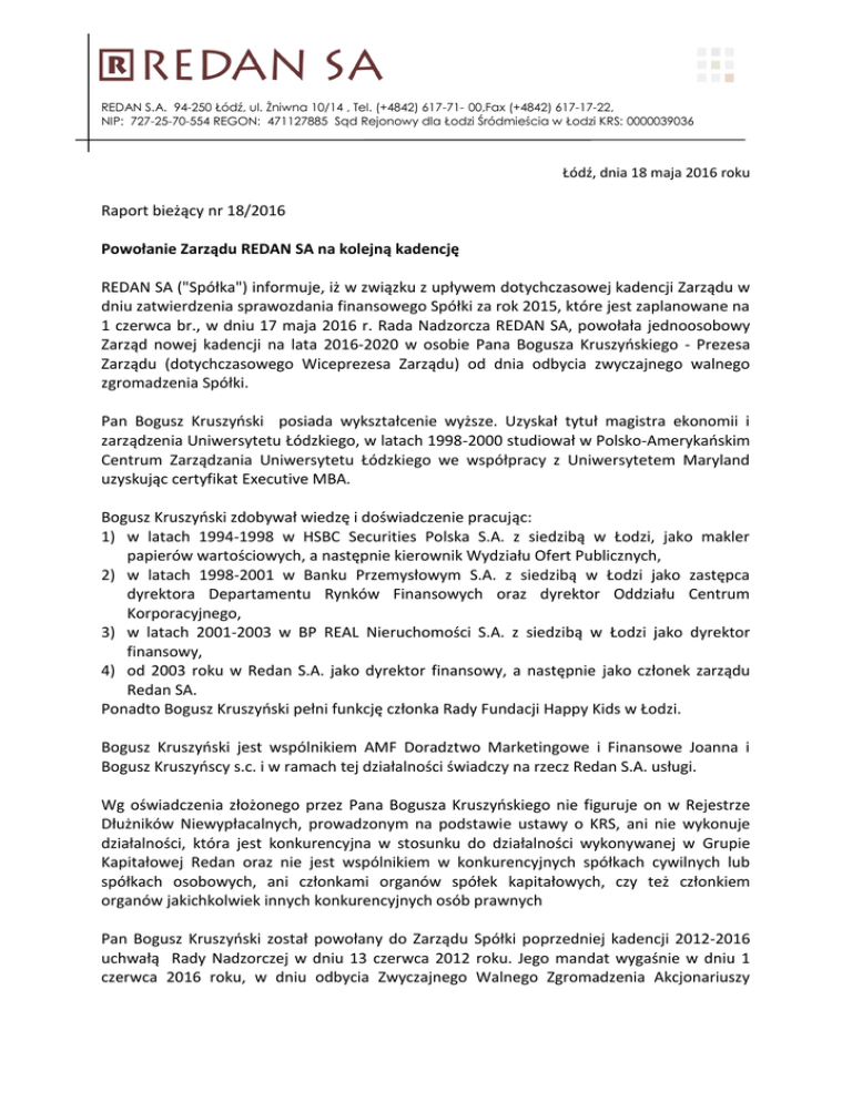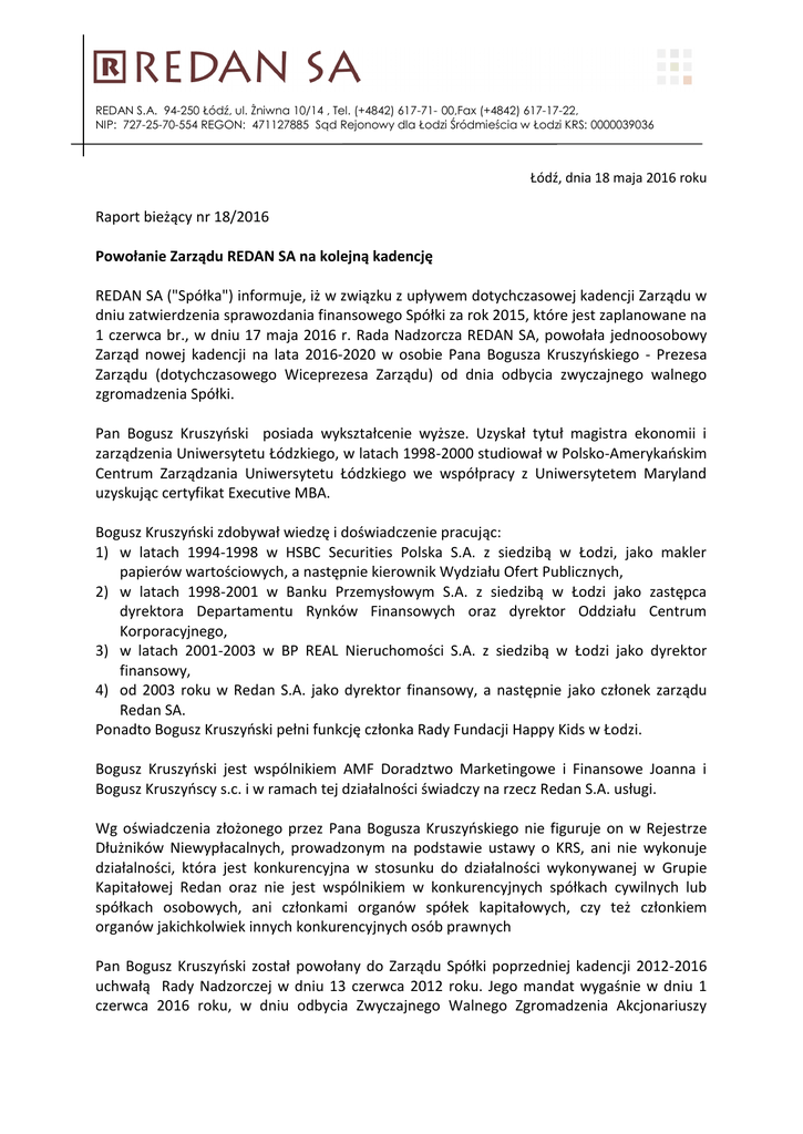 1 czerwca br., w dniu 17 maja 2016 r. Rada Nadzorcza REDAN SA, powołała jednoosobowy