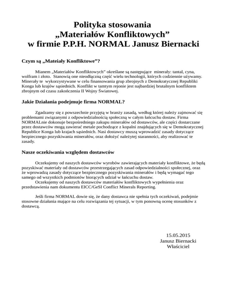Polityka stosowania „Materiałów Konfliktowych” w firmie P.P.H. NORMAL Janusz Biernacki Czym są „Mateiały Konfliktowe”? Mianem „Materiałów Konfliktowych” określane są następujące minerały: tantal, cyna, wolfram i złoto. Stanowią one nieodłączną część wielu technologii, których codziennie używamy. Minerały te wykorzystywane w celu finansowania grup zbrojnych z Demokratycznej Republiki Konga lub krajów sąsiednich. Konflikt w tamtym rejonie jest najbardziej brutalnym konfliktem zbrojnym od czasu zakończenia II Wojny Światowej. Jakie Działania podejmuje firma NORMAL? Zgadzamy się z powszechnie przyjętą w branży zasadą, według której należy zajmować się problemami związanymi z odpowiedzialnością społeczną w całym łańcuchu dostaw. Firma NORMALnie dokonuje bezpośredniego zakupu minerałów od dostawców, ale części dostarczane przez dostawców mogą zawierać metale pochodzące z kopalni znajdujących się w Demokratycznej Republice Konga lub krajach sąsiednich. Nasi dostawcy muszą wprowadzić zasady dotyczące bezpiecznego pozyskiwania minerałów, oraz dołożyć należytej staranności, aby realizować te zasady. Nasze oczekiwania względem dostawców Oczekujemy od naszych dostawców wyrobów zawierających materiały konfliktowe, że będą pozyskiwać materiały od dostawców przestrzegających zasad odpowiedzialności społecznej, oraz że wprowadzą zasady dotyczące bezpiecznego pozyskiwania minerałów i będą wymagać tego samego od wszystkich podmiotów biorących udział w łańcuchu dostaw. Oczekujemy od naszych dostawców materiałów konfliktowych wypełnienia oraz przedstawienia nam dokumentu EICC/GeSI Conflict Minerals Reporting. Jeśli firma NORMAL dowie się, że dany dostawca nie spełnia tych oczekiwań, podejmie stosowne działania mające na celu rozwiązania tej sytuacji, w tym ponowną ocenę stosunków z dostawcą. 15.05.2015 Janusz Biernacki Właściciel