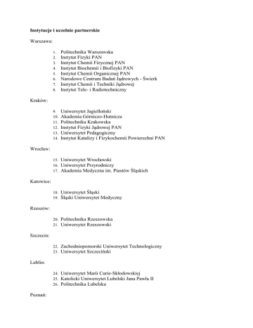 Instytucje i uczelnie partnerskie Warszawa: 1. 2. 3. 4. 5. 6. 7. 8. Politechnika Warszawska Instytut Fizyki PAN Instytut Chemii Fizycznej PAN Instytut Biochemii i Biofizyki PAN Instytut Chemii Organicznej PAN Narodowe Centrum Badań Jądrowych - Świerk Instytut Chemii i Techniki Jądrowej Instytut Tele- i Radiotechniczny 9. 10. 11. 12. 13. 14. Uniwersytet Jagielloński Akademia Górniczo-Hutnicza Politechnika Krakowska Instytut Fizyki Jądrowej PAN Uniwersytet Pedagogiczny Instytut Katalizy i Fizykochemii Powierzchni PAN 15. 16. 17. Uniwersytet Wrocławski Uniwersytet Przyrodniczy Akademia Medyczna im. Piastów Śląskich 18. 19. Uniwersytet Śląski Śląski Uniwersytet Medyczny 20. 21. Politechnika Rzeszowska Uniwersytet Rzeszowski 22. 23. Zachodniopomorski Uniwersytet Technologiczny Uniwersytet Szczeciński 24. 25. 26. Uniwersytet Marii Curie-Skłodowskiej Katolicki Uniwersytet Lubelski Jana Pawła II Politechnika Lubelska Kraków: Wrocław: Katowice: Rzeszów: Szczecin: Lublin: Poznań: 27. 28. 29. Uniwersytet im. Adama Mickiewicza Instytut Chemii Bioorganicznej PAN Uniwersytet Przyrodniczy 30. 31. Politechnika Gdańska Uniwersytet Gdański 32. Centrum Badań Molekularnych i Makromolekularnych PAN 33. Uniwersytet Humanistyczno - Przyrodniczy Jana Kochanowskiego 34. Uniwersytet w Białymstoku 35. Akademia Podlaska Gdańsk: Łódź: Kielce: Białystok: Siedlce: