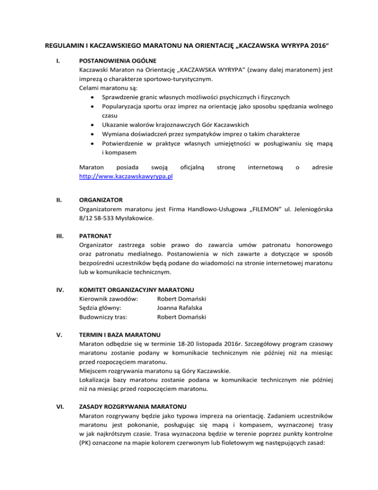 REGULAMIN I KACZAWSKIEGO MARATONU NA ORIENTACJĘ „KACZAWSKA WYRYPA 2016” I. POSTANOWIENIA OGÓLNE Kaczawski Maraton na Orientację „KACZAWSKA WYRYPA” (zwany dalej maratonem) jest imprezą o charakterze sportowo-turystycznym. Celami maratonu są: Sprawdzenie granic własnych możliwości psychicznych i fizycznych Popularyzacja sportu oraz imprez na orientację jako sposobu spędzania wolnego czasu Ukazanie walorów krajoznawczych Gór Kaczawskich Wymiana doświadczeń przez sympatyków imprez o takim charakterze Potwierdzenie w praktyce własnych umiejętności w posługiwaniu się mapą i kompasem Maraton posiada swoją http://www.kaczawskawyrypa.pl oficjalną stronę internetową o adresie II. ORGANIZATOR Organizatorem maratonu jest Firma Handlowo-Usługowa „FILEMON” ul. Jeleniogórska 8/12 58-533 Mysłakowice. III. PATRONAT Organizator zastrzega sobie prawo do zawarcia umów patronatu honorowego oraz patronatu medialnego. Postanowienia w nich zawarte a dotyczące w sposób bezpośredni uczestników będą podane do wiadomości na stronie internetowej maratonu lub w komunikacie technicznym. IV. KOMITET ORGANIZACYJNY MARATONU Kierownik zawodów: Robert Domański Sędzia główny: Joanna Rafalska Budowniczy tras: Robert Domański V. TERMIN I BAZA MARATONU Maraton odbędzie się w terminie 18-20 listopada 2016r. Szczegółowy program czasowy maratonu zostanie podany w komunikacie technicznym nie później niż na miesiąc przed rozpoczęciem maratonu. Miejscem rozgrywania maratonu są Góry Kaczawskie. Lokalizacja bazy maratonu zostanie podana w komunikacie technicznym nie później niż na miesiąc przed rozpoczęciem maratonu. VI. ZASADY ROZGRYWANIA MARATONU Maraton rozgrywany będzie jako typowa impreza na orientację. Zadaniem uczestników maratonu jest pokonanie, posługując się mapą i kompasem, wyznaczonej trasy w jak najkrótszym czasie. Trasa wyznaczona będzie w terenie poprzez punkty kontrolne (PK) oznaczone na mapie kolorem czerwonym lub fioletowym wg następujących zasad: a) miejsce startu - trójkąt równoboczny o boku 7 mm z jednym wierzchołkiem skierowanym w stronę pierwszego PK; b) punkt kontrolny (PK) - okrąg o średnicy 5-6 mm, przy czym miejsce ustawienia lampionu znajduje się dokładnie w jego środku; c) meta - dwa współśrodkowe okręgi o średnicach 5 i 7 mm; d) połączenie PK dla (dla odcinków o obowiązkowej kolejności zaliczania PK) - linie proste. e) numeracja PK - cyfry arabskie o wysokości 5-7 mm umieszczone zgodnie z kierunkiem północnym na mapie; f) odcinki obowiązkowe - linie przerywane; g) obszar niebezpieczny - ograniczająca linia konturowa z ukośnie krzyżowym zakreśleniem pola; h) obszar zakazany - ograniczająca linia konturowa z pionowym zakreśleniem pola; i) punkty pierwszej pomocy medycznej - krzyż równoramienny o wysokości 7 mm i szerokości ramienia 3 mm; j) punkt wydawania napojów - piktogramowy kubeczek o wysokości 5 mm. Dodatkowe informacje o usytuowaniu PK w terenie przekazane będą zawodnikom w formie możliwie zwięzłych i precyzyjnych opisów PK, które będą przygotowane w formie symboli zgodnie z przepisami IOF lub pisemnie w języku polskim. Dopuszcza się załączenie do opisu PK wycinka dokładniejszej mapy, obejmującego bezpośrednie sąsiedztwo tego PK. Potwierdzanie PK odbywać się będzie na karcie startowej, którą uczestnik otrzyma od organizatora przed startem. Sposób potwierdzania PK zostanie określony w komunikacie technicznym nie później niż na miesiąc przed rozpoczęciem imprezy. Start maratonu odbędzie się jako masowy, osobno dla każdej trasy (TP25, TP50, TP100, TR75, 150). Spóźnienie zawodnika na start nie zawinione przez organizatora nie powoduje zmiany jego czasu startu, który liczony jest od chwili startu masowego dla trasy na której startuje zawodnik. Zawodnik otrzymuje mapę na 15 minut przed startem. Od chwili rozpoczęcia wydawania map, zawodnikowi który znajduje się w strefie startowej nie wolno opuszczać tej strefy. W przypadku tras złożonych z dwóch pętli lub odcinków specjalnych obowiązkiem zawodnika jest sprawdzenie czy otrzymał mapę przeznaczoną dla jego trasy. Przeznaczenie mapy będzie w wyraźny sposób oznaczone na niej. Na 30 minut przed startem każdej trasy, w strefie startowej odbędzie się odprawa techniczna, w której udział jest obowiązkowy. Zawodnik nie może biegać ani jeździć rowerem na trasie przez uprawy leśne i rolne, ogrodzone sady oraz inne tereny oznaczone jako obszar zakazany. Nie dopuszcza się stosowania w celach nawigacyjnych urządzeń GPS. Dopuszczalne jest ich stosowanie do zapisu pokonywanej trasy oraz pomiaru prędkości i dystansu. VII. TRASY PIESZE Zawody rozegrane będą na trzech dystansach pieszych oznaczonych TP25, TP50 i TP100. Długość tras mierzona wariantem optymalnym będzie zawierała się w granicach: dla trasy TP25 – pomiędzy 23km a 27 km, dla trasyTP50 – pomiędzy 45km a 55km, dla trasy TP100 – pomiędzy 100km a 110km. Ostateczne parametry tras takie jak: długość, przewyższenia, ilość PK, limit czasu na jej pokonanie zostaną podane w komunikacie technicznym nie później niż na miesiąc przed rozpoczęciem imprezy. VIII. TRASA ROWEROWA Zawody rozegrane będą na dwóch dystansach rowerowym oznaczonym TR75 i TR150. Długość trasy mierzona wariantem optymalnym będzie zawierała się w granicach: dla trasy TR75 – pomiędzy 75km a 80km dla trasy TR150 – 150km a 160km. Ostateczne parametry trasy takie jak: długość, przewyższenia, ilość PK, limit czasu na jej pokonanie zostaną podane w komunikacie technicznym nie później niż na miesiąc przed rozpoczęciem maratonu. IX. PUNKTY KONTROLNE Punktem kontrolnym (PK) jest charakterystyczne miejsce w terenie zaznaczone na mapie i oznakowane w terenie lampionem. Za lampion uważa się element przestrzenny zbudowany ze ścian bocznych graniastosłupa prawidłowego trójkątnego, którego wysokość i długość boku podstawy
