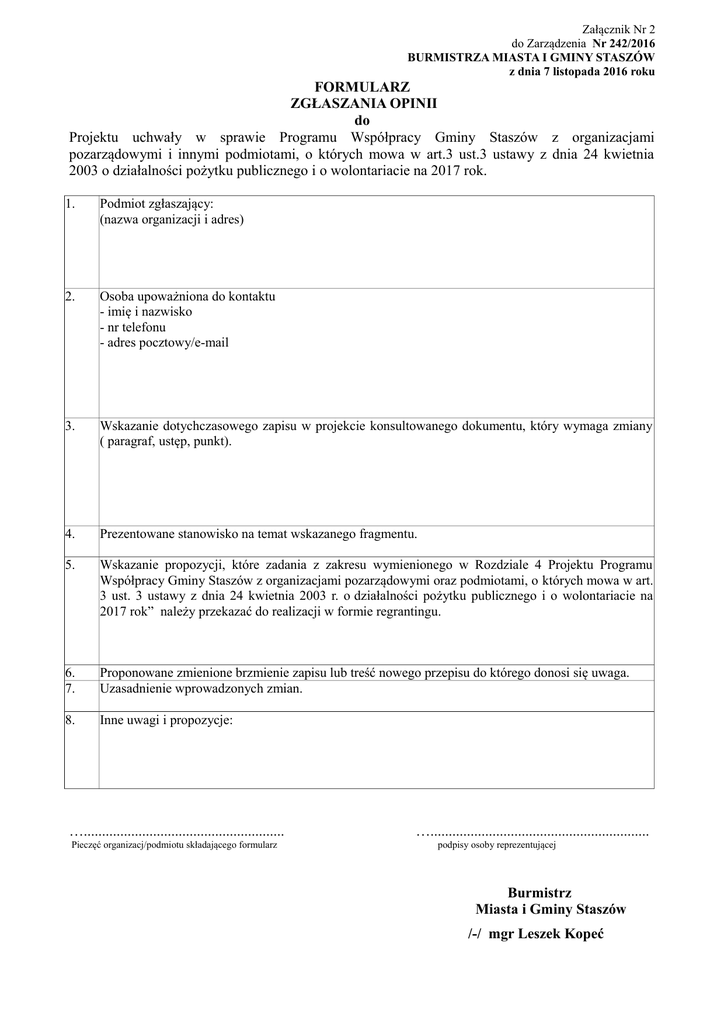 Załącznik Nr 2 do Zarządzenia Nr 242/2016 BURMISTRZA MIASTA I GMINY STASZÓW z dnia 7 listopada 2016 roku FORMULARZ ZGŁASZANIA OPINII do Projektu uchwały w sprawie Programu Współpracy Gminy Staszów z organizacjami pozarządowymi i innymi podmiotami, o których mowa w art.3 ust.3 ustawy z dnia 24 kwietnia 2003 o działalności pożytku publicznego i o wolontariacie na 2017 rok. 1. Podmiot zgłaszający: (nazwa organizacji i adres) 2. Osoba upoważniona do kontaktu - imię i nazwisko - nr telefonu - adres pocztowy/e-mail 3. Wskazanie dotychczasowego zapisu w projekcie konsultowanego dokumentu, który wymaga zmiany ( paragraf, ustęp, punkt). 4. Prezentowane stanowisko na temat wskazanego fragmentu. 5. Wskazanie propozycji, które zadania z zakresu wymienionego w Rozdziale 4 Projektu Programu Współpracy Gminy Staszów z organizacjami pozarządowymi oraz podmiotami, o których mowa w art. 3 ust. 3 ustawy z dnia 24 kwietnia 2003 r. o działalności pożytku publicznego i o wolontariacie na 2017 rok” należy przekazać do realizacji w formie regrantingu. 6. 7. Proponowane zmienione brzmienie zapisu lub treść nowego przepisu do którego donosi się uwaga. Uzasadnienie wprowadzonych zmian. 8. Inne uwagi i propozycje: …....................................................... Pieczęć organizacj/podmiotu składającego formularz …............................................................ podpisy osoby reprezentującej Burmistrz Miasta i Gminy Staszów /-/ mgr Leszek Kopeć Załącznik Nr 2 do Zarządzenia Nr 242/2016 BURMISTRZA MIASTA I GMINY STASZÓW z dnia 7 listopada 2016 roku