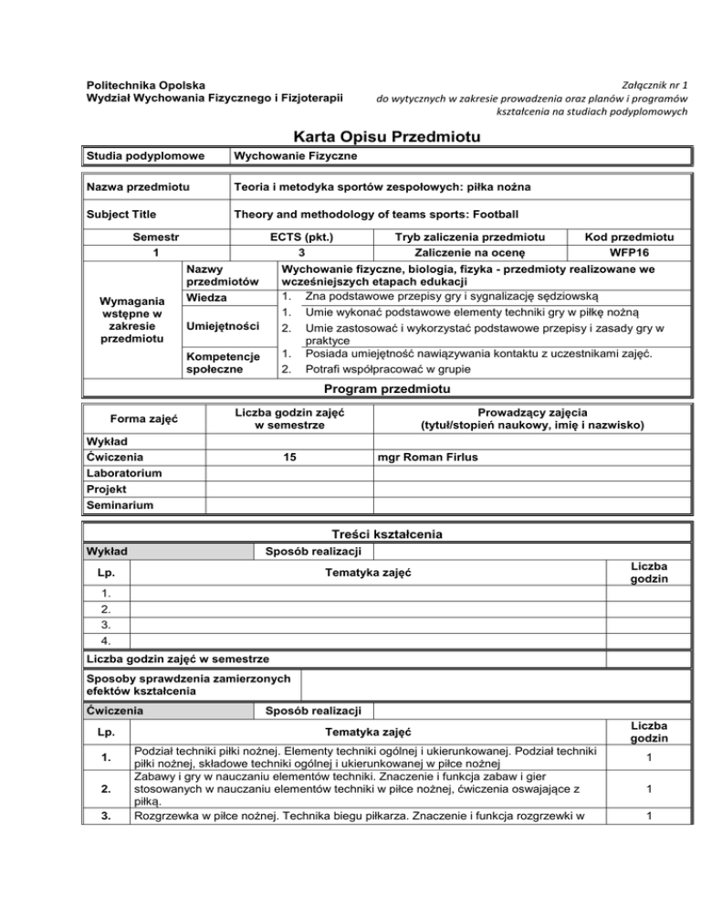 Politechnika Opolska Wydział Wychowania Fizycznego i Fizjoterapii Załącznik nr 1 do wytycznych w zakresie prowadzenia oraz planów i programów kształcenia na studiach podyplomowych Karta Opisu Przedmiotu Studia podyplomowe Wychowanie Fizyczne Nazwa przedmiotu Teoria i metodyka sportów zespołowych: piłka nożna Subject Title Theory and methodology of teams sports: Football Semestr 1 ECTS (pkt.) 3 Nazwy przedmiotów Wymagania wstępne w zakresie przedmiotu Tryb zaliczenia przedmiotu Zaliczenie na ocenę Kod przedmiotu WFP16 Wychowanie fizyczne, biologia, fizyka - przedmioty realizowane we wcześniejszych etapach edukacji 1. Zna podstawowe przepisy gry i sygnalizację sędziowską 1. Umie wykonać podstawowe elementy techniki gry w piłkę nożną 2. Umie zastosować i wykorzystać podstawowe przepisy i zasady gry w praktyce 1. Posiada umiejętność nawiązywania kontaktu z uczestnikami zajęć. 2. Potrafi współpracować w grupie Wiedza Umiejętności Kompetencje społeczne Program przedmiotu Forma zajęć Liczba godzin zajęć w semestrze Wykład Ćwiczenia Laboratorium Projekt 15 Prowadzący zajęcia (tytuł/stopień naukowy, imię i nazwisko) mgr Roman Firlus Seminarium Treści kształcenia Sposób realizacji Wykład Tematyka zajęć Lp. Liczba godzin 1. 2. 3. 4. Liczba godzin zajęć w semestrze Sposoby sprawdzenia zamierzonych efektów kształcenia Ćwiczenia Lp. 1. 2. 3. Sposób realizacji Tematyka zajęć Podział techniki piłki nożnej. Elementy techniki ogólnej i ukierunkowanej. Podział techniki piłki nożnej, składowe techniki ogólnej i ukierunkowanej w piłce nożnej Zabawy i gry w nauczaniu elementów techniki. Znaczenie i funkcja zabaw i gier stosowanych w nauczaniu elementów techniki w piłce nożnej, ćwiczenia oswajające z piłką. Rozgrzewka w piłce nożnej. Technika biegu piłkarza. Znaczenie i funkcja rozgrzewki w Liczba godzin 1 1 1 PN. Błędy popełniane podczas biegu. 4. 5. 6. 7. 8. 9. 10. 11. 12. 13. 14. 15. Prowadzenie piłki. Podział uderzeń piłki. Podział, metodyka, systematyka, technika wykonania, zasady oraz najczęściej popełniane błędy podczas prowadzenia piłki. Podział, metodyka i systematyka uderzeń piłki Uderzenie piłki wewnętrzna częścią stopy. Technika wykonania, metodyka i systematyka nauczania uderzenia piłki wewnętrzną częścią stopy. Najczęściej popełniane błędy. Uderzenie piłki prostym, wewnętrznym oraz zewnętrznym podbiciem. Technika wykonania, metodyka oraz systematyka uderzeń: a) prostym podbiciem, b) wewnętrznym podbiciem, c) zewnętrznym podbiciem Uderzenie piłki głową. Podział, technika wykonania, metodyka i systematyka uderzeń piłki głową. Najczęściej popełniane błędy podczas wykonania omawianych sposobów uderzeń. Przyjęcia piłki – podział i charakterystyka. Przyjęcie piłki podeszwą oraz przyjęcie piłki wewnętrzną częścią stopy. Podziały, metodyka i systematyka przyjęć piłki. Technika wykonania, metodyka nauczania oraz najczęściej popełniane błędy podczas przyjęć piłki: a) podeszwą, oraz b) wewnętrzną częścią stopy. Przyjęcie piłki prostym i zewnętrznym podbiciem. Technika wykonania, metodyka nauczania oraz błędy popełniane podczas przyjęć piłki:a) prostym podbiciem, b) zewnętrznym podbiciem Przyjęcia piłki z powietrza i w powietrzu. Technika wykonania, metodyka, wykorzystanie w grze oraz błędy popełniane przy przyjęciu piłki z powietrza :a) głową, b) klatką piersiową, c) udem. Zwody. Definicja, cele, podział, technika wykonania, metodyka i systematyka nauczania zwodów bez piłki i z piłka. Gra ciałem. Drybling. Definicja, technika wykonania, metodyka i systematyka oraz zasady prowadzenia gry ciałem. Definicja, składowe, technika wykonania oraz metodyka nauczania dryblingu. Odbieranie piłki przeciwnikowi. Wślizg. Sposoby odbierania piłki przeciwnikowi, podział i metodyka nauczania. Wślizg jako element techniki specjalnej. Technika, znaczenie i zasady gry wślizgiem. Wślizg nogą bliższą i nogą dalszą od przeciwnika. Technika gry bramkarza. Wyrzut piłki z autu. Sędziowanie. Specyfika gry bramkarza. Podział , metodyka i systematyka nauczania czynności bramkarza w obronie i ataku. Technika wykonania i zasady obowiązujące przy wrzucie piłki z linii bocznej. Sędziowanie. Próby sprawności fizycznej. Kolokwium zaliczeniowe. Omówienie oraz przeprowadzenie testów sprawności specjalnej. Zaliczenie praktyczne (sprawdzian umiejętności technicznych). Organizacja zawodów sportowych. Liczba godzin zajęć w semestrze Sposoby sprawdzenia zamierzonych efektów kształcenia Laboratorium Lp. 1 1 1 1 1 1 1 1 1 1 1 1 15 Sprawdzian umiejętności technicznych. Prowadzenie rozgrzewki. Sędziowanie. Sposób realizacji Tematyka zajęć Liczba godzin 1. 2. 3. 4. 5. Liczba godzin zajęć w semestrze Sposoby sprawdzenia zamierzonych efektów kształcenia Projekt Lp. Sposób realizacji Tematyka zajęć Liczba godzin 1. 2. Liczba godzin zajęć w semestrze Sposoby sprawdzenia zamierzonych efektów kształcenia Seminarium Sposób realizacji Tematyka zajęć Lp. Liczba godzin 1. 2. Liczba godzin zajęć w semestrze Sposoby sprawdzenia zamierzonych efektów kształcenia 1. Zna przepisy gry i sygnalizację sędziowską Wiedza Efekty kształcenia dla przedmiotu - po zakończonym cyklu kształcenia Umiejętności 3. Zna systematykę ćwiczeń i metodykę nauczania elementów technicznych 3. Zna podstawowe zasady taktycznego postępowania w ataku i w obronie 4. Zna przepisy i organizację gry w mini piłce nożnej 1. Posiada umiejętność zastosowania nauczanych elementów technicznych w grze 2. Posiada umiejętność sędziowania meczu piłki nożnej w zakresie podstawowym 3. Potrafi przeprowadzić część wstępną lekcji z piłki nożnej 4. Potrafi wykorzystać zabawy i gry w nauczaniu piłki nożnej. Posiada umiejętność pokazu i objaśnienia elementów technicznych 1. Posiada umiejętność nawiązywania kontaktu z uczes