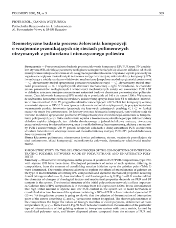 POLIMERY 2006, 51, nr 5 PIOTR KRÓL, JOANNA WOJTURSKA Politechnika Rzeszowska im. I. £ukasiewicza Al. Powstañców W-wy 6, 35-959 Rzeszów Reometryczne badania procesu ¿elowania kompozycji o wzajemnie przenikaj¹cych siê sieciach polimerowych otrzymanych z poliuretanu i nienasyconego poliestru Streszczenie — Przeprowadzono badania procesu ¿elowania kompozycji UP/PUR typu IPN z udzia³em styrenu (ST), okreœlaj¹c parametry reologiczne szeregu ró¿ni¹cych siê sk³adem uk³adów od chwili zainicjowania reakcji sieciowania a¿ do osi¹gniêcia punktu ¿elowania. Uzyskane wyniki pozwoli³y na wyjaœnienie wp³ywu makrokinetyki ¿elowania na typ tworz¹cej siê mikrostruktury kompozycji IPN i wynikaj¹ce z niej dynamiczne w³aœciwoœci mechaniczne [zespolony modu³ sprê¿ystoœci postaciowej — G*f ; dynamiczny modu³ sprê¿ystoœci postaciowej (zachowawczy) — G'f , dynamiczny modu³ stratnoœci postaciowej — G''f i wspó³czynnik stratnoœci mechanicznej — tgδ]. Stwierdzono, ¿e charakter zmian parametrów reologicznych i w³aœciwoœci mechanicznych zale¿y od zawartoœci PUR i ST w uk³adzie, znacznie mniejsze znaczenie ma natomiast budowa chemiczna pierwotnej sieci poliuretanowej. Czas ¿elowania kompozycji IPN mieœci siê w przedziale od 140 s do nawet 1300 s. Wykazano, ¿e szybszemu konstytuowaniu siê struktury usieciowanej sprzyja du¿a iloœæ ST w uk³adzie i niewielka w nim zawartoœæ PUR. W przypadku uk³adów zawieraj¹cych >20 % PUR lub kompozycji o ma³ej zawartoœci styrenu w UP (10 % mas.) proces ¿elowania zachodzi na tyle powoli, ¿e przyjête kryterium wyznaczania punktu ¿elowania (przeciêcie siê krzywych opisuj¹cych przebieg G'f i G''f w funkcji czasu) nie mo¿e byæ zastosowane. Im krótszy jest czas ¿elowania kompozycji, tym wiêksze staj¹ siê wartoœci modu³ów sprê¿ystoœci pod³u¿nej (Younga) tworzywa utwardzonego, oznaczane w temperaturze pokojowej ( E'f 20 °C). Takie zachowanie wynika z tworzenia siê okreœlonego typu mikrostruktury uk³adów szybko ¿eluj¹cych, tzn. uk³adu dwufazowego z jednosk³adnikow¹ matryc¹, utworzon¹ przez usieciowan¹ ¿ywicê poliestrow¹, oraz dwusk³adnikow¹ fazê rozproszon¹, z³o¿on¹ z mieszaniny PUR i usieciowanego UP. W powoli ¿eluj¹cych uk³adach o du¿ej zawartoœci PUR usieciowana struktura heterofazowa obejmuje natomiast dwusk³adnikow¹ matrycê PUR-UP i jednosk³adnikow¹ fazê rozproszon¹ UP. S³owa kluczowe: poliuretany, nienasycona ¿ywica poliestrowa, styren, wzajemnie przenikaj¹ce siê sieci polimerowe, sk³ad kompozycji, makrokinetyka ¿elowania, dynamiczne w³aœciwoœci mechaniczne. RHEOMETRIC STUDY ON THE GELATION PROCESS OF THE COMPOSITIONS OF INTERPENETRATING POLYMER NETWORKS MADE OF POLYURETHANE AND UNASTURATED POLYESTER Summary — Rheometric investigations on the process of gelation of UP/PUR compositions, type IPN, with styrene (ST) have been done. Rheological parameters of series of such systems, differing in compositions, from the moment of crosslinking reaction initiation up to the gelation point (Table 1) were determined. The results obtained allowed to explain the effects of macrokinetics of gelation on the type of microstructure of forming IPN composition and dynamic mechanical properties resulting from it (storage modulus — G'f , loss modulus G''f and loss tangent — tg δ) (Fig. 1—8). It was found that the character of changes of rheological factors and mechanical properties depends on PUR and ST contents in the system. The chemical structure of the initial polyurethane network is of less importance. Gelation time of IPN compositions is in the range from 140 s up to even 1300 s. It was demonstrated that high initial amount of styrene and low PUR content in the system led to faster formation of crosslinked structure. In cases of the systems containing > 20 % of PUR or low content of styrene in UP (10 wt. %) the gelation process is going so slowly that the criterion of determination of intersection point of the curves describing G'f and G''f versus time cannot be applied. The shorter gelation times of the compositions the larger the values of Young‘s modulus of cured polymers, determined at room temperature ( E'f 20 °C — Table 2 and 3, Fig. 9). Such behavior results from the formation of the particular type of microstructure of fast gelating systems i.e. two-phase system with unary matrix, formed by crosslinked polyester resin, and binary dispersed phase, composed from the mixture of PUR and 365 POLIMERY 2006, 51, nr 5 366 crosslinked UP. In slowly gelating systems with high PUR content the two-phase cured structure consists of binary PUR — UP matrix and unary UP dispersed phase. Key words: polyurethanes, unsaturated polyester resin, styrene, interpenetrating polymer networks, composition, macrokinetics of gelation, dynamic mechanical properties. Wzajemnie przenikaj¹ce siê sieci polimerowe (IPN) — to unikatowe i zarazem skomplikowane uk³ady, stanowi¹ce kompozycje z³o¿one z dwu lub wiêkszej liczby polimerów, z których przynajmniej jeden wystêpuje w postaci przestrzennie usieciowanej. System taki tworzy siê w wyniku zachodz¹cych niemal równoczeœnie reakcji polimeryzacji ró¿nych monomerów, przebiegaj¹cych najczêœciej wg odmiennych mechanizmów — np. polimeryzacji lub sieciowania rodnikowego jednego sk³adnika sieci w obecnoœci drugiego, utworzonego np. w procesie polimeryzacji kondensacyjnej lub addycyjnej. Z powodu odmiennych w³aœciwoœci fizykochemicznych elementów strukturalnych tworz¹cych kompozycje IPN, s¹ one na ogó³ uk³adami heterogenicznymi o z³o¿onej budowie nadcz¹steczkowej. Morfologia takich uk³adów zale¿y od dwóch czynników: wyjœciowej mieszalnoœci sk³adników a tak¿e od szybkoœci konkuruj¹cych ze sob¹ procesów ¿elowania (sieciowania) oraz separacji fazowej, zachodz¹cych w temperaturze przetwarzania i ostatecznego formowania wyrobu [1]. Szybkoœæ procesu separacji fazowej jest zwykle zdec