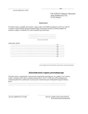...................................................... ..............................................dnia …......................... pieczęć nagłówkowa szkoły P.W. KWANT Zbigniew Skoczylas Aleja Solidarności 15A 25-323 Kielce Zamówienie W trybie Ustawy o podatku od towarów i usług z dnia 11.03.2004 na podstawie art 83 ust.1 pkt 26 w sprawie wykorzystania sprzętu komputerowego, do którego stosuje się stawkę podatku od towarów i usług w wysokości 0 % oraz warunków jej stosowania ….................................................................. ….................................................................. ….................................................................. nazwa, adres i NIP szkoły zamawiany sprzęt: …................................................................................................................ - szt ….......... …................................................................................................................ - szt ….......... …................................................................................................................ - szt ….......... …................................................................................................................ - szt ….......... …................................................................................................................ - szt ….......... …................................................................................................................ - szt ….......... …................................................................................................................ - szt ….......... …................................................................................................................ - szt ….......... …....................................................................................... pieczęć i podpis osoby upoważnionej do występowania w imieniu zamawiającego Zaświadczenie organu prowadzącego W trybie ustawy wymienionej w powyższym zamówieniu zaświadczam, że z godnie z art.5 ustawy z dnia 7 września 1991 roku o systemie oświaty (Dz.U. Nr 67 z 1996, poz.329 z późniejszymi zmianami) placówka wymieniona w powyższym zamówieniu jest szkołą publiczną prowadzoną przez: …................................................................................................................................................ …................................................................................................................................................ …........................................……. pieczęć nagłówkowa Urzędu …………………………………………………... pieczęć i podpis osoby upoważnionej do wystawienia zaświadczenia