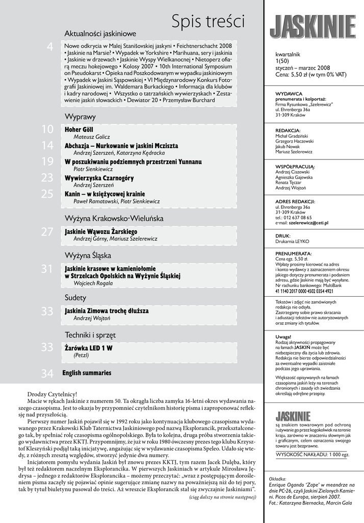 Aktualności jaskiniowe 4 10 14 19 23 25 Spis treści Nowe odkrycia w Malej Stanišovskiej jaskyni • Feichtnerschacht 2008 • Jaskinie na Marsie? • Wypadek w Yorkshire • Marihuana, sery i jaskinia • Jaskinie w drzewach • Jaskinie Wyspy Wielkanocnej • Nietoperz ofiarą meczu hokejowego • Kolosy 2007 • 10th International Symposium on Pseudokarst • Opieka nad Poszkodowanym w wypadku jaskiniowym • Wypadek w Jaskini Sąspowskiej • VI Międzynarodowy Konkurs Fotografii Jaskiniowej im. Waldemara Burkackiego • Informacja dla klubów i kadry narodowej • Wszystko o tatrzańskich wywierzyskach • Zestawienie jaskiń słowackich • Dewiator 20 • Przemysław Burchard Wyprawy Hoher Göll Abchazja – Nurkowanie w jaskini Mcziszta Andrzej Szerszeń, Katarzyna Kędracka W poszukiwaniu podziemnych przestrzeni Yunnanu Piotr Sienkiewicz Wywierzyska Czarnogóry Andrzej Szerszeń Kanin – w księżycowej krainie Paweł Ramatowski, Piotr Sienkiewicz Jaskinie Wąwozu Żarskiego PRENUMERATA: Cena egz. 5,50 zł. Wpłaty prosimy kierować na adres i konto wydawcy z zaznaczeniem okresu jakiego dotyczy prenumerata i podaniem adresu, gdzie Jaskinie mają być wysyłane. Nr rachunku bankowego: MultiBank Jaskinie krasowe w kamieniołomie w Strzelcach Opolskich na Wyżynie Śląskiej 41 1140 2017 0000 4502 0354 4921 Sudety 33 34 WSPÓŁPRACUJĄ: Andrzej Ciszewski Agnieszka Gajewska Renata Tęczar Andrzej Wojtoń DRUK: Drukarnia LEYKO Andrzej Górny, Mariusz Szelerewicz Wojciech Rogala 33 WYDAWCA prenumerata i kolportaż: Firma Rysunkowa „Szelerewicz” ul. Ehrenberga 36a 31-309 Kraków ADRES REDAKCJI: ul. Ehrenberga 36a 31-309 Kraków tel.: 012 637 08 65 e-mail: [email protected] Wyżyna Śląska 31 kwartalnik 1(50) styczeń – marzec 2008 Cena: 5,50 zł (w tym 0% VAT) REDAKCJA: Michał Gradziński Grzegorz Haczewski Jakub Nowak Mariusz Szelerewicz Mateusz Golicz Wyżyna Krakowsko-Wieluńska 27 ® Tekstów i zdjęć nie zamówionych redakcja nie odsyła. Zastrzegamy sobie prawo skracania i adiustacji tekstów nie autoryzowanych oraz zmiany ich tytułów. Jaskinia Zimowa trochę dłuższa Andrzej Wojtoń Techniki i sprzęt Uwaga! Rodzaj aktywności propagowany na łamach JASKIŃ może być niebezpieczny dla życia lub zdrowia. Redakcja nie bierze odpowiedzialności za ewentualne wypadki zaistniałe podczas jego uprawiania. Żarówka LED 1 W (Petzl) English summaries Większość opisywanych na łamach czasopisma jaskiń leży na terenach chronionych i zasady ich zwiedzania określają odrębne przepisy. Drodzy Czytelnicy! Macie w rękach Jaskinie z numerem 50. Ta okrągła liczba zamyka 16-letni okres wydawania naszego czasopisma. Jest to okazja by przypomnieć czytelnikom historię pisma i zaproponować refleksję nad przyszłością. Pierwszy numer Jaskiń pojawił się w 1992 roku jako kontynuacja klubowego czasopisma wydawanego przez Krakowski Klub Taternictwa Jaskiniowego pod nazwą Eksplorancik, przekształconego tak, by spełniać rolę czasopisma ogólnopolskiego. Była to kolejna, druga próba stworzenia takiego wydawnictwa przez KKTJ. Przypomnijmy, że już w roku 1980 ówczesny prezes tego klubu Krzysztof Kleszyński podjął taką inicjatywę, angażując się w wydawanie czasopisma Speleo. Udało się wtedy, z różnych zresztą względów, stworzyć jedynie dwa numery. Inicjatorem pomysłu wydania Jaskiń był znowu prezes KKTJ, tym razem Jacek Dulęba, który był też redaktorem naczelnym Eksplorancika. W pierwszych Jaskiniach w artykule Mirosława Jędrysa – jednego z redaktorów Eksplorancika – możemy przeczytać: „wraz z postępującym dorośleniem pisma zaczęły się pojawiać opinie sugerujące zmianę nazwy na poważniejszą niż do tej pory, tak by tytuł biuletynu pasował do treści. Aż wreszcie Eksplorancik stał się zwyczajnie Jaskiniami”. (ciąg dalszy na stronie następnej) ® są znakiem towarowym pod ochroną i używanie go przez kogokolwiek na terenie kraju, zarówno w znaczeniu słownym jak i graficznym, celem oznaczenia swojego towaru jest bezprawne. WYSOKOŒÆ NAK£ADU: 1 000 egz. Okładka: Enrique Ogando ‘Zape’ w meandrze na dnie PC-26, czyli Jaskini Zielonych Kamieni. Picos de Europa, sierpień 2007. Fot.: Katarzyna Biernacka, Marcin Gala
