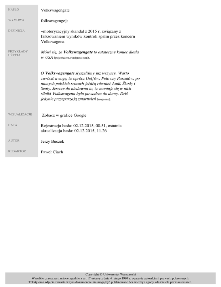 HASŁO Volkswagengate WYMOWA folkswagengejt DEFINICJA «motoryzacyjny skandal z 2015 r. związany z fałszowaniem wyników kontroli spalin przez koncern Volkswagena» PRZYKŁADY UŻYCIA Mówi się, że Volkswagengate to ostateczny koniec diesla w USA (pojechalem.wordpress.com). O Volkswagengate słyszeliśmy już wszyscy. Warto zwrócić uwagę, że oprócz Golfów, Polo czy Passatów, po naszych polskich szosach jeżdżą również Audi, Škody i Seaty. Jeszcze do niedawna to, że montuje się w nich silniki Volkswagena było powodem do dumy. Dziś jedynie przysparzają zmartwień (srogo.me). WIZUALIZACJE Zobacz w grafice Google DATA Rejestracja hasła: 02.12.2015, 00.51, ostatnia aktualizacja hasła: 02.12.2015, 11.26 AUTOR Jerzy Buczek REDAKTOR Paweł Ciach Copyright © Uniwersytet Warszawski Wszelkie prawa zastrzeżone zgodnie z art.17 ustawy z dnia 4 lutego 1994 r. o prawie autorskim i prawach pokrewnych. Teksty oraz zdjęcia zawarte w tym dokumencie nie mogą być publikowane bez wiedzy i zgody właściciela praw autorskich. Powered by TCPDF (www.tcpdf.org)