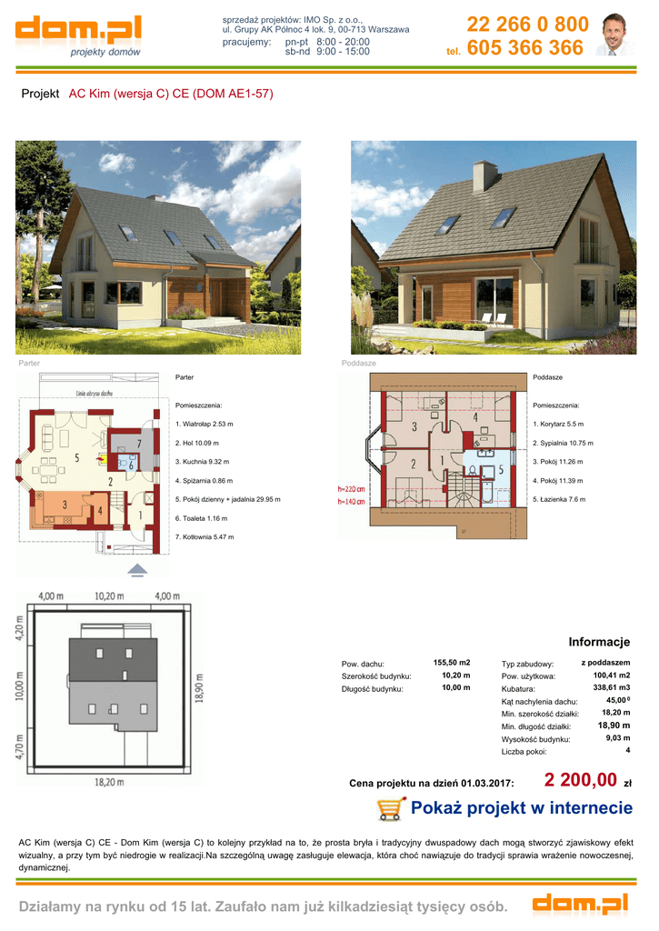 22 266 0 800 tel. 605 366 366 sprzedaż projektów: IMO Sp. z o.o., ul. Grupy AK Północ 4 lok. 9, 00-713 Warszawa pracujemy: pn-pt 8:00 - 20:00 sb-nd 9:00 - 15:00 Projekt AC Kim (wersja C) CE (DOM AE1-57) Parter Poddasze Parter Poddasze Pomieszczenia: Pomieszczenia: 1. Wiatrołap 2.53 m 1. Korytarz 5.5 m 2. Hol 10.09 m 2. Sypialnia 10.75 m 3. Kuchnia 9.32 m 3. Pokój 11.26 m 4. Spiżarnia 0.86 m 4. Pokój 11.39 m 5. Pokój dzienny + jadalnia 29.95 m 5. Łazienka 7.6 m 6. Toaleta 1.16 m 7. Kotłownia 5.47 m Informacje 155,50 m2 Typ zabudowy: z poddaszem Szerokość budynku: 10,20 m Pow. użytkowa: 100,41 m2 Długość budynku: 10,00 m Kubatura: 338,61 m3 Pow. dachu: Kąt nachylenia dachu: 45,00 0 Min. szerokość działki: 18,20 m Min. długość działki: 18,90 m Wysokość budynku: 9,03 m Liczba pokoi: Cena projektu na dzień 01.03.2017: 2 200,00 4 zł Pokaż projekt w internecie AC Kim (wersja C) CE - Dom Kim (wersja C) to kolejny przykład na to, że prosta bryła i tradycyjny dwuspadowy dach mogą stworzyć zjawiskowy efekt wizualny, a przy tym być niedrogie w realizacji.Na szczególną uwagę zasługuje elewacja, która choć nawiązuje do tradycji sprawia wrażenie nowoczesnej, dynamicznej. Działamy na rynku od 15 lat. Zaufało nam już kilkadziesiąt tysięcy osób.