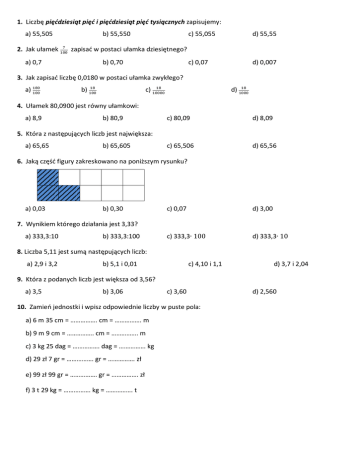 1. Liczbę pięćdziesiąt pięć i pięćdziesiąt pięć tysiącznych zapisujemy: a) 55,505 2. Jak ułamek b) 55,550 c) 55,055 d) 55,55 c) 0,07 d) 0,007 zapisać w postaci ułamka dziesiętnego? a) 0,7 b) 0,70 3. Jak zapisać liczbę 0,0180 w postaci ułamka zwykłego? a) b) c) d) 4. Ułamek 80,0900 jest równy ułamkowi: a) 8,9 b) 80,9 c) 80,09 d) 8,09 c) 65,506 d) 65,56 5. Która z następujących liczb jest największa: a) 65,65 b) 65,605 6. Jaką część figury zakreskowano na poniższym rysunku? a) 0,03 b) 0,30 c) 0,07 d) 3,00 c) 333,3 d) 333,3 7. Wynikiem którego działania jest 3,33? a) 333,3:10 b) 333,3:100 8. Liczba 5,11 jest sumą następujących liczb: a) 2,9 i 3,2 b) 5,1 i 0,01 c) 4,10 i 1,1 d) 3,7 i 2,04 9. Która z podanych liczb jest większa od 3,56? a) 3,5 b) 3,06 c) 3,60 10. Zamień jednostki i wpisz odpowiednie liczby w puste pola: a) 6 m 35 cm = ……………. cm = ……………. m b) 9 m 9 cm = ……………. cm = ……………. m c) 3 kg 25 dag = ……………. dag = ……………. kg d) 29 zł 7 gr = ……………. gr = ……………. zł e) 99 zł 99 gr = ……………. gr = ……………. zł f) 3 t 29 kg = ……………. kg = ……………. t d) 2,560 11. Oblicz: = ……………………………………………………………………………………………………………………... Obliczenia pomocnicze: 12. Ania ma 1,6 metra wzrostu. Kasia jest o 0,11 metra wyższa niż Ania. Jaki wzrost ma Kasia? ODP: …………………………………………………………………………………………………….. 13. Wielka piramida Cheopsa w Egipcie początkowo miała 146,5 m wysokości. Po utracie najwyższego kamienia ma obecnie 137 m. O ile metrów piramida Cheopsa jest teraz niższa? ODP: …………………………………………………………………………………………………….. 14. Marta kupiła spódnicę za 46,50 zł i bluzkę za 26,40 zł. Ile reszty otrzymała ze 100 zł? ODP: …………………………………………………………………………………………………….. 15. Karol kupił 10 dag drożdży i 20 dag żółtego sera i słodycze. Dał kasjerce 10 zł i otrzymał 2,40 zł reszty. Zapamiętał, że cena 1 kg drożdży była taka sama jak 1 kg sera: po 18 zł za 1 kg. Ile Karol zapłacił za słodycze? ODP: ……………………………………………………………………………………………………..
