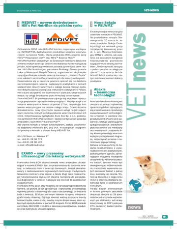 VET-NEWS news 63-100 Śrem, ul. Szkolna 17 tel. +48 61 28 30 773 fax +48 61 28 30 170 e-mail: offi[email protected] EXAGO – nowy przenośny ultrasonograf dla lekarzy weterynarii! Francuska firma ECM skonstruowała nowy przenośny ultrasonograf o nazwie EXAGO. Jest on przeznaczony do badania zwierząt, a zwłaszcza koni i zwierząt domowych. Został skonstruowany z zastosowaniem najnowszych technologii medycznych. Niewielkie rozmiary oraz ciężar, a także długi czas niezależnego funkcjonowania czynią zeń idealne narzędzie do prowadzenia diagnostyki w terenie, nadające się również do zastosowań stacjonarnych. Francuska firma ECM, przy wsparciu jej kanadyjskiego udziałowca Noveko, od ponad 25 lat opracowuje i wprowadza do sprzedaży wysokiej jakości ultrasonografy czasu rzeczywistego do badania ludzi i zwierząt. ECM jest uznanym liderem na rynku ultrasonografii trzody chlewnej. Zajmuje również ważną pozycję w branży hodowli bydła, owiec i kóz, między innymi dzięki swojej sieci wyłącznych dystrybutorów w ponad 55 krajach. Firma ECM posiada certyfikaty ISO 9001 i 13485 w zakresie projektowania, produkcji oraz dystrybucji ultrasonografów. Nowa Sekcja w PSLWMZ Endokrynologia weterynaryjna zaistniała wreszcie w PSLWMZ. Na posiedzeniu zarządu Stowarzyszenia 20 marca br. została powołana Sekcja Endokrynologii na wniosek grupy inicjatywnej kierowanej przez dr. n. wet. Marcina Gołyńskiego z WMW w Lublinie. Jak ustalono, na dorocznym kongresie Stowarzyszenia planowane są jej pierwsze obrady pod hasłem „Niedoczynność tarczycy u psów – popatrz na całego pacjenta!”. Liczymy na to, że działalność Sekcji spotka się z dużym zainteresowaniem lekarzy praktyków. Abaxis – kosmiczna technologia! Amerykańska firma Abaxis jest uważana za jedną z najbardziej dynamicznych firm zajmujących się projektowaniem i produkcją zaawansowanych technologicznie urządzeń w zakresie diagnostyki point-of-care (przy pacjencie). Oferuje szeroką gamę specjalistycznych produktów przeznaczonych dla medycyny oraz weterynarii. Urządzenia firmy Abaxis pozwalają lekarzom lepiej i szybciej stawiać diagnozę, rozpoczynać leczenie i monitorować jego przebieg. Główna innowacja firmy to badania biochemiczne z wykorzystaniem serii plastykowych, jednorazowych dysków, zawierających wszystkie niezbędne odczynniki do wykonania zestawu badań. System może być obsługiwany po krótkim szkoleniu i umożliwia wykonanie całych zestawów badań z pełnej krwi, surowicy lub osocza. Wyniki są dostępne w ciągu kilku minut z precyzją dostępną dotychczas tylko w laboratorium klinicznym. Paleta badań oferowanych w formie gotowych zestawów obejmuje obecnie aż 29 parametrów: od enzymów wątrobowych po elektrolity, od kinazy kreatynowej po CRP i pokrywa 97% zlecanych badań biochemicznych. VET news Od kwietnia 2010 roku Hill’s Pet Nutriton rozpoczyna współpracę z MEDiVET SA, dystrybutorem produktów i sprzętów weterynaryjnych na terenie Polski. Oferta produktów Hill’s obejmie serię Hill’sTM Prescription DietTM oraz Hill’sTM Science PlanTM. Hill’s Pet Nutrition jest jednym ze światowych liderów w dziedzinie żywienia małych zwierząt, od wielu lat dostarcza karmy najwyższej jakości, które spełniają określone potrzeby żywieniowe psów i kotów. Hill’s Pet Nutrition jest partnerem Polskiego Stowarzyszenia Lekarzy Weterynarii Małych Zwierząt, organizatorem akcji wspierającej profilaktykę zdrowia zwierząt domowych „Uśmiech Pupila” oraz szkoleń i seminariów prowadzonych dla lekarzy weterynarii. Doskonalenie się w zawodzie powinno opierać się na dzieleniu się kompetencjami, wiedzą i najlepszymi praktykami w ramach społeczności lekarzy weterynarii z całego świata. Ceniąc zaufanie i dotychczasową współpracę z lekarzami weterynarii w Polsce, Hill’s stara się spełnić ich oczekiwania i stale poszukuje nowych metod, by usługi świadczone przez firmę były coraz lepsze. Firma MEDiVET SA profesjonalnie zajmuje się importem i dystrybucją preparatów i sprzętów weterynaryjnych. Współpracuje z lekarzami weterynarii w Polsce od ponad 17 lat, zaopatrując hurtownie weterynaryjne na terenie całego kraju. Dzięki dużemu doświadczeniu, nowy dystrybutor zapewni usługi na jak najwyższym poziomie, których oczekują lekarze weterynarii i klienci ich klinik. Dotychczasowy dystrybutor, Euro Zoo Sp. z o.o., pozostanie partnerem Hill’s Pet Nutrition i będzie kontynuował sprzedaż produktów z serii Hill’sTM Science PlanTM. Aby ułatwić kontakt z nowym dystrybutorem, została uruchomiona bezpłatna infolinia 0 800 161 004. W razie pytań i wątpliwości prosimy o kontakt z biurem firmy MEDiVET SA. news MEDiVET – nowym dystrybutorem Hill’s Pet Nutrition na polskim rynku news news WETERYNARIA W PRAKTYCE news MAJ • 5/2010 www.weterynaria.elamed.pl 91