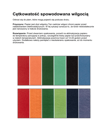 Cętkowatość spowodowana wilgocią Odnosi się do plam, które mogą pojawić się podczas druku. Przyczyna: Papier jest zbyt wilgotny.Ten nadmiar wilgoci chroni papier przed naładowaniem elektrostatycznym. W tej sytuacji oznacza to, że toner niedostatecznie jest nanoszony w trakcie drukowania. Rozwiązanie: Przed otwarciem opakowania, pozwól na aklimatyzację papieru do temperatury panującej w pokoju, szczególnie kiedy papier był przechowywany w niskich temperaturach. Aklimatyzacja powinna trwać od 12-24 godzin przed użyciem. Dodatkowo należy pamiętać o nieotwieraniu opakowania, aż do momentu drukowania. Częściowe wymazanie Wada pojawiająca się zazwyczaj w obszarze zadrukowanym. Przyczyna: Wilgotność papieru jest niedostateczna. W rezultacie czego, papier traci przewodnictwo, a to jest istotne dla nanoszenia toneru podczas drukowania. Papier posiada zbyt dużą oporność elekrostatyczną - jego ładunek elektryczny w trakcie nanoszenia tonera jest zbyt słaby. Rozwiązanie: Po pierwsze, jeżeli otaczające środowisko jest za suche, papier traci wilgoć. Dlatego też papieru nie powinno się otwierać, aż do momentu drukowania. Druga możliwa przyczyna wystąpienia problemu to kiedy drukujemy dwustronnie. Papier raz już przeszedł przez utrwalacz, gdzie panowała temperatura ok. 200°C, która pozbawiła papier wilgoci. W takim przypadku zalecamy najpierw drukować stronę, na której będzie więcej kolorów. Wymazanie Przyczyna: Bardzo często wymazania powstają na skutek marszczenia się papieru. Jeśli papier nie leży płasko na bębnach toner nie jest dobrze nanoszony w tych miejscach. Rozwiązanie: Nie otwieraj opakowania, aż do momentu drukowania. Pozwól, aby papier osiągnął temperaturę panującą w pomieszczeniu. Pozostaw go w zamkniętym opakowaniu na okres 12-24 godzin przed rozpoczęciem drukowania. Sposób wyżej opisany jest szczególnie zalecany w przypadku, gdy papier był przechowywany w chłodnym otoczeniu. Dwustronne wydruki są często niekompletne, kiedy papier jest przechowywany w niekorzystnych warunkach pomiędzy pierwszym drukowaniem a kolejnym na drugiej stronie. Pęcherzykowatość na papierze powlekanym Przyczyna: Dla osiągnięcia wysokiego połysku papier powlekany ma zabezpieczoną powierzchnię. Stosując suchy toner papier może zbyt szybko utracić wilgoć - gdy ustawienia drukarki są niewłaściwe. Rozwiązanie: Jeśli to konieczne należy obniżyć temperaturę wałków utrwalacza, kiedy używamy papieru powlekanego Color Copy. Ogólnie mówiąc, powinniśmy stosować się do wskazówek udzielanych przez producenta drukarek i przechowywa ć właściwie papier. Pęknięcie na zgięciu Przyczyna: Kiedy używamy wyższych gramatur, włókna papieru powlekanego mogą być zbyt naciągnięte. Rozwiązanie: Zagięcie zawsze powinno iść zgodnie z kierunkiem pracy maszyny (w tym samym kierunku co włókna arkusza). Pozwól papierowi ponownie wchłonąć wilgoć z otoczenia, wówczas włókna staną się bardziej elastyczne. Gramatury od 120g/m2 koniecznie muszą być zginane również we właściwym kierunku. Wskazówka: Przy ustawianiu marginesów zwrócić uwagę, aby drukowany obraz był ponad zgięciem. Pre-printy z Color Copy Wskazówki przechowywania i zadrukowywania Color Copy jest papierem niepowlekanym do dwustronnego zadrukowywania. Jego doskonała struktura czyni go nieporównywalnym do papieru powlekanego. Color Copy jest odpowiedni dla pre-printów. Jednakże należy zwrócić uwagę na kilka szczegółów. Należy zapewnić Color Copy warunki wymagane przy druku offsetowym. Color Copy zawiera mniej wilgoci niż papier offsetowy. Zawartość wilgoci w papierze nie jest równoważna z wilgotnością panującą w pomieszczeniu klimatyzowanym. Jeśli papier przechowujemy lub używamy niewłaściwie może wchłonąć za dużo wilgoci, co powoduje zaginanie krawędzi, a w końcu falowanie po cyfrowym drukowaniu. Z tego powodu musimy pamiętać, aby: • • • • Trzymać papier w zapieczętowanym opakowaniu. Nie zostawiać papieru w wilgotnym środowisku na długi czas (a nigdy na całą noc). Po offsetowym zadrukowaniu, Color Copy umieścić w szczelnym środowisku, sugerujemy niezwłocznie opakować materiałem chroniącym przed wilgocią lub użyć plastykowych pudełek. Upewnić się, że warunki panujące w pomieszczeniu, w którym wykonujemy druk są suche, jak tylko to możliwe. Color Copy i druk offsetowy Niepowlekany papier Color Copy absorbuje farbę drukarską nieporównanie wolno. Z tego powodu konieczne jest używanie tylko szybko schnących farb. Jeśli planowane jest dalsze laserowe drukowanie, musimy użyć farby kompatybilnej z laserem, oraz powinniśmy pozwolić papierowi na odleżenie przez cztery do pięciu dni po drukowaniu. Zalecane jest użycie dodatkowych suszarek w miarę możliwości. Preferowane są szybko schnące i hitsetowe farby. W żadnym wypadku nie używać przyśpieszających schnięcie preparatów. Zawsze przed ponowanym drukowaniem na Color Copy, daj papierowi czas na wchłonięcie farby i wyschnięcie. Rekomendujemy także, żeby ilość arkuszy ułożonych w stos była minimalna, w celu uniknięcia refelksów. Kilka wskazówek jak pomóc farbie wyschnąć: • • • • • Używać minimalnej ilości zwilżacza. Wskaźnik pH zwilżacza nie powinien być niższy niż 5,5. W żadnym wypadku nie wolno używać zbytnio skoncentrowanego zwilżacza. Jeśli zajdzie konieczność zalecamy użycie suszarki. Unikać emulsyfikacji farby drukarskiej.