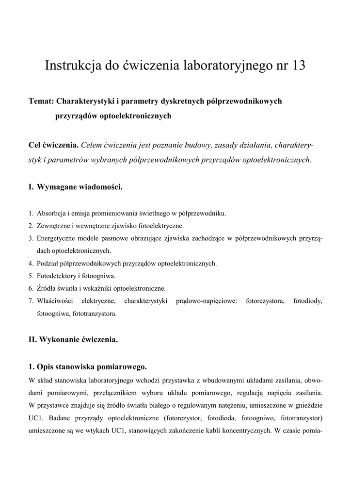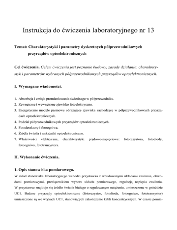 Instrukcja do ćwiczenia laboratoryjnego nr 13 Temat: Charakterystyki i parametry dyskretnych półprzewodnikowych przyrządów optoelektronicznych Cel ćwiczenia. Celem ćwiczenia jest poznanie budowy, zasady działania, charakterystyk i parametrów wybranych półprzewodnikowych przyrządów optoelektronicznych. I. Wymagane wiadomości. 1. Absorbcja i emisja promieniowania świetlnego w półprzewodniku. 2. Zewnętrzne i wewnętrzne zjawisko fotoelektryczne. 3. Energetyczne modele pasmowe obrazujące zjawiska zachodzące w półprzewodnikowych przyrządach optoelektronicznych. 4. Podział półprzewodnikowych przyrządów optoelektronicznych. 5. Fotodetektory i fotoogniwa. 6. Źródła światła i wskaźniki optoelektroniczne. 7. Właściwości elektryczne, charakterystyki prądowo-napięciowe: fotorezystora, fotodiody, fotoogniwa, fototranzystora. II. Wykonanie ćwiczenia. 1. Opis stanowiska pomiarowego. W skład stanowiska laboratoryjnego wchodzi przystawka z wbudowanymi układami zasilania, obwodami pomiarowymi, przełącznikiem wyboru układu pomiarowego, regulacją napięcia zasilania. W przystawce znajduje się źródło światła białego o regulowanym natęŜeniu, umieszczone w gnieździe UC1. Badane przyrządy optoelektroniczne (fotorezystor, fotodioda, fotoogniwo, fototranzystor) umieszczone są we wtykach UC1, stanowiących zakończenie kabli koncentrycznych. W czasie pomia- rów są one dołączane do źródła światła, które jest zamocowane na bocznej ściance przystawki. Połączenie badanych elementów z odpowiednimi obwodami znajdującymi się wewnątrz przystawki realizuje się przez złącza BNC. Załączenia obwodów pomiarowych dokonuje się przez ustawienie, w odpowiedniej pozycji, przełącznika wyboru układu pomiarowego. w odpowiedniej pozycji W skład stanowiska laboratoryjnego wchodzi takŜe: zasilacz napięcia stałego (dołączany do przystawki) oraz przyrządy pomiarowe (amperomierz, woltomierze), które są dołączane w miejscach oznaczonych na płycie czołowej przystawki. 2. Pomiar charakterystyk statycznych diod elektroluminescencyjnych. Pomiary charakterystyk statycznych diod elektroluminescencyjnych dokonuje się w układzie przedstawionym na rys. 1. W układzie pomiarowym znajduje się 6 diod LED, emitujących światło o róŜnych długościach fali. Pomiary przeprowadza się w zakresie prądowym IFmax = 10 mA. A IF UF V Rys. 1. Schemat układu do pomiaru charakterystyk statycznych diod elektroluminescencyjnych. 2.1. Pomiar charakterystyki diody elektroluminescencyjnej w kierunku przewodzenia IF = f(UF). 1. Przy pomocy przełącznika dokonać wyboru w przystawce układu do pomiaru charakterystyk statycznych diod LED. 2. Dołączyć zasilacz do przystawki zachowując wskazaną na płycie czołowej polaryzację napięcia zasilania. Połączyć układ do pomiarów zgodnie ze schematem przedstawionym na rys. 1 włączając przyrządy pomiarowe w miejscach oznaczonych na płycie czołowej przystawki. 2 3. Wybrać odpowiednie zakresy na przyrządach pomiarowych. Włączyć zasilacz oraz przyrządy pomiarowe. Ustawić na zasilaczu podaną na przystawce wartość napięcia zasilania. 4. Przy pomocy przełącznika wybrać diodę przeznaczoną do pomiarów, np. D1. 5. Przy pomocy pokrętła regulacji źródła prądowego ustalić wartość prądu IF = 0,1 mA, Odczytać wartość napięć UF. 6. Zmieniać kolejno zadane wartości prądu IF (do wartości IFmax= 10 mA) i odczytywać odpowiadające im wartości napięć UF. Wyniki pomiarów umieścić w Sprawozdaniu nr 7, w tabeli 1. 7. W wyŜej opisany sposób dokonać pomiarów charakterystyk IF = f(UF) dwóch wybranych diod elektroluminescencyjnych. Wyniki pomiarów umieścić w tabeli 1. 3. Pomiar charakterystyk statycznych fotorezystora. Pomiaru charakterystyk statycznych fotorezystora dokonuje się w układzie pomiarowym którego schemat przedstawiony jest na rys. 2. A I U E V Rys. 2. Schemat układu do pomiaru charakterystyk statycznych fotorezystora. 3.1. Pomiar charakterystyki prądowo - napięciowej fotorezystora I = f(U) przy E = const. 1. Przy pomocy przełącznika dokonać wyboru w przystawce układu do pomiaru charakterystyk statycznych fotorezystora. 2. Dołączyć zasilacz zachowując wskazaną na płycie czołowej polaryzację napięcia zasilania. Połączyć układ do pomiarów zgodnie ze schematem przedstawionym na rys. 2. Dołączyć przyrządy pomiarowe w miejscach oznaczonych na płycie czołowej przystawki. 3 3. Dołączyć badany fotorezystor do źródła światła oraz układu pomiarowego, w miejscu oznaczonym na płycie czołowej przystawki. 4. Wybrać odpowiednie zakresy na przyrządach pomiarowych. Włączyć zasilacz oraz przyrządy pomiarowe. Ustawić na zasilaczu podaną na przystawce wartość napięcia zasilania. 5. Dokonać pomiaru charakterystyki I = f(U) przy E = const., dla kilku wybranych wartości natęŜenia oświetlenia E, zmieniając wartości napięcia U w przedziale od U = 0 V do wartości, przy której spełniona będzie zaleŜność I • U < PMax (praktycznie I ≤ 10 mA, U ≤ 5 V). Pomiary wykonać przynajmniej w pięciu punktach dla kaŜdej charakterystyki. Wyniki pomiarów umieścić w Sprawozdaniu nr 7, w tabeli 2. 3.2. Pomiar charakterystyki sterowania fotorezystora I = f(E) przy U = const. 1. Wykonać czynności podane w podpunktach 1-4, zawartych w p.3.1 instrukcji. 2. Dla wybranych wartości natęŜenia oświetlenia E, przy których spełniona jest zaleŜność I • U < PMax (praktycznie I ≤ 10 mA, U ≤ 5 V) zdjąć charakterystykę I= f(E), dla ustalonych wartości. Wyniki pomiarów umieścić w Sprawozdaniu nr 7, w tabeli 3. 4. Pomiar charakterystyk statycznych fotodiody. R V2 UR V1 E IR Rys.3. Schemat układu do pomiaru charakterystyk statycznych fotodiody. 4 Pomiaru charakterystyk statycznych fotodiody dokonuje się w układzie pomiarowym, którego schemat przedstawiony jest na rys. 3. Pomiaru prądu IR dokonuje się metodą pośrednią, poprzez 