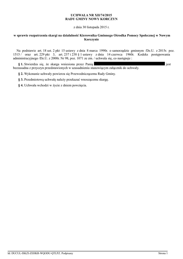 UCHWAŁA NR XII/74/2015 RADY GMINY NOWY KORCZYN z dnia 30 listopada 2015 r. w sprawie rozpatrzenia skargi na działalność Kierownika Gminnego Ośrodka Pomocy Społecznej w Nowym Korczynie Na podstawie art. 18 ust. 2 pkt 15 ustawy z dnia 8 marca 1990r. o samorządzie gminnym /Dz.U. z 2015r. poz. 1515 / oraz art. 229 pkt 3, art. 237 i 238 § 1 ustawy z dnia 14 czerwca 1960r. Kodeks postępowania administracyjnego /Dz.U. z 2000r. Nr 98, poz. 1071 ze zm. / uchwala się, co następuje : § 1. Stwierdza się, że skarga wniesiona przez Panią bezzasadna z przyczyn przedstawionych w uzasadnieniu stanowiącym załącznik do uchwały. jest § 2. Wykonanie uchwały powierza się Przewodniczącemu Rady Gminy. § 3. Przedmiotową uchwałę należy przekazać wnoszącemu skargę. § 4. Uchwała wchodzi w życie z dniem powzięcia. Id: DUCUL-ISKZI-ZEHKR-WQODU-QTLPZ. Podpisany Strona 1 Uzasadnienie Pani w dniu 16.11.2015 r. złożyła skargę do Wójta Gminy Nowy Korczyny ma kierownika GOPS w Nowym Korczynie za nierzetelne wykonywanie obowiązków, nadużywanie uprawnień wynikających z pełnionej funkcji oraz oceny sytuacji niezgodnych z faktycznym stanem. Dopuszczając się oceny subiektywnej, podważając postanowienie Sądu. W dniu 03.11.2015 r. została wydana przez tut. Ośrodek Pomocy Społecznej (OPS) dla pani decyzja znak:OPS.5120.960.8.2015r. o ustaleniu wysokość opłaty za pobyt matki w Domu Pomocy Społecznej w Ratajach Słupskich oraz o nie zwolnieniu jej z częściowej lub całkowitej odpłatności. Wydanie decyzji administracyjnej następuje dopiero przy negatywnej postawie osób zobowiązanych do wnoszenia opłaty za pobyt w DPS ich członka rodziny i udokumentowaną odmową podpisania umowy między kierownikiem OPS, a osobą zobowiązaną do ponoszenia opłaty, o której mowa w art. 103 ust. 2 ustawy o pomocy społecznej. Organ pomocy społecznej w takiej sytuacji powinien wydać decyzję administracyjną o ustaleniu wysokości opłaty przez osoby zobowiązane do jej ponoszenia jeżeli spełniają kryteria dochodowe. Taka sytuacją wystąpiła w przypadku pani ponieważ odmówiła ona podpisania umowy i partycypowaniu w kosztach pobytu jej matki w DPS, to kierownik OPS wydał w/w decyzję, w której zostało zawarte obszerne uzasadnienie, została podana podstawa prawna oraz merytoryczne rozstrzygnięcie wniosku pani z podaniem przepisów regulujących kwestię ponoszenia odpłatności za pobyt w DPS. Zwolnienie z obowiązku opłat, o którym mowa w art. 64 w/w ustawy ma charakter uznaniowy. Organ musi w takich przypadkach ocenić zarówno wpływ tych okoliczności na możliwości płatnicze osoby zobowiązanej jak też musi brać pod uwagę kondycję finansową gminy, która jest zobowiązana do ponoszenia opłat za pobyt mieszkańca w DPS, lecz dopiero w trzeciej kolejności. Zwolnienie osoby z ponoszenia opłaty za pobyt członka rodziny w DPS powoduje uszczuplenie środków budżetowych gminy, które mogą być przeznaczone na rzecz innych osób potrzebujących pomocy. Obecnie w Domach Pomocy Społecznej przebywa 20 osób, a koszt utrzymania ich kosztuje gminę 505.952,55 zł. w 2014 r. Przedłożony przez panią Wyrok Sądu Rejonowego w Busku Zdroju Wydział III Rodzinny i Nieletnich z dnia 15 września 2015 r. o zwolnieniu jej z alimentacji na rzecz swojej matki nie może być przesłanką do zwolnienia jej z częściowej lub całkowitej odpłatności o czy jest przekonana pani , ponieważ zwolnienie jej przez kierownika OPS z częściowej lub całkowitej odpłatności może nastąpić jedynie na podstawie art. 64 ustawy o pomocy społecznej (t.j. Dz. U z 2015 poz. 163 z póź. zm.) w trybie decyzji administracyjnej. Ośrodek Pomocy Społecznej w Nowym Korczynie umożliwił stronie czynny udział w toczącym się postępowaniu administracyjnym zgodnie z art. 10 § 1 k.p.a., poprzez umożliwienie stronie wypowiedzenia się, co do wszelkich przeprowadzonych dowodów, umożliwił jej wypowiedzenie się co do ostatecznie zebranego materiału sprawy przed wydaniem decyzji administracyjnej. Zgodnie z Kodeksem Postepowania Administracyjnego w przypadku gdy strona nie zgadza się z wydaną przez właściwy organ decyzją, przysługuje jej prawo wniesienia odwołania do Samorządowego Kolegium Odwoławczego w Kielcach, z którego klientka w dniu 16.11.2015 r. skorzystała. Komisja Rewizyjna po przeanalizowaniu akt sprawy oraz wyjaśnień kierownika OPS na posiedzeniu w dniu 27.11.2015 r. ustaliła, że zarzuty zawarte w skardze pani są nieprawdziwe i nie potwierdzone żadnymi dowodami na nieprawidłowe działanie kierownika OPS w Nowym Korczynie. Postępowanie wyjaśniające przeprowadzone przez Komisję Rewizyjną nie potwierdziło zasadności zarzutów określonych w skardze. W tych okolicznościach przedmiotową skargę należy uznać za bezzasadną. Pouczenie: Poucza się jednocześnie skarżącego o treści art. 239 § 1 KPA zgodnie z którym: „W przypadku gdy skarga, w wyniku jej rozpatrzenia, została uznana za bezzasadną i jej bezzasadność wykazano w odpowiedzi na skargę, a skarżący ponowił skargę bez wskazania nowych okoliczności – organ właściwy do jej rozpatrzenia może podtrzymać swoje poprzednie stanowisko z odpowiednią adnotacją w aktach sprawy – bez zawiadamiania skarżącego.” Id: DUCUL-ISKZI-ZEHKR-WQODU-QTLPZ. Podpisany Strona 1