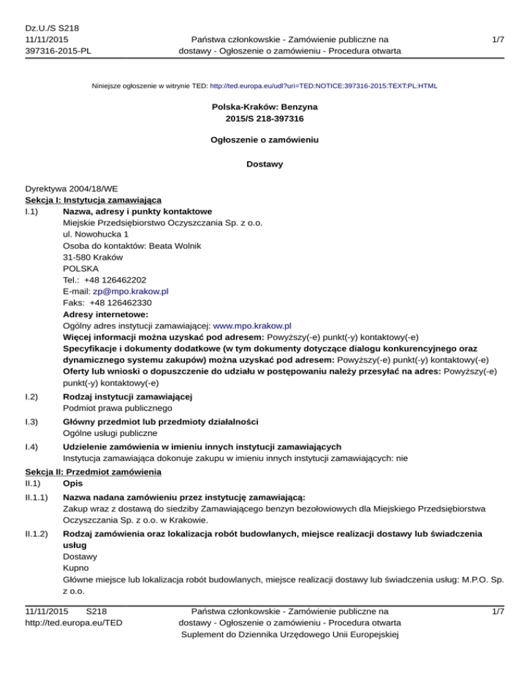 Dz.U./S S218 11/11/2015 397316-2015-PL Państwa członkowskie - Zamówienie publiczne na dostawy - Ogłoszenie o zamówieniu - Procedura otwarta 1/7 Niniejsze ogłoszenie w witrynie TED: http://ted.europa.eu/udl?uri=TED:NOTICE:397316-2015:TEXT:PL:HTML Polska-Kraków: Benzyna 2015/S 218-397316 Ogłoszenie o zamówieniu Dostawy Dyrektywa 2004/18/WE Sekcja I: Instytucja zamawiająca I.1) Nazwa, adresy i punkty kontaktowe Miejskie Przedsiębiorstwo Oczyszczania Sp. z o.o. ul. Nowohucka 1 Osoba do kontaktów: Beata Wolnik 31-580 Kraków POLSKA Tel.: +48 126462202 E-mail: [email protected] Faks: +48 126462330 Adresy internetowe: Ogólny adres instytucji zamawiającej: www.mpo.krakow.pl Więcej informacji można uzyskać pod adresem: Powyższy(-e) punkt(-y) kontaktowy(-e) Specyfikacje i dokumenty dodatkowe (w tym dokumenty dotyczące dialogu konkurencyjnego oraz dynamicznego systemu zakupów) można uzyskać pod adresem: Powyższy(-e) punkt(-y) kontaktowy(-e) Oferty lub wnioski o dopuszczenie do udziału w postępowaniu należy przesyłać na adres: Powyższy(-e) punkt(-y) kontaktowy(-e) I.2) Rodzaj instytucji zamawiającej Podmiot prawa publicznego I.3) Główny przedmiot lub przedmioty działalności Ogólne usługi publiczne I.4) Udzielenie zamówienia w imieniu innych instytucji zamawiających Instytucja zamawiająca dokonuje zakupu w imieniu innych instytucji zamawiających: nie Sekcja II: Przedmiot zamówienia II.1) Opis II.1.1) Nazwa nadana zamówieniu przez instytucję zamawiającą: Zakup wraz z dostawą do siedziby Zamawiającego benzyn bezołowiowych dla Miejskiego Przedsiębiorstwa Oczyszczania Sp. z o.o. w Krakowie. II.1.2) Rodzaj zamówienia oraz lokalizacja robót budowlanych, miejsce realizacji dostawy lub świadczenia usług Dostawy Kupno Główne miejsce lub lokalizacja robót budowlanych, miejsce realizacji dostawy lub świadczenia usług: M.P.O. Sp. z o.o. 11/11/2015 S218 http://ted.europa.eu/TED Państwa członkowskie - Zamówienie publiczne na dostawy - Ogłoszenie o zamówieniu - Procedura otwarta Suplement do Dziennika Urzędowego Unii Europejskiej 1/7 Dz.U./S S218 11/11/2015 397316-2015-PL Państwa członkowskie - Zamówienie publiczne na dostawy - Ogłoszenie o zamówieniu - Procedura otwarta 2/7 ul. Nowohucka 1 31-580 Kraków. Kod NUTS PL213 II.1.3) Informacje na temat zamówienia publicznego, umowy ramowej lub dynamicznego systemu zakupów (DSZ) Ogłoszenie dotyczy zamówienia publicznego II.1.4) Informacje na temat umowy ramowej II.1.5) Krótki opis zamówienia lub zakupu Przedmiotem zamówienia jest zakup wraz z dostawą do siedziby Zamawiającego benzyn bezołowiowych w ilości: a) zadanie nr 1 – dostawa benzyny bezołowiowej Pb 95 w ilości 1500 m3, b) zadanie nr 2 – dostawa benzyny bezołowiowej Pb 98 w ilości 150 m3. Szczegółowy opis przedmiotu zamówienia zawiera zał. nr 1 do SIWZ. II.1.6) Wspólny Słownik Zamówień (CPV) 09132000 II.1.7) Informacje na temat Porozumienia w sprawie zamówień rządowych (GPA) II.1.8) Części To zamówienie podzielone jest na części: nie II.1.9) Informacje o ofertach wariantowych Dopuszcza się składanie ofert wariantowych: nie II.2) Wielkość lub zakres zamówienia II.2.1) Całkowita wielkość lub zakres: Szacunkowa wartość bez VAT: 5 588 083,50 PLN II.2.2) Informacje o opcjach Opcje: nie II.2.3) Informacje o wznowieniach Jest to zamówienie podlegające wznowieniu: nie II.3) Czas trwania zamówienia lub termin realizacji Okres w miesiącach: 12 (od udzielenia zamówienia) Sekcja III: Informacje o charakterze prawnym, ekonomicznym, finansowym i technicznym III.1) Warunki dotyczące zamówienia III.1.1) Wymagane wadia i gwarancje: Zamawiający żąda wniesienia wadium. 1. Warunkiem uczestnictwa w postępowaniu jest wniesienie przez Wykonawcę wadium w wysokości 150 000 PLN (słownie złotych: sto pięćdziesiąt tysięcy złotych 00/100). 2. Wadium można wnieść w formie: a) pieniądzu, b) poręczeniach bankowych lub poręczeniach spółdzielczej kasy oszczędnościowo-kredytowej, z tym że poręczenie kasy jest zawsze poręczeniem pieniężnym, c) gwarancjach bankowych, d) gwarancjach ubezpieczeniowych, 11/11/2015 S218 http://ted.europa.eu/TED Państwa członkowskie - Zamówienie publiczne na dostawy - Ogłoszenie o zamówieniu - Procedura otwarta Suplement do Dziennika Urzędowego Unii Europejskiej 2/7 Dz.U./S S218 11/11/2015 397316-2015-PL Państwa członkowskie - Zamówienie publiczne na dostawy - Ogłoszenie o zamówieniu - Procedura otwarta 3/7 e) poręczeniach udzielanych przez podmioty, o których mowa w art. 6 b ust. 5 pkt 2 ustawy z 9.11.2000 o utworzeniu Polskiej Agencji Rozwoju Przedsiębiorczości (Dz. U. z 2007 r. nr 42 poz. 275, z 2008 r. nr 116 poz. 730 i 732 i Nr 227 poz. 1505 oraz z 2010 r. nr 96 poz. 620). 3. Wadium w formie pieniężnej można wnieść na rachunek bankowy Zamawiającego: Bank Pekao SA 73 1240 4722 1111 0000 4851 5630 z adnotacją: „wadium do przetargu nr TZ/TT/46/2015” Uwaga!!! — Zaleca się załączyć do oferty potwierdzenie złożenia wadium. — Wadium w innych formach niż pieniądz należy złożyć w formie kserokopii (potwierdzonej „za zgodność”) załączonej do oferty. W kopercie zawierającej ofertę należy dodatkowo załączyć oryginał ww. dokumentu, który zostanie zwrócony na zasadach określonych w ustawie Prawo zamówień publicznych. — Z treści gwarancji winno wynikać bezwarunkowe, na każde pisemne żądanie zgłoszone przez Zamawiającego w terminie związania ofertą, zobowiązanie gwaranta do wypłaty Zamawiającemu pełnej kwoty wadium w okolicznościach określonych w art. 46 ust. 5 PZP. — Datą wniesienia wadium w formie przelewu jest data uznania rachunku bankowego Zamawiającego. — Oferta, która nie będzie zabezpieczona wadium, lub, gdy wadium zostanie wpłacone po upływie terminu wyznaczonego do składania ofert, zostanie odrzucona. — Zamawiający zatrzymuje wadium wraz z odsetkami, jeżeli Wykonawca w odpowiedzi na w