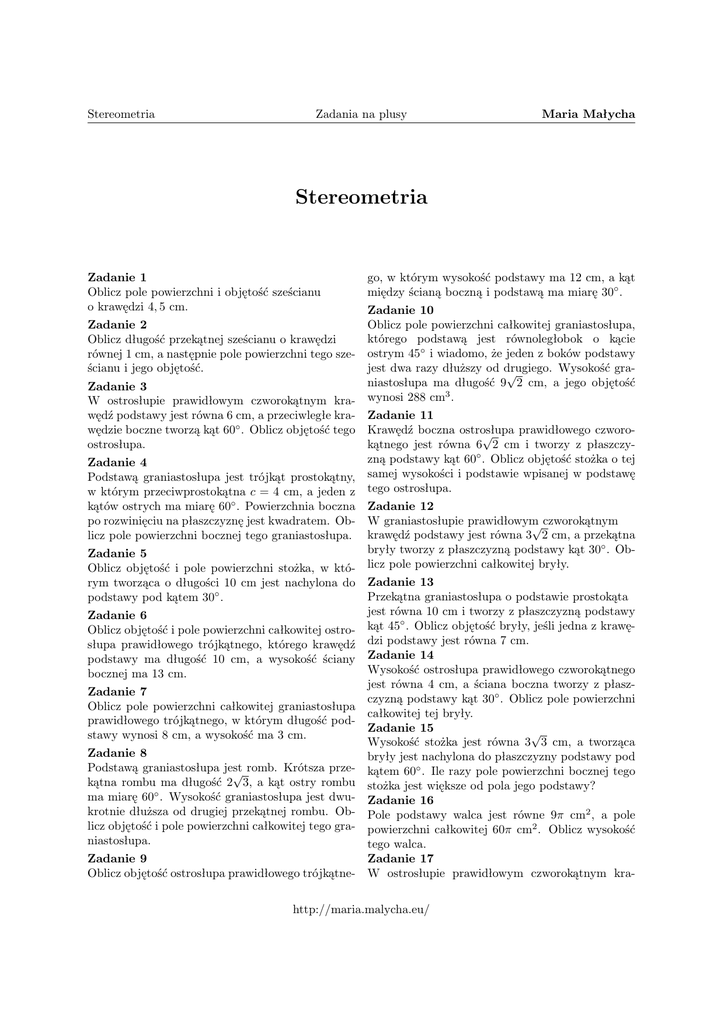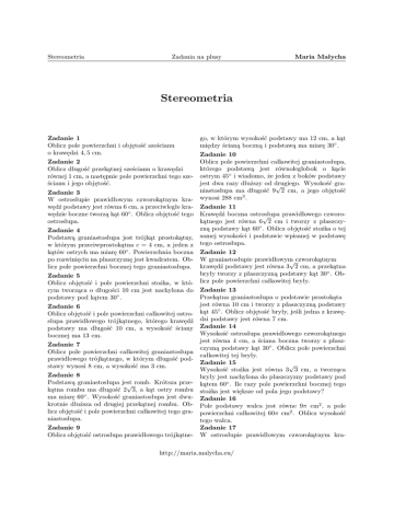 Stereometria Zadania na plusy Maria Małycha Stereometria Zadanie 1 Oblicz pole powierzchni i objętość sześcianu o krawędzi 4, 5 cm. Zadanie 2 Oblicz długość przekątnej sześcianu o krawędzi równej 1 cm, a następnie pole powierzchni tego sześcianu i jego objętość. Zadanie 3 W ostrosłupie prawidłowym czworokątnym krawędź podstawy jest równa 6 cm, a przeciwległe krawędzie boczne tworzą kąt 60◦ . Oblicz objętość tego ostrosłupa. Zadanie 4 Podstawą graniastosłupa jest trójkąt prostokątny, w którym przeciwprostokątna c = 4 cm, a jeden z kątów ostrych ma miarę 60◦ . Powierzchnia boczna po rozwinięciu na płaszczyznę jest kwadratem. Oblicz pole powierzchni bocznej tego graniastosłupa. Zadanie 5 Oblicz objętość i pole powierzchni stożka, w którym tworząca o długości 10 cm jest nachylona do podstawy pod kątem 30◦ . Zadanie 6 Oblicz objętość i pole powierzchni całkowitej ostrosłupa prawidłowego trójkątnego, którego krawędź podstawy ma długość 10 cm, a wysokość ściany bocznej ma 13 cm. Zadanie 7 Oblicz pole powierzchni całkowitej graniastosłupa prawidłowego trójkątnego, w którym długość podstawy wynosi 8 cm, a wysokość ma 3 cm. Zadanie 8 Podstawą graniastosłupa jest √ romb. Krótsza przekątna rombu ma długość 2 3, a kąt ostry rombu ma miarę 60◦ . Wysokość graniastosłupa jest dwukrotnie dłuższa od drugiej przekątnej rombu. Oblicz objętość i pole powierzchni całkowitej tego graniastosłupa. Zadanie 9 Oblicz objętość ostrosłupa prawidłowego trójkątne- go, w którym wysokość podstawy ma 12 cm, a kąt między ścianą boczną i podstawą ma miarę 30◦ . Zadanie 10 Oblicz pole powierzchni całkowitej graniastosłupa, którego podstawą jest równoległobok o kącie ostrym 45◦ i wiadomo, że jeden z boków podstawy jest dwa razy dłuższy od drugiego. Wysokość gra√ niastosłupa ma długość 9 2 cm, a jego objętość wynosi 288 cm3 . Zadanie 11 Krawędź boczna ostrosłupa prawidłowego czworo√ kątnego jest równa 6 2 cm i tworzy z płaszczyzną podstawy kąt 60◦ . Oblicz objętość stożka o tej samej wysokości i podstawie wpisanej w podstawę tego ostrosłupa. Zadanie 12 W graniastosłupie prawidłowym √ czworokątnym krawędź podstawy jest równa 3 2 cm, a przekątna bryły tworzy z płaszczyzną podstawy kąt 30◦ . Oblicz pole powierzchni całkowitej bryły. Zadanie 13 Przekątna graniastosłupa o podstawie prostokąta jest równa 10 cm i tworzy z płaszczyzną podstawy kąt 45◦ . Oblicz objętość bryły, jeśli jedna z krawędzi podstawy jest równa 7 cm. Zadanie 14 Wysokość ostrosłupa prawidłowego czworokątnego jest równa 4 cm, a ściana boczna tworzy z płaszczyzną podstawy kąt 30◦ . Oblicz pole powierzchni całkowitej tej bryły. Zadanie 15 √ Wysokość stożka jest równa 3 3 cm, a tworząca bryły jest nachylona do płaszczyzny podstawy pod kątem 60◦ . Ile razy pole powierzchni bocznej tego stożka jest większe od pola jego podstawy? Zadanie 16 Pole podstawy walca jest równe 9π cm2 , a pole powierzchni całkowitej 60π cm2 . Oblicz wysokość tego walca. Zadanie 17 W ostrosłupie prawidłowym czworokątnym kra- http://maria.malycha.eu/ Stereometria Zadania na plusy Maria Małycha pierwiastkowi równania h2 + 64 = 16h. Podstawa jest rombem o przekątnych długości 12 cm i 5 cm. Oblicz objętość tego równoległościanu. Zadanie 28 Zadanie 18 Oblicz wysokość ostrosłupa prawidłowego czworo- Dany jest ostrosłup prawidłowy trójkątny, w któkątnego, w którym krawędź podstawy jest równa rym krawędzie boczne mają długość k = 6. Kąt płaski ściany bocznej przy wierzchołku ostrosłupa 12 cm, a krawędź boczna 9 cm. ma miarę 60◦ . Oblicz długość krawędzi podstawy, Zadanie 19 √ W stożku tworząca długości 6 3 cm nachylona jest długość wysokości ściany bocznej, długość wysodo płaszczyzny podstawy pod kątem 60◦ . Oblicz kości tego ostrosłupa, objętość i pole powierzchni całkowitej ostrosłupa. objętość tego stożka. Zadanie 29 Zadanie 20 2 Wycinek koła o promieniu 12 cm, wyznaczony Dwa stożki są podobne w skali 3k = 7 . Objętość przez kąt środkowy 120◦ , zwinięto tak, że utwo- mniejszego stożka wynosi 72 cm . Jaka jest objęrzył on powierzchnię boczną stożka. Oblicz pole tość drugiego stożka? Zadanie 30 powierzchni całkowitej tego stożka. Pole powierzchni jednej kuli równa się 16π cm2 , a Zadanie 21 2 Objętość każdej z brył: stożka i kuli jest równa drugiej 144π cm . Oblicz objętość każdej kuli. 36π cm3 . Oblicz tangens kąta nachylenia tworzącej stożka do płaszczyzny jego podstawy, jeśli podstawa stożka jest przystajaca do koła wielkiego kuli? wędź podstawy jest równa 6 cm, a przeciwległe krawędzie boczne tworzą kąt 60◦ . Oblicz objętość tego ostrosłupa. Zadanie 22 Pole powierzchni bocznej walca jest równe 60π cm2 , a wysokość bryły jest równa 10 cm. Oblicz objętość tego walca. Zadanie 23 Podstawą graniastosłupa prostego jest trójkąt prostokątny, w którym najkrótszy bok jest równy 6 cm, a jeden z kątów ostrych 30◦ . Oblicz objętość tej bryły, jeśli jej wysokość jest równa 12 cm. Zadanie 24 W ostrosłupie o podstawie prostokąta każda z krawędzi bocznych jest równa 5 cm, a przeciwlegle krawędzie boczne tworzą kąt prosty. Oblicz objętość tej bryły, jeśli jedna z krawędzi podstawy jest równa 1 cm. Zadanie 25 √ √ Trójkąt o wymiarach: 10 cm, 4 5 cm, 2 13 cm jest przekrojem zawierającym przekątne trzech sąsiednich ścian prostopadłościanu. Oblicz objętość tego prostopadłościanu. Zadanie 26 Przekątna przekroju osiowego walca długości 8 cm tworzy z płaszczyzną podstawy kąt 30◦ . Oblicz objętość bryły. Zadanie 27 Długość wysokości równoległościanu jest równa http://maria.malycha.eu/