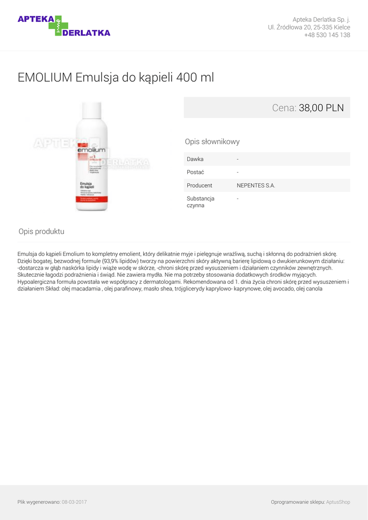 Apteka Derlatka Sp. j. Ul. Źródłowa 20, 25-335 Kielce +48 530 145 138 EMOLIUM Emulsja do kąpieli 400 ml Cena: 38,00 PLN Opis słownikowy Dawka - Postać - Producent NEPENTES S.A. Substancja czynna - Opis produktu Emulsja do kąpieli Emolium to kompletny emolient, który delikatnie myje i pielęgnuje wrażliwą, suchą i skłonną do podrażnień skórę. Dzięki bogatej, bezwodnej formule (93,9% lipidów) tworzy na powierzchni skóry aktywną barierę lipidową o dwukierunkowym działaniu: -dostarcza w głąb naskórka lipidy i wiąże wodę w skórze, -chroni skórę przed wysuszeniem i działaniem czynników zewnętrznych. Skutecznie łagodzi podrażnienia i świąd. Nie zawiera mydła. Nie ma potrzeby stosowania dodatkowych środków myjących. Hypoalergiczna formuła powstała we współpracy z dermatologami. Rekomendowana od 1. dnia życia chroni skórę przed wysuszeniem i działaniem Skład: olej macadamia , olej parafinowy, masło shea, trójglicerydy kaprylowo- kaprynowe, olej avocado, olej canola Plik wygenerowano: 08-03-2017 Powered by TCPDF (www.tcpdf.org) Oprogramowanie sklepu: AptusShop