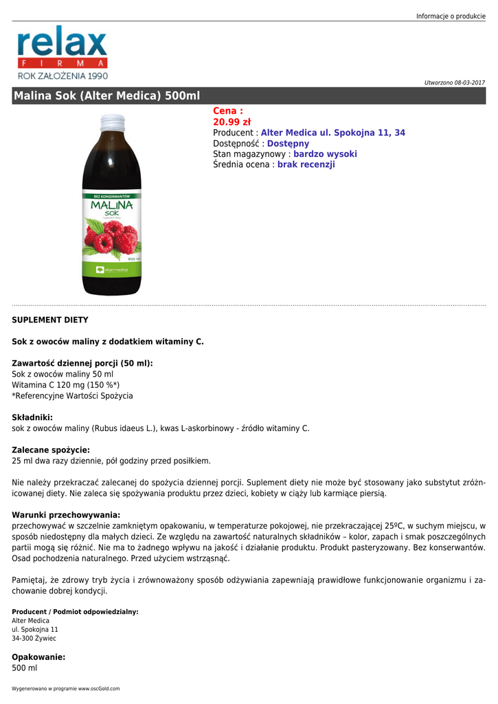 Informacje o produkcie Utworzono 08-03-2017 Malina Sok (Alter Medica) 500ml Cena : 20.99 zł Producent : Alter Medica ul. Spokojna 11, 34 Dostępność : Dostępny Stan magazynowy : bardzo wysoki Średnia ocena : brak recenzji SUPLEMENT DIETY Sok z owoców maliny z dodatkiem witaminy C. Zawartość dziennej porcji (50 ml): Sok z owoców maliny 50 ml Witamina C 120 mg (150 %*) *Referencyjne Wartości Spożycia Składniki: sok z owoców maliny (Rubus idaeus L.), kwas L-askorbinowy - źródło witaminy C. Zalecane spożycie: 25 ml dwa razy dziennie, pół godziny przed posiłkiem. Nie należy przekraczać zalecanej do spożycia dziennej porcji. Suplement diety nie może być stosowany jako substytut zróżnicowanej diety. Nie zaleca się spożywania produktu przez dzieci, kobiety w ciąży lub karmiące piersią. Warunki przechowywania: przechowywać w szczelnie zamkniętym opakowaniu, w temperaturze pokojowej, nie przekraczającej 25ºC, w suchym miejscu, w sposób niedostępny dla małych dzieci. Ze względu na zawartość naturalnych składników – kolor, zapach i smak poszczególnych partii mogą się różnić. Nie ma to żadnego wpływu na jakość i działanie produktu. Produkt pasteryzowany. Bez konserwantów. Osad pochodzenia naturalnego. Przed użyciem wstrząsnąć. Pamiętaj, że zdrowy tryb życia i zrównoważony sposób odżywiania zapewniają prawidłowe funkcjonowanie organizmu i zachowanie dobrej kondycji. Producent / Podmiot odpowiedzialny: Alter Medica ul. Spokojna 11 34-300 Żywiec Opakowanie: 500 ml Wygenerowano w programie www.oscGold.com