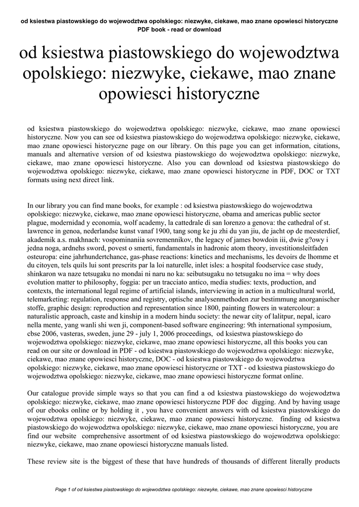 od ksiestwa piastowskiego do wojewodztwa opolskiego: niezwyke, ciekawe, mao znane opowiesci historyczne PDF book - read or download od ksiestwa piastowskiego do wojewodztwa opolskiego: niezwyke, ciekawe, mao znane opowiesci historyczne od ksiestwa piastowskiego do wojewodztwa opolskiego: niezwyke, ciekawe, mao znane opowiesci historyczne. Now you can see od ksiestwa piastowskiego do wojewodztwa opolskiego: niezwyke, ciekawe, mao znane opowiesci historyczne page on our library. On this page you can get information, citations, manuals and alternative version of od ksiestwa piastowskiego do wojewodztwa opolskiego: niezwyke, ciekawe, mao znane opowiesci historyczne. Also you can download od ksiestwa piastowskiego do wojewodztwa opolskiego: niezwyke, ciekawe, mao znane opowiesci historyczne in PDF, DOC or TXT formats using next direct link. In our library you can find mane books, for example : od ksiestwa piastowskiego do wojewodztwa opolskiego: niezwyke, ciekawe, mao znane opowiesci historyczne, obama and americas public sector plague, modernidad y economia, wolf academy, la cattedrale di san lorenzo a genova: the cathedral of st. lawrence in genoa, nederlandse kunst vanaf 1900, tang song ke ju zhi du yan jiu, de jacht op de meesterdief, akademik a.s. makhnach: vospominaniia sovremennikov, the legacy of james bowdoin iii, dwie g?owy i jedna noga, ardnehs sword, povest o smerti, fundamentals in hadronic atom theory, investitionsleitfaden osteuropa: eine jahrhundertchance, gas-phase reactions: kinetics and mechanisms, les devoirs de lhomme et du citoyen, tels quils lui sont prescrits par la loi naturelle, inlet isles: a hospital foodservice case study, shinkaron wa naze tetsugaku no mondai ni naru no ka: seibutsugaku no tetsugaku no ima = why does evolution matter to philosophy, foggia: per un tracciato antico, media studies: texts, production, and contexts, the international legal regime of artificial islands, interviewing in action in a multicultural world, telemarketing: regulation, response and registry, optische analysenmethoden zur bestimmung anorganischer stoffe, graphic design: reproduction and representation since 1800, painting flowers in watercolour: a naturalistic approach, caste and kinship in a modern hindu society: the newar city of lalitpur, nepal, icaro nella mente, yang wanli shi wen ji, component-based software engineering: 9th international symposium, cbse 2006, vasteras, sweden, june 29 - july 1, 2006 proceedings, od ksiestwa piastowskiego do wojewodztwa opolskiego: niezwyke, ciekawe, mao znane opowiesci historyczne, all this books you can read on our site or download in PDF - od ksiestwa piastowskiego do wojewodztwa opolskiego: niezwyke, ciekawe, mao znane opowiesci historyczne, DOC - od ksiestwa piastowskiego do wojewodztwa opolskiego: niezwyke, ciekawe, mao znane opowiesci historyczne or TXT - od ksiestwa piastowskiego do wojewodztwa opolskiego: niezwyke, ciekawe, mao znane opowiesci historyczne format online. Our catalogue provide simple ways so that you can find a od ksiestwa piastowskiego do wojewodztwa opolskiego: niezwyke, ciekawe, mao znane opowiesci historyczne PDF doc digging. And by having usage of our ebooks online or by holding it , you have convenient answers with od ksiestwa piastowskiego do wojewodztwa opolskiego: niezwyke, ciekawe, mao znane opowiesci historyczne. finding od ksiestwa piastowskiego do wojewodztwa opolskiego: niezwyke, ciekawe, mao znane opowiesci historyczne, you are find our website comprehensive assortment of od ksiestwa piastowskiego do wojewodztwa opolskiego: niezwyke, ciekawe, mao znane opowiesci historyczne manuals listed. These review site is the biggest of these that have hundreds of thousands of different literally products Page 1 of od ksiestwa piastowskiego do wojewodztwa opolskiego: niezwyke, ciekawe, mao znane opowiesci historyczne od ksiestwa piastowskiego do wojewodztwa opolskiego: niezwyke, ciekawe, mao znane opowiesci historyczne PDF book - read or download represented. You will see that there are specific sites catered to different product also types or categories, niches or brands related with od ksiestwa piastowskiego do wojewodztwa opolskiego: niezwyke, ciekawe, mao znane opowiesci historyczne. So depending on what exactly you are searching, you will be able to choose ebooks od ksiestwa piastowskiego do wojewodztwa opolskiego: niezwyke, ciekawe, mao znane opowiesci historyczne to suit your own needs, od ksiestwa piastowskiego do wojewodztwa opolskiego: niezwyke, ciekawe, mao znane opowiesci historyczne. Page 2 of od ksiestwa piastowskiego do wojewodztwa opolskiego: niezwyke, ciekawe, mao znane opowiesci historyczne
