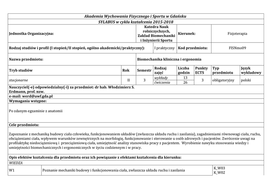 Akademia Wychowania Fizycznego i Sportu w Gdańsku SYLABUS w cyklu kształcenia 2015-2018 Katedra Nauk rolniczychzych, Kierunek: Zakład Biomechaniki i Inżynierii Sportu Jednostka Organizacyjna: Rodzaj studiów i profil (I stopień/II stopień, ogólno akademicki/praktyczny): Nazwa przedmiotu: Tryb studiów I praktyczny Kod przedmiotu: FISNmo09 Biomechanika kliniczna i ergonomia Rok stacjonarne Fizjoterapia II Semestr 3 Rodzaj zajęć wykłady ćwiczenia Liczba godzin 13 26 Punkty ECTS 3 Typ przedmiotu Język wykładowy obligatoryjny polski Nauczyciel(-e) odpowiedzialny(-i) za przedmiot: dr hab. Włodzimierz S. Erdmann, prof. nzw. e-mail: [email protected] Wymagania wstępne: Po zdanym egzaminie z anatomii Cele przedmiotu: Zapoznanie z mechaniką budowy ciała człowieka, funkcjonowaniem układów (zwłaszcza układu ruchu i zasilania), zagadnieniami równowagi ciała, ruchu, obciążeniami ciała, wpływem warunków zewnętrznych na morfologię, funkcjonowanie i sterowanie u osób zdrowych i pacjentów. Zwrócenie uwagi na profilaktykę niedociążeniową i przeciążeniową ciała, umiejętność analizy stanowiska pracy z pacjentem. Wyrobienie nawyku stosowania wiedzy i umiejętności biomechanicznych i ergonomicznych w życiu codziennym i w pracy. Opis efektów kształcenia dla przedmiotu oraz ich powiązanie z efektami kształcenia dla kierunku: WIEDZA W1 Poznanie mechaniki budowy i funkcjonowania ciała, zwłaszcza układu ruchu i zasilania K_W03 K_W02 W2 Zapoznanie się ze specyfiką sterowania ciałem własnym i pacjenta UMIEJĘTNOŚCI U1 Posiadanie umiejętności diagnozowania ciała pod względem możliwości ruchowych i siłowych z wykorzystaniem podstawowych urządzeń biomechanicznych K_U02, K_U08 U2 Posiadanie umiejętności dozowania obciążeń oddziałujących na ciało K_U08 U3 Nabycie umiejętności oceny pracy własnej i pacjenta pod względem ergonomicznym K_U07 K1 Nabycie kompetencji w diagnozowaniu biomechanicznym ciała pacjenta K_K13 K2 Nabycie kompetencji w ocenie ergonomicznej stanowisk pracy K_K11 KOMPETENCJE Kryteria i metody oceny osiągniętych efektów kształcenia: Egzamin pisemny………………………….. z wiedzy prezentowanej podczas wykładów, ćwiczeń, zawartych w piśmiennictwie; Zaliczenie ćwiczeń na podstawie oceny sporządzonych raportów z pomiarów wykonywanych podczas ćwiczeń laboratoryjnych. Aby uzyskać zaliczenie przedmiotu na ocenę dostateczną student musi osiągnąć wszystkie wymienione w sylabusie efekty kształcenia Metody i formy realizacji przedmiotu: 1. Wykłady z prezentacją multimedialną 2. Ćwiczenia: a. forma seminaryjna; b. forma laboratoryjna – wykonanie mini-eksperymentów Treści kształcenia: Wykłady: 1. Wprowadzenie – istota, historia, współczesność biomechaniki 2. Biomechanika morfologiczna – struktura, biomateriały 3. „ „ – konstrukcja, geometria, inercja ciała 4. Biomechanika układu ruchu – biernego (kości, więzadła, stawy) 5. „ „ „ – czynnego (mięśnie) 6. Sterowanie ruchami 7. Równowaga ciała 8. Ruchy lokostacyjne (w miejscu) 9. Ruchy lokomocyjne (naturalne) 10. Oddziaływanie środowiska na ciało 11. Biomechanika medyczna i fizjoterapii 12. Zagadnienia techniki i taktyki ruchu parasportowego 13. Podstawy ergonomii 14. Źródła obciążenia na stanowisku pracy 15. Ergonomia pracy fizjoterapeuty. Ćwiczenia: 1. Podstawy cybernetyki, metrologia 2. Mechanika podstawowa 3. Struktura, geometria ciała (fotografowanie) 4. Analiza fotogrametryczna postawy ciała 5. Inercja ciała (masa, położenie środka masy) 6. Kolokwium I. Inercja c.d. (moment bezwładności) 7. Mechanika mięśni (badania siły mięśniowej) 8. „ „ 9. Analiza sił reakcji podłoża 10. Videogrametria (rejestracja ruchu ciała) 11. „ (analiza ruchu ciała) 12. Analiza ruchowego i siłowego oddziaływania na pacjenta 13. Kolokwium II. Stabilometria 14.Określenie obciążenia ciała podczas podnoszenia obiektu 15. Opracowanie ergonomiczne stanowiska pracy Forma zaliczenia: Literatura: Egzamin / Zaliczenie z oceną Podstawowa: Bober T., Zawadzki J. (2001) Biomechanika układu ruchu człowieka. Wrocław: BK. Erdmann W. S. (2000) Biomechanika. Przewodnik do ćwiczeń. Gdańsk: May. Błaszczyk W. (2004) Biomechanika kliniczna. Warszawa: Wyd. Lekarskie PZWL Dworak L. B. (1995) Niektóre metody badawcze biomechaniki i ich zastosowanie w sporcie, medycynie i ergonomii. Poznań: AWF, Seria: Skrypty nr 91. Batogowska A., Malinowski A. (1997) Ergonomia dla każdego. Poznań: Sorus. Uzupełniająca: Erdmann W. S. - red. (1998, 2005) Lokomocja ’98 oraz Lokomocja 2003. Gdańsk: Centrum Badań Lokomocji AWFiS-AM. Ernst K. (1992) Fizyka sportu, Warszawa: PWN. Wit A. - red. (1992) Biomechaniczna ocena układu ruchu sportowca. Warszawa: Instytut Sportu. Erdmann W. S. (2006) Metody obrazowe. AWFiS Gdańsk. Erdmann W. S., Zieniawa R. (2011, 2012) Biomechanika judo. AWFiS Gdańsk. Bilans punktów ECTS (1 pkt ECTS – 25-30 godz. pracy studenta): Aktywność Udział w wykładach Samodzielne studiowanie tematyki wykładów Udział w ćwiczeniach Przygotowanie się do ćwiczeń Konsultacje …. …. Całkowite obciążenie pracą studenta Punkty ECTS za przedmiot Obciążenie studenta 13 godz. 12 godz. 26 godz. 14 godz. 10 godz. godz. godz. 75 godz. 3 ECTS
