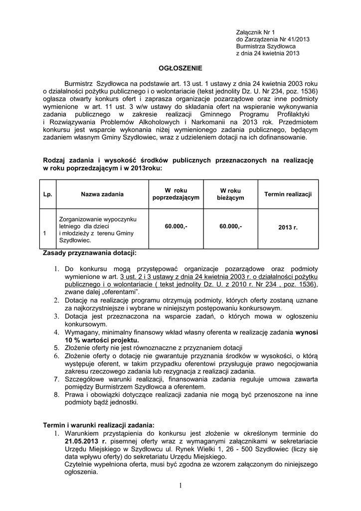 Załącznik Nr 1 do Zarządzenia Nr 41/2013 Burmistrza Szydłowca z dnia 24 kwietnia 2013 OGŁOSZENIE Burmistrz Szydłowca na podstawie art. 13 ust. 1 ustawy z dnia 24 kwietnia 2003 roku o działalności pożytku publicznego i o wolontariacie (tekst jednolity Dz. U. Nr 234, poz. 1536) ogłasza otwarty konkurs ofert i zaprasza organizacje pozarządowe oraz inne podmioty wymienione w art. 11 ust. 3 w/w ustawy do składania ofert na wspieranie wykonywania zadania publicznego w zakresie realizacji Gminnego Programu Profilaktyki i Rozwiązywania Problemów Alkoholowych i Narkomanii na 2013 rok. Przedmiotem konkursu jest wsparcie wykonania niżej wymienionego zadania publicznego, będącym zadaniem własnym Gminy Szydłowiec, wraz z udzieleniem dotacji na ich dofinansowanie. Rodzaj zadania i wysokość środków publicznych przeznaczonych na realizację w roku poprzedzającym i w 2013roku: Lp. 1 Nazwa zadania Zorganizowanie wypoczynku letniego dla dzieci i młodzieży z terenu Gminy Szydłowiec. W roku poprzedzającym W roku bieżącym Termin realizacji 60.000,- 60.000,- 2013 r. Zasady przyznawania dotacji: 1. Do konkursu mogą przystępować organizacje pozarządowe oraz podmioty 2. 3. 4. 5. 6. 7. 8. wymienione w art. 3 ust. 2 i 3 ustawy z dnia 24 kwietnia 2003 r. o działalności pożytku publicznego i o wolontariacie ( tekst jednolity Dz. U. z 2010 r. Nr 234 , poz. 1536), zwane dalej „oferentami”. Dotację na realizację programu otrzymują podmioty, których oferty zostaną uznane za najkorzystniejsze i wybrane w niniejszym postępowaniu konkursowym. Dotacja jest przeznaczona na wsparcie zadań, o których mowa w ogłoszeniu konkursowym. Wymagany, minimalny finansowy wkład własny oferenta w realizację zadania wynosi 10 % wartości projektu. Złożenie oferty nie jest równoznaczne z przyznaniem dotacji Złożenie oferty o dotację nie gwarantuje przyznania środków w wysokości, o którą występuje oferent, w takim przypadku oferentowi przysługuje prawo negocjowania zakresu rzeczowego zadania lub rezygnacja z realizacji zadania. Szczegółowe warunki realizacji, finansowania zadania reguluje umowa zawarta pomiędzy Burmistrzem Szydłowca a oferentem. Prawa i obowiązki dotyczące realizacji zadania nie mogą być przenoszone na inne podmioty bądź jednostki. Termin i warunki realizacji zadania: 1. Warunkiem przystąpienia do konkursu jest złożenie w określonym terminie do 21.05.2013 r. pisemnej oferty wraz z wymaganymi załącznikami w sekretariacie Urzędu Miejskiego w Szydłowcu ul. Rynek Wielki 1, 26 - 500 Szydłowiec (liczy się data wpływu oferty) do sekretariatu Urzędu Miejskiego. Czytelnie wypełniona oferta, musi być zgodna ze wzorem załączonym do niniejszego ogłoszenia. 1 2. Oferta powinna być opatrzona pieczątką oferenta oraz pieczątką imienną osób upoważnionych do składania oświadczeń woli w jego imieniu, złożona wraz z wymaganymi załącznikami w jednym egzemplarzu, w zamkniętej kopercie, opatrzonej napisem: „Konkurs”, podaniem zadania wyszczególnionego w ogłoszeniu oraz wskazaniem wysokości wnioskowanej dotacji. Wszystkie pola oferty muszą zostać czytelnie wypełnione. W polach, które nie odnoszą się do oferenta należy wpisać „nie dotyczy”. W przypadku opcji „niepotrzebne skreślić” należy dokonać właściwego wyboru. Dokument uznaje się za poprawny pod względem formalnym, gdy zostaną skreślone/usunięte wszystkie niepotrzebne sformułowania oznaczone gwiazdką oraz podane wszystkie żądane informacje. Do oferty należy dołączyć: 1. Aktualny odpis lub wyciąg z Krajowego Rejestru Sądowego (ważny trzy miesiące od daty wystawienia) 2. Aktualny statut oferenta lub inny dokument stwierdzający zakres prowadzonej działalności. 3. Pisemne oświadczenie o nie prowadzeniu przeciwko oferentowi ubiegającej się o udzielenie dotacji, egzekucji na podstawie przepisów prawa cywilnego i o braku zobowiązań wobec Skarbu Państwa (Urzędu Skarbowego, ZUS oraz zobowiązań podatkowych wobec Gminy Szydłowiec) podpisane przez osoby upoważnione do składania oświadczeń woli w imieniu oferenta. 4. W przypadku, gdy umowę o dotację podpisują osoby inne niż umocowane do reprezentacji zgodnie ze statutem oferenta konieczne jest dołączenie pełnomocnictwa do działania w imieniu oferenta. UWAGA: Dokumenty, które stanowią załączniki do oferty winny być opisane i opatrzone kolejnym numerem (w prawym górnym rogu -> Przykład: Załącznik nr 1 do oferty) oraz wymienione w ofercie w porządku nadanej numeracji, Kopie dokumentów składane łącznie z ofertą powinny być poświadczone „za zgodność z oryginałem” przez oferenta ( osobę upoważnioną do reprezentowania podmiotu składającego ofertę). Dokumenty powinny być spięte w jedną całość. Termin, tryb i kryteria stosowane przy dokonywaniu wyboru oferty: 1. Wybór ofert zostanie dokonany w ciągu 30 dni od dnia upływu terminu składania ofert. 2. Postępowanie konkursowe prowadzone będzie przez Komisję konkursową, powołaną przez Burmistrza Szydłowca. 3. Komisja przygotowuje rekomendacje ofert wraz z określeniem wysokości dotacji i przedstawia rozstrzygnięcie konkursu do akceptacji Burmistrza Szydłowca. 4. Decyzja Burmistrza Szydłowca w sprawie wyboru rekomendowanych ofert i wysokości przyznanej dotacji jest ostateczna i nie stosuje się do niej trybu odwoławczego. 5. Decyzja Burmistrza Szydłowca stanowi podstawę do zawarcia umów z oferentami, których oferty zostały wyłonione w postępowaniu konkursowym. 6. Lista oferentów, którzy przystąpili do konkursu oraz wyniki konkursu zostaną podane do publicznej wiadomości. Odrzuceniu podlegają oferty: 1. złożone na drukach innych niż wskazane w niniejszym ogłoszeniu, 2. niekompletne (brak załączników) 3. dotyczące zadania, które nie jest objęte działalnością statutową organizacji, 4. dotyczące zadania niezgodnego z ogłoszeniem konkursowym, 5. złożone przez podmiot n