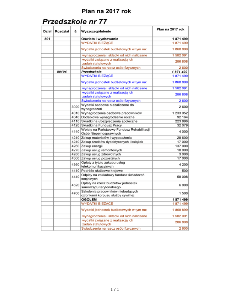 Plan na 2017 rok Przedszkole nr 77 Dział Rozdział § 801 80104 3020 4010 4040 4110 4120 4140 4210 4240 4260 4270 4280 4300 4360 4410 4440 4520 4700 Wyszczególnienie Plan na 2017 rok Oświata i wychowanie WYDATKI BIEŻĄCE 1 871 499 1 871 499 Wydatki jednostek budżetowych w tym na: 1 868 899 wynagrodzenia i składki od nich naliczane wydatki związane z realizacją ich zadań statutowych Świadczenia na rzecz osób fizycznych Przedszkola WYDATKI BIEŻĄCE 1 582 091 2 600 1 871 499 1 871 499 Wydatki jednostek budżetowych w tym na: 1 868 899 wynagrodzenia i składki od nich naliczane wydatki związane z realizacją ich zadań statutowych Świadczenia na rzecz osób fizycznych Wydatki osobowe niezaliczone do wynagrodzeń Wynagrodzenia osobowe pracowników Dodatkowe wynagrodzenie roczne Składki na ubezpieczenia społeczne Składki na Fundusz Pracy Wpłaty na Państwowy Fundusz Rehabilitacji Osób Niepełnosprawnych Zakup materiałów i wyposażenia Zakup środków dydaktycznych i książek Zakup energii Zakup usług remontowych Zakup usług zdrowotnych Zakup usług pozostałych Opłaty z tytułu zakupu usług telekomunikacyjnych Podróże służbowe krajowe Odpisy na zakładowy fundusz świadczeń socjalnych Opłaty na rzecz budżetów jednostek samorządu terytorialnego Szkolenia pracowników niebędących członkami korpusu służby cywilnej OGÓŁEM WYDATKI BIEŻĄCE 1 582 091 Wydatki jednostek budżetowych w tym na: 1 868 899 wynagrodzenia i składki od nich naliczane wydatki związane z realizacją ich zadań statutowych Świadczenia na rzecz osób fizycznych 1 582 091 1/1 286 808 286 808 2 600 2 600 1 233 952 92 164 223 896 32 079 4 000 28 600 17 000 137 000 10 000 3 000 17 000 4 200 500 58 008 6 000 1 500 1 871 499 1 871 499 286 808 2 600