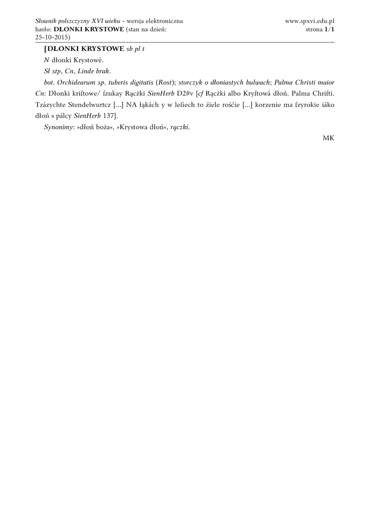Słownik polszczyzny XVI wieku - wersja elektroniczna hasło: DŁONKI KRYSTOWE (stan na dzień: 25-10-2015) www.spxvi.edu.pl strona 1/1 [DŁONKI KRYSTOWE sb pl t N dłonki Krystowé. Sł stp, Cn, Linde brak. bot. Orchidearum sp. tuberis digitatis (Rost); storczyk o dłoniastych bulwach; Palma Christi maior Cn: Dłonki kriſtowe/ ſzukay Rącżki SienHerb D2#v [cf Rącżki albo Kryſtowá dłoń. Palma Chriſti. Tzázychte Stendelwurtcz [...] NA łąkách y w leſiech to źiele rośćie [...] korzenie ma ſzyrokie iáko dłoń s pálcy SienHerb 137]. Synonimy: »dłoń boża«, »Krystowa dłoń«, rączki. MK