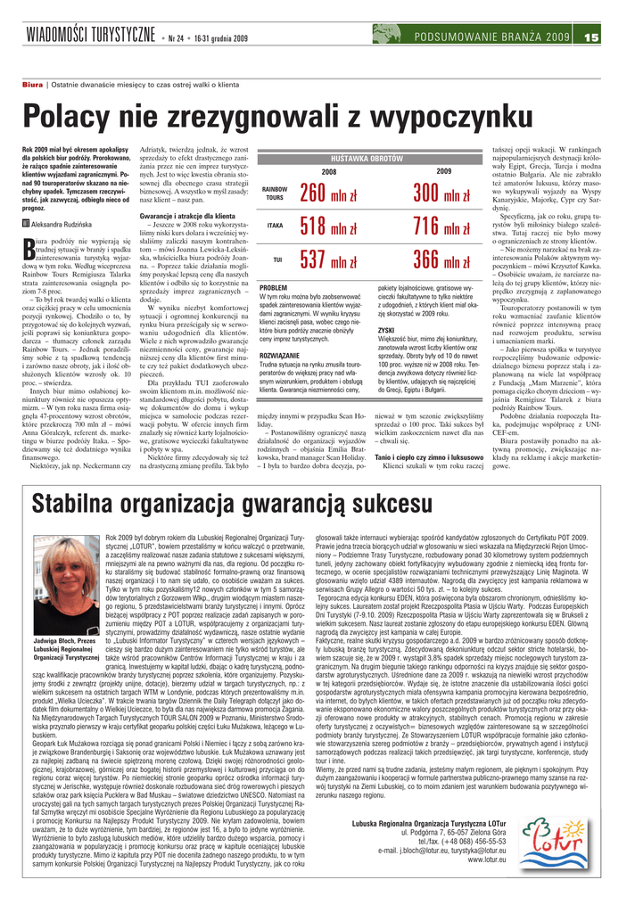 WIADOMOŚCI TURYSTYCZNE • Nr 24 • 16-31 grudnia 2009 PODSUMOWANIE BRAN˚A 2009 15 Biura | Ostatnie dwanaÊcie miesi´cy to czas ostrej walki o klienta Polacy nie zrezygnowali z wypoczynku Rok 2009 miał byç okresem apokalipsy dla polskich biur podró˝y. Prorokowano, ˝e ra˝àco spadnie zainteresowanie klientów wyjazdami zagranicznymi. Ponad 90 touroperatorów skazano na niechybny upadek. Tymczasem rzeczywistoÊç, jak zazwyczaj, odbiegła nieco od prognoz. Aleksandra Rudzińska B iura podró˝y nie wypierajà si´ trudnej sytuacji w bran˝y i spadku zainteresowania turystykà wyjazdowà w tym roku. Według wiceprezesa Rainbow Tours Remigiusza Talarka strata zainteresowania osiàgn´ła poziom 7-8 proc. – To był rok twardej walki o klienta oraz ci´˝kiej pracy w celu umocnienia pozycji rynkowej. Chodziło o to, by przygotowaç si´ do kolejnych wyzwaƒ, jeÊli poprawi si´ koniunktura gospodarcza – tłumaczy członek zarzàdu Rainbow Tours. – Jednak poradziliÊmy sobie z tà spadkowà tendencjà i zarówno nasze obroty, jak i iloÊç obsłu˝onych klientów wzrosły ok. 10 proc. – stwierdza. Innych biur mimo osłabionej koniunktury równie˝ nie opuszcza optymizm. – W tym roku nasza firma osiàgn´ła 47-procentowy wzrost obrotów, które przekroczà 700 mln zł – mówi Anna Góralczyk, referent ds. marketingu w biurze podró˝y Itaka. – Spodziewamy si´ te˝ dodatniego wyniku finansowego. Niektórzy, jak np. Neckermann czy Adriatyk, twierdzà jednak, ˝e wzrost sprzeda˝y to efekt drastycznego zani˝ania przez nie cen imprez turystycznych. Jest to wi´c kwestia obrania stosownej dla obecnego czasu strategii biznesowej. A wszystko w myÊl zasady: nasz klient – nasz pan. HUŚTAWKA OBROTÓW RAINBOW TOURS Gwarancje i atrakcje dla klienta – Jeszcze w 2008 roku wykorzystaliÊmy niski kurs dolara i wczeÊniej wysłaliÊmy zaliczki naszym kontrahentom – mówi Joanna Lewicka-Leksiƒska, właÊcicielka biura podró˝y Joanna. – Poprzez takie działania mogliÊmy pozyskaç lepszà cen´ dla naszych klientów i odbiło si´ to korzystnie na sprzeda˝y imprez zagranicznych – dodaje. W wyniku niezbyt komfortowej sytuacji i ogromnej konkurencji na rynku biura przeÊcigały si´ w serwowaniu udogodnieƒ dla klientów. Wiele z nich wprowadziło gwarancje niezmiennoÊci ceny, gwarancje najni˝szej ceny dla klientów first minute czy te˝ pakiet dodatkowych ubezpieczeƒ. Dla przykładu TUI zaoferowało swoim klientom m.in. mo˝liwoÊç niestandardowej długoÊci pobytu, dostaw´ dokumentów do domu i wykup miejsca w samolocie podczas rezerwacji pobytu. W ofercie innych firm znalazły si´ równie˝ karty lojalnoÊciowe, gratisowe wycieczki fakultatywne i pobyty w spa. Niektóre firmy zdecydowały si´ te˝ na drastycznà zmian´ profilu. Tak było 2009 2008 ITAKA TUI 260 mln zł 518 mln zł 537 mln zł PROBLEM W tym roku można było zaobserwować spadek zainteresowania klientów wyjazdami zagranicznymi. W wyniku kryzysu klienci zacisnęli pasa, wobec czego niektóre biura podróży znacznie obniżyły ceny imprez turystycznych. ROZWIĄZANIE Trudna sytuacja na rynku zmusiła touroperatorów do większej pracy nad własnym wizerunkiem, produktem i obsługą klienta. Gwarancja niezmienności ceny, mi´dzy innymi w przypadku Scan Holiday. – PostanowiliÊmy ograniczyç naszà działalnoÊç do organizacji wyjazdów rodzinnych – objaÊnia Emilia Bratkowska, brand manager Scan Holiday. – I była to bardzo dobra decyzja, po- 300 mln zł 716 mln zł 366 mln zł pakiety lojalnościowe, gratisowe wycieczki fakultatywne to tylko niektóre z udogodnień, z których klient miał okazję skorzystać w 2009 roku. ZYSKI Większość biur, mimo złej koniunktury, zanotowała wzrost liczby klientów oraz sprzedaży. Obroty były od 10 do nawet 100 proc. wyższe niż w 2008 roku. Tendencja zwyżkowa dotyczy również liczby klientów, udających się najczęściej do Grecji, Egiptu i Bułgarii. niewa˝ w tym sezonie zwi´kszyliÊmy sprzeda˝ o 100 proc. Taki sukces był wielkim zaskoczeniem nawet dla nas – chwali si´. Tanio i ciepło czy zimno i luksusowo Klienci szukali w tym roku raczej taƒszej opcji wakacji. W rankingach najpopularniejszych destynacji królowały Egipt, Grecja, Turcja i modna ostatnio Bułgaria. Ale nie zabrakło te˝ amatorów luksusu, którzy masowo wykupywali wyjazdy na Wyspy Kanaryjskie, Majork´, Cypr czy Sardyni´. Specyficznà, jak co roku, grupà turystów byli miłoÊnicy białego szaleƒstwa. Tutaj raczej nie było mowy o ograniczeniach ze strony klientów. – Nie mo˝emy narzekaç na brak zainteresowania Polaków aktywnym wypoczynkiem – mówi Krzysztof Kawka. – OsobiÊcie uwa˝am, ˝e narciarze nale˝à do tej grupy klientów, którzy niepr´dko zrezygnujà z zaplanowanego wypoczynku. Touroperatorzy postanowili w tym roku wzmacniaç zaufanie klientów równie˝ poprzez intensywnà prac´ nad rozwojem produktu, serwisu i umacnianiem marki. – Jako pierwsza spółka w turystyce rozpocz´liÊmy budowanie odpowiedzialnego biznesu poprzez stałà i zaplanowanà na wiele lat współprac´ z Fundacjà „Mam Marzenie”, która pomaga ci´˝ko chorym dzieciom – wyjaÊnia Remigiusz Talarek z biura podró˝y Rainbow Tours. Podobne działania rozpocz´ła Itaka, podejmujàc współprac´ z UNICEF-em. Biura postawiły ponadto na aktywnà promocj´, zwi´kszajàc nakłady na reklam´ i akcje marketingowe. Stabilna organizacja gwarancją sukcesu Rok 2009 był dobrym rokiem dla Lubuskiej Regionalnej Organizacji Turystycznej „LOTUR”, bowiem przestaliśmy w końcu walczyć o przetrwanie, a zaczęliśmy realizować nasze zadania statutowe z sukcesami większymi, mniejszymi ale na pewno ważnymi dla nas, dla regionu. Od początku roku staraliśmy się budować stabilność formalno-prawną oraz finansową naszej organizacji i to nam się udało, co osobiście uważam za sukces. Tylko w tym roku pozyskaliśmy12 nowych członków w tym 5 samorządów terytori