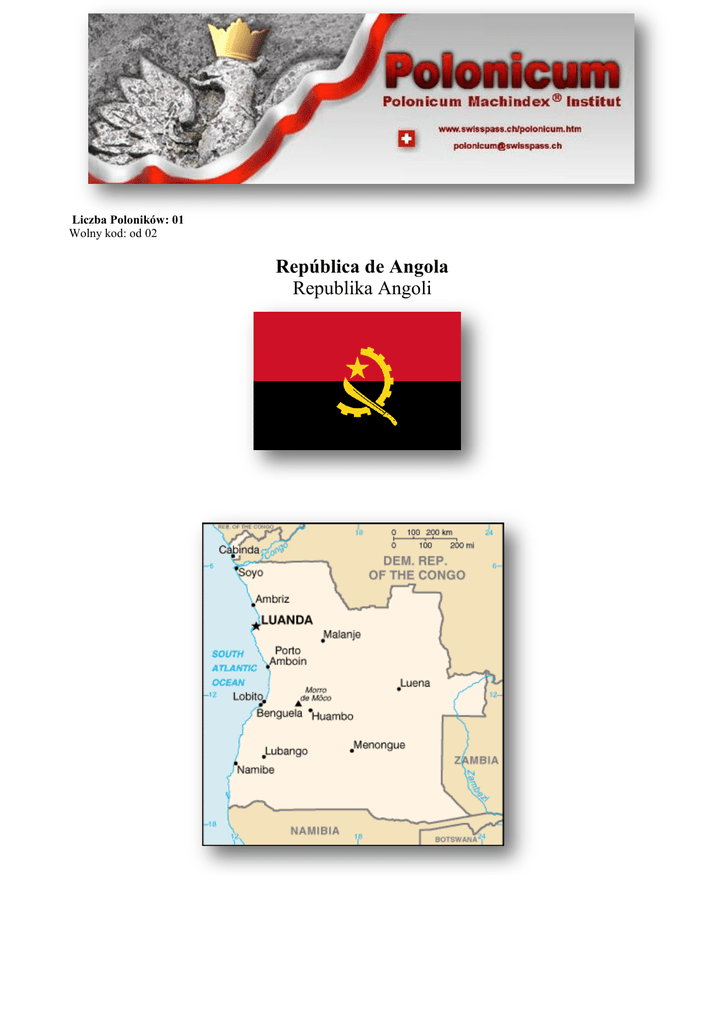 Liczba Poloników: 01 Wolny kod: od 02 República de Angola Republika Angoli Polskie znaki pamięci w Angoli Machindex ANG01 Miejscowość Luanda Poświęcony Marcelino Norberto Rudzki Forma Grób 1948 Zebrał: Jasiński Wojciech/Polska/ 11.2006 : ANG01 att. 25 Tous les droits d'auteur de cette publication sont réservés à Polonicum Machindex® Institut. Les textes sur support électronique sont soumis aux mêmes règles que les textes imprimés. Warunki współpracy: Osoba dokonująca zgłoszenia Polonika wyraża tym samym zgodę na nieodpłatne wykorzystanie podanych informacji, fotografii i innych dokumentów przez Polonicum MACHindex ® Institut w opracowaniach drukowanych, internetowych, CD-ROM jak i wszelkich innych formach dyfuzji dot. Poloników. © COPYRIGHT Polonicum Machindex ® Institut case postale 1182 CH-1701 Fribourg, Szwajcaria [email protected] [email protected] www.swisspass.ch/polonicum.htm Edyta & Stan MACH 06.03.2010