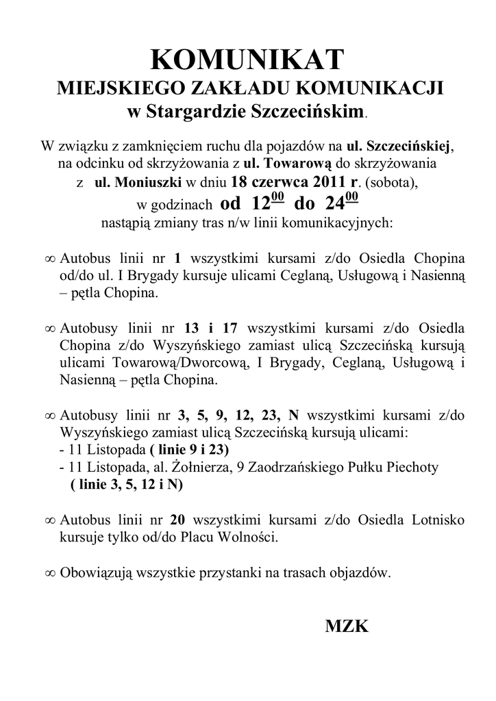 KOMUNIKAT MIEJSKIEGO ZAKŁADU KOMUNIKACJI w Stargardzie Szczecińskim. W związku z zamknięciem ruchu dla pojazdów na ul. Szczecińskiej, na odcinku od skrzyżowania z ul. Towarową do skrzyżowania z ul. Moniuszki w dniu 18 czerwca 2011 r. (sobota), 00 w godzinach od 12 do 2400 nastąpią zmiany tras n/w linii komunikacyjnych: • Autobus linii nr 1 wszystkimi kursami z/do Osiedla Chopina od/do ul. I Brygady kursuje ulicami Ceglaną, Usługową i Nasienną – pętla Chopina. • Autobusy linii nr 13 i 17 wszystkimi kursami z/do Osiedla Chopina z/do Wyszyńskiego zamiast ulicą Szczecińską kursują ulicami Towarową/Dworcową, I Brygady, Ceglaną, Usługową i Nasienną – pętla Chopina. • Autobusy linii nr 3, 5, 9, 12, 23, N wszystkimi kursami z/do Wyszyńskiego zamiast ulicą Szczecińską kursują ulicami: - 11 Listopada ( linie 9 i 23) - 11 Listopada, al. Żołnierza, 9 Zaodrzańskiego Pułku Piechoty ( linie 3, 5, 12 i N) • Autobus linii nr 20 wszystkimi kursami z/do Osiedla Lotnisko kursuje tylko od/do Placu Wolności. • Obowiązują wszystkie przystanki na trasach objazdów. MZK