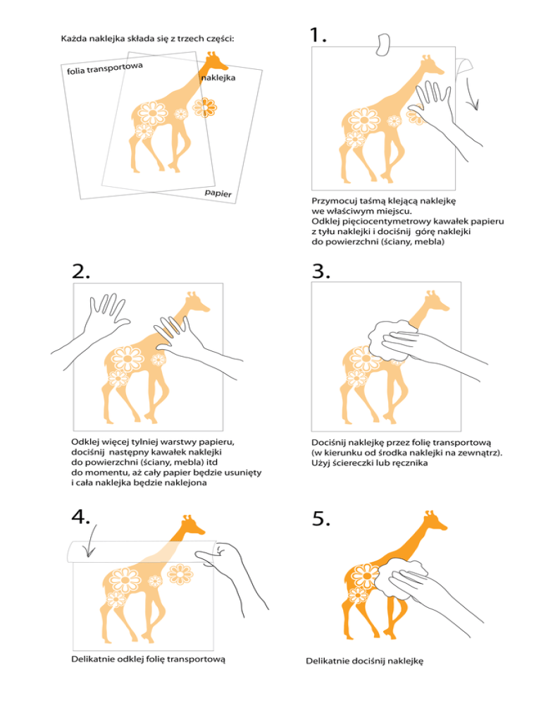 Każda naklejka składa się z trzech części: a w o t r o p s n a tra foli 1. naklejka papier Przymocuj taśmą klejącą naklejkę we właściwym miejscu. Odklej pięciocentymetrowy kawałek papieru z tyłu naklejki i dociśnij górę naklejki do powierzchni (ściany, mebla) 2. 3. Odklej więcej tylniej warstwy papieru, dociśnij następny kawałek naklejki do powierzchni (ściany, mebla) itd do momentu, aż cały papier będzie usunięty i cała naklejka będzie naklejona Dociśnij naklejkę przez folię transportową (w kierunku od środka naklejki na zewnątrz). Użyj ściereczki lub ręcznika 4. 5. Delikatnie odklej folię transportową Delikatnie dociśnij naklejkę