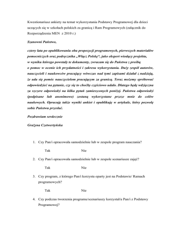 Kwestionariusz ankiety na temat wykorzystania Podstawy Programowej dla dzieci uczących się w szkołach polskich za granicą i Ram Programowych (załącznik do Rozporządzenia MEN z 2010 r.) Szanowni Państwo, cztery lata po opublikowaniu obu propozycji programowych, pierwszych materiałów pomocniczych oraz podręcznika „Włącz Polskę“, jako ekspert wiodący projektu, w wyniku którego powstały te dokumenty, zwracam się do Państwa z prośbą o pomoc w ocenie ich przydatności i zakresu wykorzystania. Duży zespół autorów, nauczycieli i naukowców pracujący wówczas nad tymi zapisami działał z nadzieją, że uda się pomóc nauczycielom pracującym za granicą. Teraz możemy spróbować odpowiedzieć na pytanie, czy się to choćby częściowo udało. Dlatego będę wdzięczna za szczere odpowiedzi na kilka pytań zamieszconych poniżej. Państwa odpowiedzi (podpisane lub anonimowe) zostaną wykorzystane przeze mnie do celów naukowych. Opracuję także wyniki ankiet i opublikuję w artykule, który pozwolę sobie Państwu przesłać. Pozdrawiam serdecznie Grażyna Czetwertyńska 1. Czy Pan/i opracowała samodzielnie lub w zespole program nauczania? Tak Nie 2. Czy Pan/i opracowała samodzielnie lub w zespole scenariusze zajęć? Tak Nie 3. Czy program, z którego Pan/i korzysta oparty jest na Podstawie/ Ramach programowych? Tak Nie 4. Czy podczas tworzenia programu/scenariuszy korzystał/a Pan/i z Podstawy Programowej? Tak Nie 5. Czy podczas tworzenia programu/scenariuszy korzystał/a Pan/i z Ram Programowych? Tak Nie 6. Czy Podstawa/Ramy były inspiracją i były wykorzystywane przy podejmowaiu decyzji o doborze treści w programie? Tak Nie 7. Czy Podstawa/Ramy były inspiracją i były wykorzystywane przy podejmowaiu decyzji o doborze lektur dla uczniów? Tak Nie 8. Czy opisy efektów kształcenia w Podstawie/Ramach były przydatne do formułowania celów nauczania? Tak Nie 9. Czy opisy efektów kształcenia w Podstawie/Ramach były przydatne do oceny osiągnięć Pani/Pana uczniów? Tak Nie 10. Które elementy Podstawy/Ram uważa Pan/i za szczególnie przydatne? ....................................................................................................................... ....................................................................................................................... ....................................................................................................................... ....................................................................................................................... 11. Które elementy Podstawy/Ram uważa Pan/i za trudne do wykorzystania lub nieprzydatne? ....................................................................................................................... ....................................................................................................................... ....................................................................................................................... ....................................................................................................................... 12. Czy kiedykolwiek korzystał/a Pan/i z podręcznika „Włącz Polskę“ Tak Nie 13. Czy uczestniczył/a Pan/i w szkoleniach z zakresu Podstawy/Ram Programowych? Tak Nie 14. Czy uczestniczył/a Pan/i w szkoleniach z zakresu wykorzystania podręcznika „Włącz Polskę“? Tak Nie Proszę podzielić się własnymi przemyśleniami na temat wskazanych powyżej propozycji programowych, sformułować ocenę ich użyteczności oraz ewentualnie podpowiedzieć, w jaki sposób je poprawić. .......................................................................................................................................... .......................................................................................................................................... .......................................................................................................................................... .......................................................................................................................................... .......................................................................................................................................... .......................................................................................................................................... Bardzo dziękuję za poświęcenie czasu na wypełnienie ankiety i przesłanie jej pod adresem: [email protected]