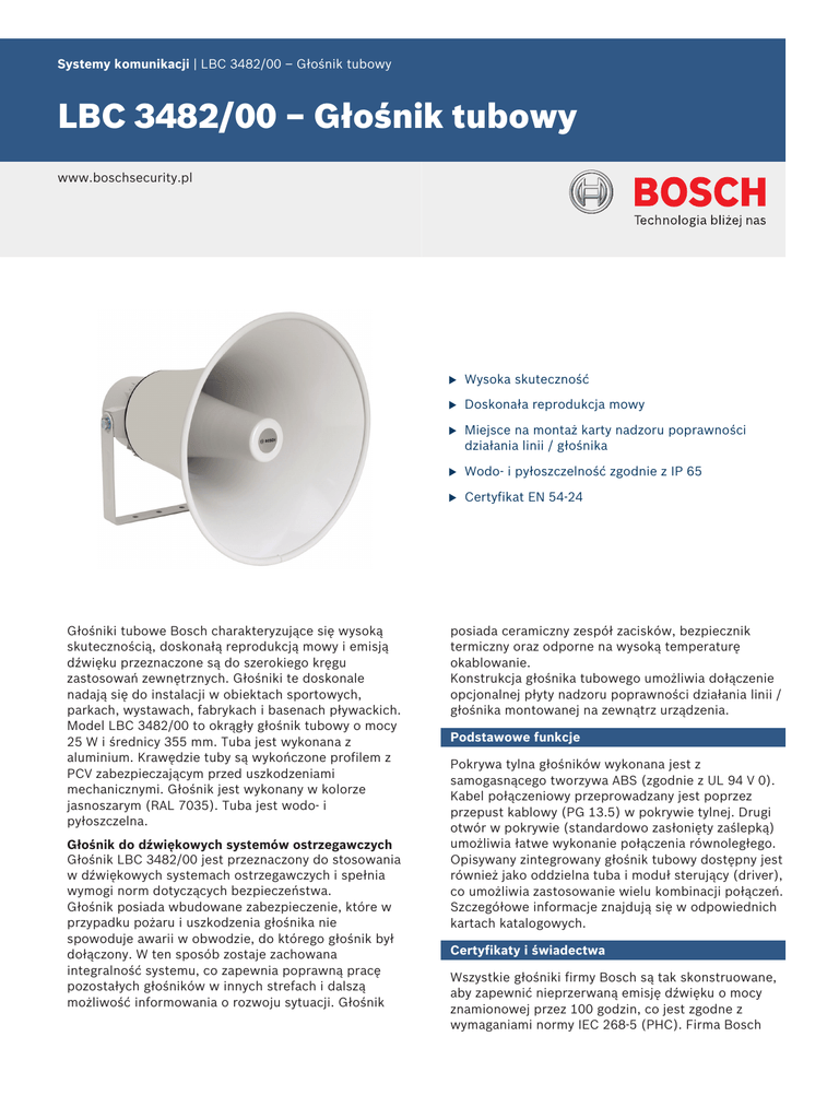 Systemy komunikacji | LBC 3482/00 – Głośnik tubowy LBC 3482/00 – Głośnik tubowy www.boschsecurity.pl Głośniki tubowe Bosch charakteryzujące się wysoką skutecznością, doskonałą reprodukcją mowy i emisją dźwięku przeznaczone są do szerokiego kręgu zastosowań zewnętrznych. Głośniki te doskonale nadają się do instalacji w obiektach sportowych, parkach, wystawach, fabrykach i basenach pływackich. Model LBC 3482/00 to okrągły głośnik tubowy o mocy 25 W i średnicy 355 mm. Tuba jest wykonana z aluminium. Krawędzie tuby są wykończone profilem z PCV zabezpieczającym przed uszkodzeniami mechanicznymi. Głośnik jest wykonany w kolorze jasnoszarym (RAL 7035). Tuba jest wodo- i pyłoszczelna. Głośnik do dźwiękowych systemów ostrzegawczych Głośnik LBC 3482/00 jest przeznaczony do stosowania w dźwiękowych systemach ostrzegawczych i spełnia wymogi norm dotyczących bezpieczeństwa. Głośnik posiada wbudowane zabezpieczenie, które w przypadku pożaru i uszkodzenia głośnika nie spowoduje awarii w obwodzie, do którego głośnik był dołączony. W ten sposób zostaje zachowana integralność systemu, co zapewnia poprawną pracę pozostałych głośników w innych strefach i dalszą możliwość informowania o rozwoju sytuacji. Głośnik u Wysoka skuteczność u Doskonała reprodukcja mowy u Miejsce na montaż karty nadzoru poprawności działania linii / głośnika u Wodo- i pyłoszczelność zgodnie z IP 65 u Certyfikat EN 54‑24 posiada ceramiczny zespół zacisków, bezpiecznik termiczny oraz odporne na wysoką temperaturę okablowanie. Konstrukcja głośnika tubowego umożliwia dołączenie opcjonalnej płyty nadzoru poprawności działania linii / głośnika montowanej na zewnątrz urządzenia. Podstawowe funkcje Pokrywa tylna głośników wykonana jest z samogasnącego tworzywa ABS (zgodnie z UL 94 V 0). Kabel połączeniowy przeprowadzany jest poprzez przepust kablowy (PG 13.5) w pokrywie tylnej. Drugi otwór w pokrywie (standardowo zasłonięty zaślepką) umożliwia łatwe wykonanie połączenia równoległego. Opisywany zintegrowany głośnik tubowy dostępny jest również jako oddzielna tuba i moduł sterujący (driver), co umożliwia zastosowanie wielu kombinacji połączeń. Szczegółowe informacje znajdują się w odpowiednich kartach katalogowych. Certyfikaty i świadectwa Wszystkie głośniki firmy Bosch są tak skonstruowane, aby zapewnić nieprzerwaną emisję dźwięku o mocy znamionowej przez 100 godzin, co jest zgodne z wymaganiami normy IEC 268-5 (PHC). Firma Bosch 2 | LBC 3482/00 – Głośnik tubowy opracowała specjalny test symulujący wystąpienie dodatniego sprzężenia akustycznego (SAFE – Simulated Acoustical Feedback Exposure), aby pokazać, że jej głośniki są w stanie emitować bez uszkodzenia przez krótki czas moc dwa razy większą od ich mocy znamionowej. Zapewnia to niezawodność działania nawet w warunkach ekstremalnych, co daje większe zadowolenie klienta, dłuższy czas życia urządzenia i o wiele mniejsze prawdopodobieństwo uszkodzenia lub obniżenia jakości reprodukowanego dźwięku podczas eksploatacji. 204.0 8.0 102.0 4.0 3.0 0.12 51.0 2.0 51.0 2.0 37.0 18.5 1.45 0.73 mm in 10.8 x 3.0 0.43 x 0.12 Standardy bezpieczeństwa Zgodnie z EN 60065 Odporność na wodę i kurz Zgodnie z IEC 60529, IP 65 Ostrzeganie Zgodnie z EN 54‑24 / BS 5839‑8 / EN 60849 Siła wiatru Zgodnie z NEN 6702: 2007 + A1: 2008, Bft11 Wymiary wspornika 0 1 16 Ω 1/2 Region Certyfikacja Europa CPR 1/4 EU_CPR Schemat połączeń CE CE EU_DOP 10dB Prosta regulacja mocy wyjściowej Głośniki tubowe wyposażone są w 3-stykowy zespół zacisków śrubowych (łącznie z uziemieniem). Posiadają one również 3 odczepy na uzwojeniu pierwotnym transformatora dopasowującego, które umożliwiają uzyskanie odpowiednio maksimum, połowy i jednej czwartej mocy znamionowej głośnika (w krokach co 3 dB). Montaż Głośniki tubowe są dostarczane wraz z wytrzymałymi wspornikami montażowymi umożliwiającymi takie umocowanie głośnika, że emitowana wiązka dźwięku będzie skierowana w żądanym kierunku. SPL(dB) Planowanie 90 31.5 63 250 500 1000 125 2k 4k 8k 16k Frequency (Hz) Pasmo przenoszenia 0˚ 0˚ 0 30˚ 30˚ -10 60˚ 60˚ -20 90˚ 90˚ -20 120˚ 120˚ -10 150˚ mm in 37 1.45 250 Hz Wymiary w mm 150˚ 0 180˚ 500 Hz 1000 Hz 180˚ 2000 Hz 4000 Hz 8000 Hz 3 | LBC 3482/00 – Głośnik tubowy Charakterystyka kierunkowości (pomiar szumem różowym) Czułość pasma oktawowego* Dołączone części Ilość Element 1 Głośnik tubowy LBC 3482/00 1 Przepust kablowy PG 13.5 (zamocowany) SPL pasma oktawowego 1W/1m Całkowite SPL pasma oktawowego 1W/1m Całkowite SPL pasma oktawowego Pmax / 1 m 125 Hz 60,1 - - Moc maksymalna 37,5 W 250 Hz 86,6 - - Moc znamionowa 25 / 12,5 / 6,25 W 500 Hz 100,2 - - 106,9 - - Poziom ciśnienia akustycznego przy mocy 25 W / 1 W (1 kHz, 1 m) 121 dB / 107 dB (SPL) 1000 Hz 2000 Hz 104,1 99,4 - - Efektywne pasmo przenoszenia (-10 dB) 550 Hz – 5 kHz 4000 Hz 8000 Hz 87,8 - - 70° / 25° A-ważone - 100,1 113,0 Kąt promieniowania przy 1 kHz / 4 kHz (-6 dB) Lin-ważone - 99,8 111,8 Napięcie znamionowe 100 V Impedancja znamionowa 400 Ω Złącze Zespół zacisków śrubowych Kąty promieniowania pasma oktawowego Dane techniczne Parametry elektryczne* W poziomie W pionie * Parametry techniczne zgodnie z IEC 60268-5 125 Hz - - Parametry mechaniczne 250 Hz 360 360 425 x 355 mm 500 Hz 120 120 Wymiary (wys. x maks. średnica) 1000 Hz 75 75 Ciężar 3,6 kg 2000 Hz 43 43 Kolor Jasny szary (RAL 7035) 4000 Hz 25 25 Średnica kabla 6 mm ÷ 12 mm 8000 Hz 22 22 Tabela parametrów odniesienia • (wszystkie pomiary wykonywane są sygnałem szumu różowego; wartości podawane w dBSPL) Parametry środowiskowe Temperatura pracy -25°C ÷ +55°C Temperatura przechowywania -40°C ÷ +70°C Wilgotność względna <95% Pozostałe parametry są dostępne w raporcie z testu CNBOP nr 4786/BA/10. Określona aktywna korekcja, wyma