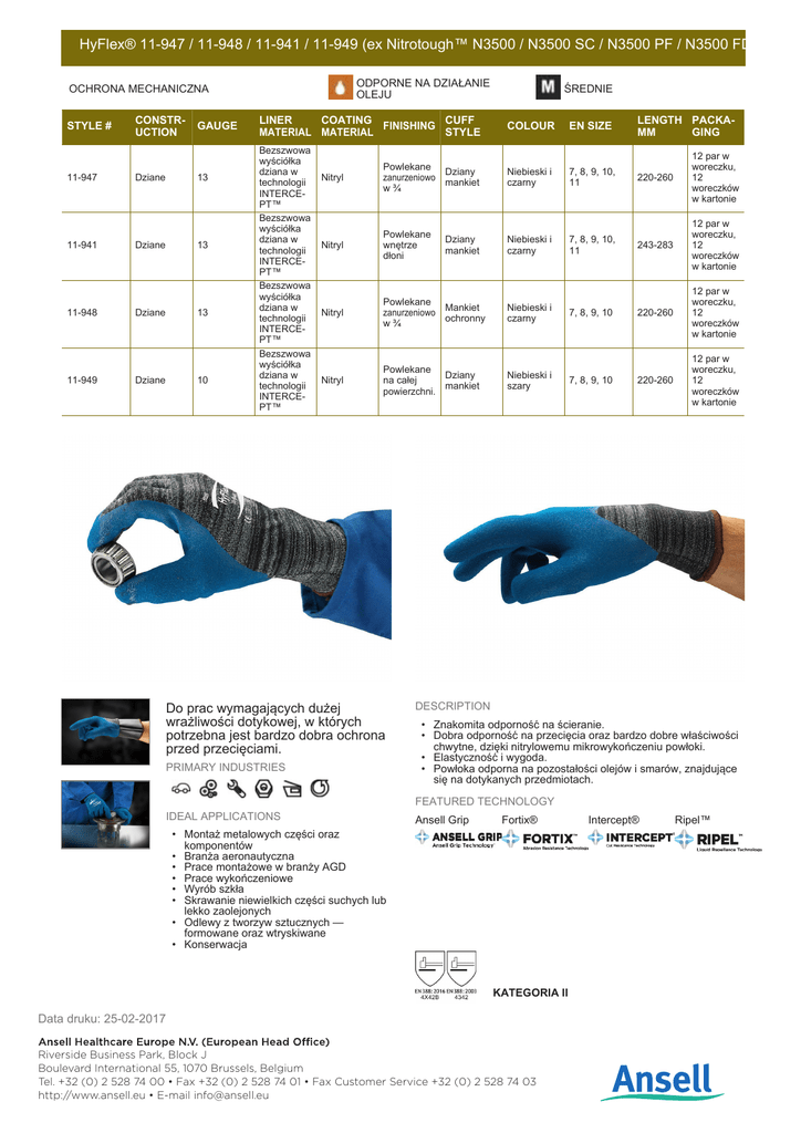 HyFlex® 11-947 / 11-948 / 11-941 / 11-949 (ex Nitrotough™ N3500 / N3500 SC / N3500 PF / N3500 FD) ODPORNE NA DZIAŁANIE OLEJU OCHRONA MECHANICZNA STYLE # CONSTRUCTION GAUGE 11-947 Dziane 13 11-941 Dziane 13 11-948 Dziane 13 11-949 Dziane 10 LINER COATING CUFF FINISHING MATERIAL MATERIAL STYLE Bezszwowa wyściółka dziana w technologii INTERCEPT™ Bezszwowa wyściółka dziana w technologii INTERCEPT™ Bezszwowa wyściółka dziana w technologii INTERCEPT™ Bezszwowa wyściółka dziana w technologii INTERCEPT™ ŚREDNIE LENGTH PACKAMM GING COLOUR EN SIZE Nitryl Powlekane Dziany zanurzeniowo mankiet w¾ Niebieski i czarny 7, 8, 9, 10, 11 220-260 12 par w woreczku, 12 woreczków w kartonie Nitryl Powlekane wnętrze dłoni Niebieski i czarny 7, 8, 9, 10, 11 243-283 12 par w woreczku, 12 woreczków w kartonie Nitryl Powlekane Mankiet zanurzeniowo ochronny w¾ Niebieski i czarny 7, 8, 9, 10 220-260 12 par w woreczku, 12 woreczków w kartonie Nitryl Powlekane Dziany na całej mankiet powierzchni. Niebieski i szary 7, 8, 9, 10 220-260 12 par w woreczku, 12 woreczków w kartonie Do prac wymagających dużej wrażliwości dotykowej, w których potrzebna jest bardzo dobra ochrona przed przecięciami. PRIMARY INDUSTRIES Dziany mankiet DESCRIPTION • Znakomita odporność na ścieranie. • Dobra odporność na przecięcia oraz bardzo dobre właściwości chwytne, dzięki nitrylowemu mikrowykończeniu powłoki. • Elastyczność i wygoda. • Powłoka odporna na pozostałości olejów i smarów, znajdujące się na dotykanych przedmiotach. FEATURED TECHNOLOGY IDEAL APPLICATIONS Ansell Grip Fortix® • Montaż metalowych części oraz komponentów • Branża aeronautyczna • Prace montażowe w branży AGD • Prace wykończeniowe • Wyrób szkła • Skrawanie niewielkich części suchych lub lekko zaolejonych • Odlewy z tworzyw sztucznych — formowane oraz wtryskiwane • Konserwacja KATEGORIA II Data druku: 25-02-2017 Riverside Business Park, Block J Boulevard International 55, 1070 Brussels, Belgium Tel. +32 (0) 2 528 74 00 • Fax +32 (0) 2 528 74 01 • Fax Customer Service +32 (0) 2 528 74 03 http://www.ansell.eu • E-mail [email protected] Intercept® Ripel™