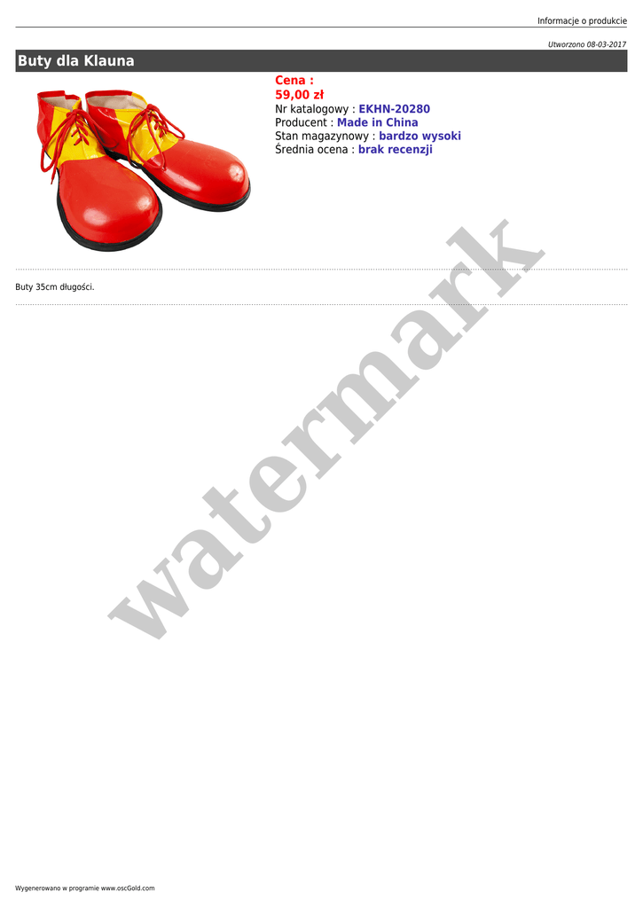 Informacje o produkcie Utworzono 08-03-2017 Buty dla Klauna Cena : 59,00 zł er m ar k Nr katalogowy : EKHN-20280 Producent : Made in China Stan magazynowy : bardzo wysoki Średnia ocena : brak recenzji w at Buty 35cm długości. Wygenerowano w programie www.oscGold.com