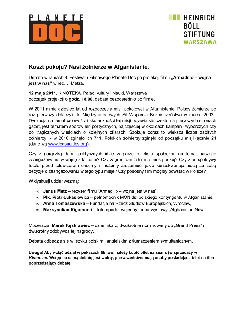 Koszt pokoju? Nasi żołnierze w Afganistanie. Debata w ramach 8. Festiwalu Filmowego Planete Doc po projekcji filmu „Armadillo – wojna jest w nas” w reż. J. Metza. 12 maja 2011, KINOTEKA, Pałac Kultury i Nauki, Warszawa początek projekcji o godz. 18.00, debata bezpośrednio po filmie. W 2011 minie dziesięć lat od rozpoczęcia misji pokojowej w Afganistanie. Polscy żołnierze po raz pierwszy dołączyli do Międzynarodowych Sił Wsparcia Bezpieczeństwa w marcu 2002r. Dyskusja na temat celowości i skuteczności tej misji pojawia się często na pierwszych stronach gazet, jest tematem sporów elit politycznych, najczęściej w okolicach kampanii wyborczych czy po tragicznych wieściach o kolejnych ofiarach. Szokuje coraz to większa liczba zabitych żołnierzy - w 2010 zginęło ich 711. Polskich żołnierzy zginęło od początku misji łącznie 24 (dane wg www.icasualties.org). Czy z gorączką debat politycznych idzie w parze refleksja społeczna na temat naszego zaangażowania w wojnę z talibami? Czy zagraniczni żołnierze niosą pokój? Czy z perspektywy fotela przed telewizorem chcemy i możemy zrozumieć, jakie konsekwencje niosą za sobą decyzje o zaangażowaniu w tego typu misje? Czy podobny film mógłby powstać w Polsce? W dyskusji udział wezmą: • • • • Janus Metz – reżyser filmu “Armadillo – wojna jest w nas”, Płk. Piotr Łukasiewicz – pełnomocnik MON ds. polskiego kontyngentu w Afganistanie, Anna Tomaszewska – Fundacja na Rzecz Studiów Europejskich, Wrocław, Maksymilian Rigamonti – fotoreporter wojenny, autor wystawy „Afghanistan Now!” Moderacja: Marek Kęskrawiec – dziennikarz, dwukrotnie nominowany do „Grand Press” i dwukrotny zdobywca tej nagrody. Debata odbędzie się w języku polskim i angielskim z tłumaczeniem symultanicznym. Uwaga! Aby wziąć udział w pokazach filmów, należy kupić bilet na seans (w sprzedaży w Kinotece). Wstęp na samą debatę jest wolny, pierwszeństwo mają osoby posiadające bilet na film poprzedzający debatę.