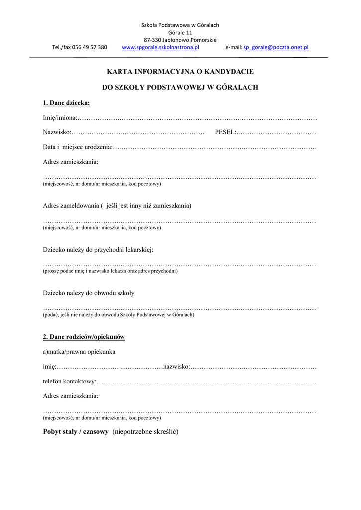 Tel./fax 056 49 57 380 Szkoła Podstawowa w Góralach Górale 11 87-330 Jabłonowo Pomorskie www.spgorale.szkolnastrona.pl e-mail: [email protected] KARTA INFORMACYJNA O KANDYDACIE DO SZKOŁY PODSTAWOWEJ W GÓRALACH 1. Dane dziecka: Imię/imiona:……………………………………………………………………………………………… Nazwisko:…………………………………………………… PESEL:……………………………… Data i miejsce urodzenia:……………………………………………………………………………….. Adres zamieszkania: …………………………………………………………………………………………………………… (miejscowość, nr domu/nr mieszkania, kod pocztowy) Adres zameldowania ( jeśli jest inny niż zamieszkania) …………………………………………………………………………………………………………… (miejscowość, nr domu/nr mieszkania, kod pocztowy) Dziecko należy do przychodni lekarskiej: …………………………………………………………………………………………………………… (proszę podać imię i nazwisko lekarza oraz adres przychodni) Dziecko należy do obwodu szkoły …………………………………………………………………………………………………………… (podać, jeśli nie należy do obwodu Szkoły Podstawowej w Góralach) 2. Dane rodziców/opiekunów a)matka/prawna opiekunka imię:…………………………………………nazwisko:………………………………………………… telefon kontaktowy:……………………………………………………………………………………… Adres zamieszkania: …………………………………………………………………………………………………………… (miejscowość, nr domu/nr mieszkania, kod pocztowy) Pobyt stały / czasowy (niepotrzebne skreślić) Tel./fax 056 49 57 380 Szkoła Podstawowa w Góralach Górale 11 87-330 Jabłonowo Pomorskie www.spgorale.szkolnastrona.pl e-mail: [email protected] Adres zameldowania ( gdy jest inny niż zamieszkania) …………………………………………………………………………………………………………… (miejscowość, nr domu/nr mieszkania, kod pocztowy) b) ojciec/prawny opiekun: imię:………………………………………………nazwisko:…………………………………………… telefon kontaktowy:……………………………………………………………………………………… Adres zamieszkania: …………………………………………………………………………………………………………… (miejscowość, nr domu/nr mieszkania, kod pocztowy) Pobyt stały / czasowy (niepotrzebne skreślić) Adres zameldowania( gdy jest inny niż zamieszkania) …………………………………………………………………………………………………………… (miejscowość, nr domu/nr mieszkania, kod pocztowy) Dziecko ze szkoły/ autobusu odbierać będą: 1)………………………………………………………………………………………………………… 2)………………………………………………………………………………………………………… Wyrażam zgodę na objęcie mojego dziecka badaniami profilaktycznymi prowadzonymi przez pielęgniarkę szkolną. Oświadczam, że dane przedłożone w niniejszym podaniu są zgodne ze stanem faktycznym. Niniejszym przyjmuję do wiadomości i wyrażam zgodę na przetwarzanie danych osobowych zawartych w niniejszym podaniu w celach przeprowadzenia procesu rekrutacji. Nadto wyrażam zgodę na przetwarzanie tych danych przez szkołę, organ założycielski i organy uprawnione do nadzoru nad jednostkami oświatowymi w zakresie związanym z procesem kształcenia. Przetwarzanie tych danych odbywać się będzie zgodnie z ustawą o ochronie danych osobowych (Dz. U z 1997r. nr 133, poz., 833) Wyrażam zgodę na publikację wizerunku mojego dziecka i jego prac konkursowych w celach promocji szkoły i jej uczniów na stronie internetowej szkoły oraz lokalnych portalach i w prasie. Proszę o naukę religii dla mojego dziecka ( skreślić w przypadku braku woli uczestnictwa w nauce religii) …………………………………… (miejscowość, data) …………………………………………………………………. (podpisy rodziców/opiekunów prawnych) Tel./fax 056 49 57 380 Szkoła Podstawowa w Góralach Górale 11 87-330 Jabłonowo Pomorskie www.spgorale.szkolnastrona.pl e-mail: [email protected] KARTA INFORMACYJNA O KANDYDACIE DO ODDZIAŁU ZEROWEGO PRZY SZKOLE PODSTAWOWEJ W GÓRALACH 1. Dane dziecka: Imię/imiona:……………………………………………………………………………………………… Nazwisko:…………………………………………………… PESEL:………………………………... Data i miejsce urodzenia:……………………………………………………………………………….. Adres zamieszkania: …………………………………………………………………………………………………………… (miejscowość, nr domu/nr mieszkania, kod pocztowy) Adres zameldowania ( jeśli jest inny niż zamieszkania) …………………………………………………………………………………………………………… (miejscowość, nr domu/nr mieszkania, kod pocztowy) Dziecko należy do przychodni lekarskiej: …………………………………………………………………………………………………………… (proszę podać imię i nazwisko lekarza oraz adres przychodni) Dziecko należy do obwodu szkoły …………………………………………………………………………