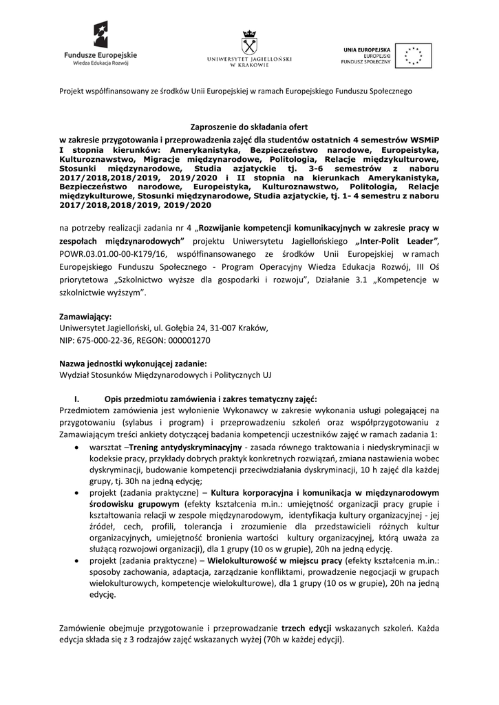 Projekt współfinansowany ze środków Unii Europejskiej w ramach Europejskiego Funduszu Społecznego Zaproszenie do składania ofert w zakresie przygotowania i przeprowadzenia zajęć dla studentów ostatnich 4 semestrów WSMiP I stopnia kierunków: Amerykanistyka, Bezpieczeństwo narodowe, Europeistyka, Kulturoznawstwo, Migracje międzynarodowe, Politologia, Relacje międzykulturowe, Stosunki międzynarodowe, Studia azjatyckie tj. 3-6 semestrów z naboru 2017/2018,2018/2019, 2019/2020 i II stopnia na kierunkach Amerykanistyka, Bezpieczeństwo narodowe, Europeistyka, Kulturoznawstwo, Politologia, Relacje międzykulturowe, Stosunki międzynarodowe, Studia azjatyckie, tj. 1- 4 semestru z naboru 2017/2018,2018/2019, 2019/2020 na potrzeby realizacji zadania nr 4 „Rozwijanie kompetencji komunikacyjnych w zakresie pracy w zespołach międzynarodowych” projektu Uniwersytetu Jagiellońskiego „Inter-Polit Leader”, POWR.03.01.00-00-K179/16, współfinansowanego ze środków Unii Europejskiej w ramach Europejskiego Funduszu Społecznego - Program Operacyjny Wiedza Edukacja Rozwój, III Oś priorytetowa „Szkolnictwo wyższe dla gospodarki i rozwoju”, Działanie 3.1 „Kompetencje w szkolnictwie wyższym”. Zamawiający: Uniwersytet Jagielloński, ul. Gołębia 24, 31-007 Kraków, NIP: 675-000-22-36, REGON: 000001270 Nazwa jednostki wykonującej zadanie: Wydział Stosunków Międzynarodowych i Politycznych UJ I. Opis przedmiotu zamówienia i zakres tematyczny zajęć: Przedmiotem zamówienia jest wyłonienie Wykonawcy w zakresie wykonania usługi polegającej na przygotowaniu (sylabus i program) i przeprowadzeniu szkoleń oraz współprzygotowaniu z Zamawiającym treści ankiety dotyczącej badania kompetencji uczestników zajęć w ramach zadania 1: warsztat –Trening antydyskryminacyjny - zasada równego traktowania i niedyskryminacji w kodeksie pracy, przykłady dobrych praktyk konkretnych rozwiązań, zmiana nastawienia wobec dyskryminacji, budowanie kompetencji przeciwdziałania dyskryminacji, 10 h zajęć dla każdej grupy, tj. 30h na jedną edycję; projekt (zadania praktyczne) – Kultura korporacyjna i komunikacja w międzynarodowym środowisku grupowym (efekty kształcenia m.in.: umiejętność organizacji pracy grupie i kształtowania relacji w zespole międzynarodowym, identyfikacja kultury organizacyjnej - jej źródeł, cech, profili, tolerancja i zrozumienie dla przedstawicieli różnych kultur organizacyjnych, umiejętność bronienia wartości kultury organizacyjnej, którą uważa za służącą rozwojowi organizacji), dla 1 grupy (10 os w grupie), 20h na jedną edycję. projekt (zadania praktyczne) – Wielokulturowość w miejscu pracy (efekty kształcenia m.in.: sposoby zachowania, adaptacja, zarządzanie konfliktami, prowadzenie negocjacji w grupach wielokulturowych, kompetencje wielokulturowe), dla 1 grupy (10 os w grupie), 20h na jedną edycję. Zamówienie obejmuje przygotowanie i przeprowadzanie trzech edycji wskazanych szkoleń. Każda edycja składa się z 3 rodzajów zajęć wskazanych wyżej (70h w każdej edycji). Projekt współfinansowany ze środków Unii Europejskiej w ramach Europejskiego Funduszu Społecznego Warsztaty polegają na aktywizacji studentów, ćwiczeniu umiejętności. Aktywność uczestników kursu powinna wynosić ok. 50-80% czasu trwania zajęć. Projekt (dokładnie: dodatkowe zadania praktyczne dla studentów realizowane w formie projektowej, w tym w ramach zespołów projektowych) - to zajęcia, podczas których studenci w małych grupach próbują rozwiązać dany problem. Celem realizacji zajęć w zad. 2 jest podniesienie kompetencji zawodowych uczestników (tj. studentów ostatnich 4 semestrów WSMiP I stopnia kierunków: Amerykanistyka, Bezpieczeństwo narodowe, Europeistyka, Kulturoznawstwo, Migracje międzynarodowe, Politologia, Relacje międzykulturowe, Stosunki międzynarodowe., Studia azjatyckie tj. 3-6 semestrów z naboru 2017/2018,2018/2019, 2019/2020 i II stopnia na kier. Amerykanistyka, Bezpieczeństwo narodowe, Europeistyka, Kulturoznawstwo, Politologia, Relacje międzykulturowe, Stosunki międzynarodowe, Studia azjatyckie, tj. 1- 4 semestru z naboru 2017/2018,2018/2019, 2019/2020 ), przyszłej pracy, uwarunkowań i specyfiki miejsca umiejętnością komunikacji w grupie wielokulturowej w zakresie warsztatu potencjalnego zatrudnienia związanego z II. Wymagania dla trenerów: wykształcenie wyższe, minimum 2 lata doświadczenia w prowadzeniu zajęć w danej dziedzinie, której dotyczą dane zajęcia (potwierdzone w opisie CV), dobra opinia w środowisku III. Miejsce i sposób składania ofert: Potencjalni oferenci przygotowują: 1. CV z opisem doświadczenia (min. 2 lata) trenera w zakresie realizacji zajęć dotyczących składanej oferty 2. Proponowany zarys zajęć (mini-sylabus, objętość max 10 stron) 3. Określenie formy zaliczenia zajęć przez uczestników – formy testu sprawdzenia umiejętności, które nabyli podczas zajęć 4. Potwierdzenie dobrej opinii w środowisku osoby prowadzącej zajęcia (rekomendacje, opinie uczestników wcześniejszych zajęć, itp.) 5. Oferowaną cenę brutto (cena musi zawierać wszelkie koszty) za godzinę zajęć, przy czym 1 godzina zajęć = 45 min). Możliwe jest składanie ofert częściowych. Oferty można przesyłać pocztą tradycyjną na adres: Instytut Europeistyki, Wydział Studiów Międzynarodowych i Politycznych UJ, ul. Jodłowa 13, Kraków lub on-line w formie scan-pdf z podpisem Oferenta na adres: [email protected] do dnia 30 stycznia 2017 roku, godz. 23:59. IV. Osoba do kontaktu w sprawie oferty: Kinga Gajda, mail: [email protected] V. Terminy wykonania zamówienia: Projekt współfinansowany ze środków Unii Europejskiej w ramach Europejskiego Funduszu Społecznego warsztat – Trening antydyskryminacyjny: 1. edycja kwiecień-czerwiec 2017, 2. edycja kwiecień-czerwiec 2018, 3. edycja kwiecień-czerwiec 2019, projekt (zadania praktyczne) – Kultura ko